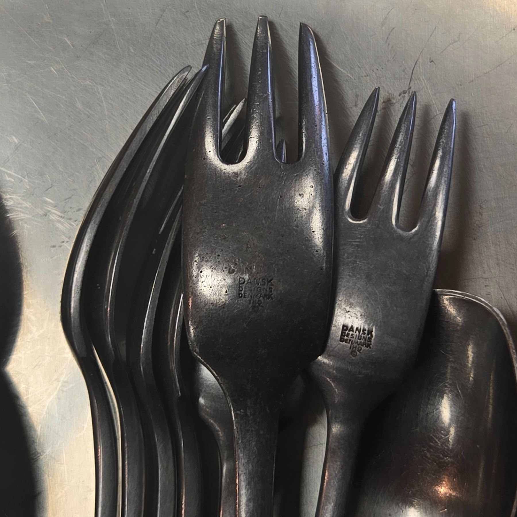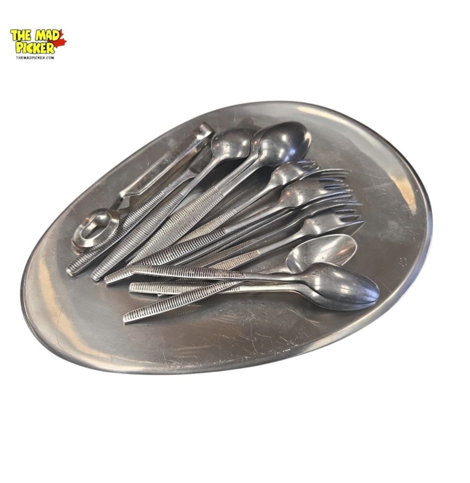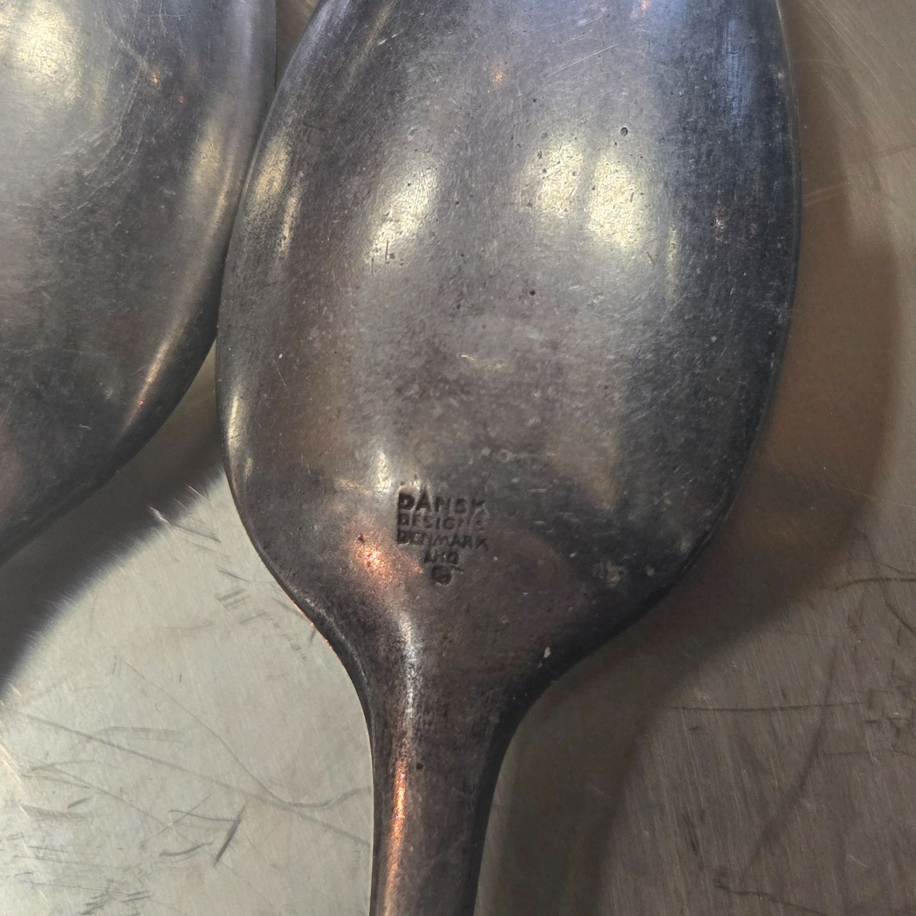 Set includes Dansk Designs cutlery, marked with the company's iconic branding, embodying mid-century modern style, alongside a Voss pewter dish, known for its Scandinavian craftsmanship. Both items showcase clean, minimalist design characteristic of the era and Danish modern aesthetics.