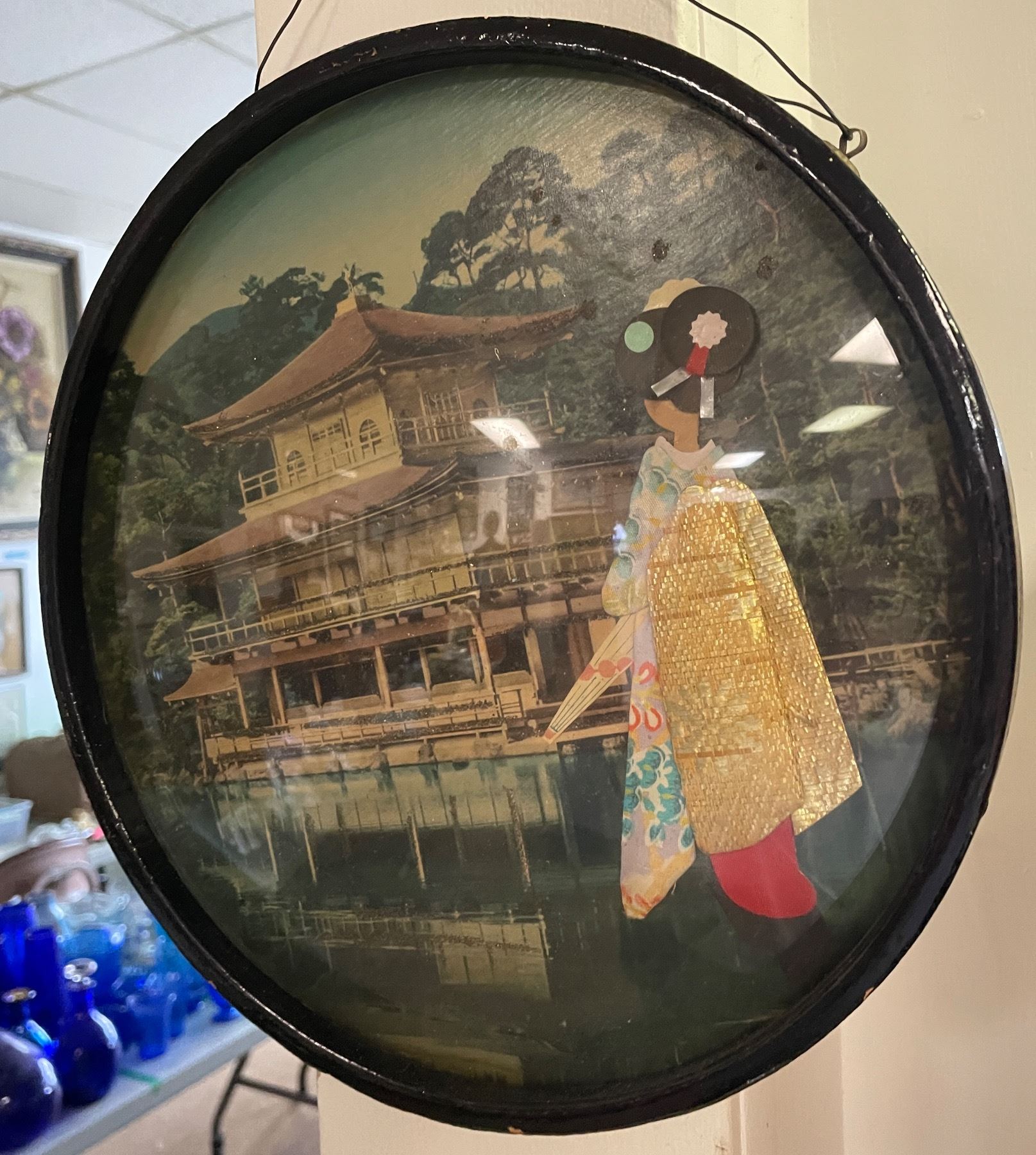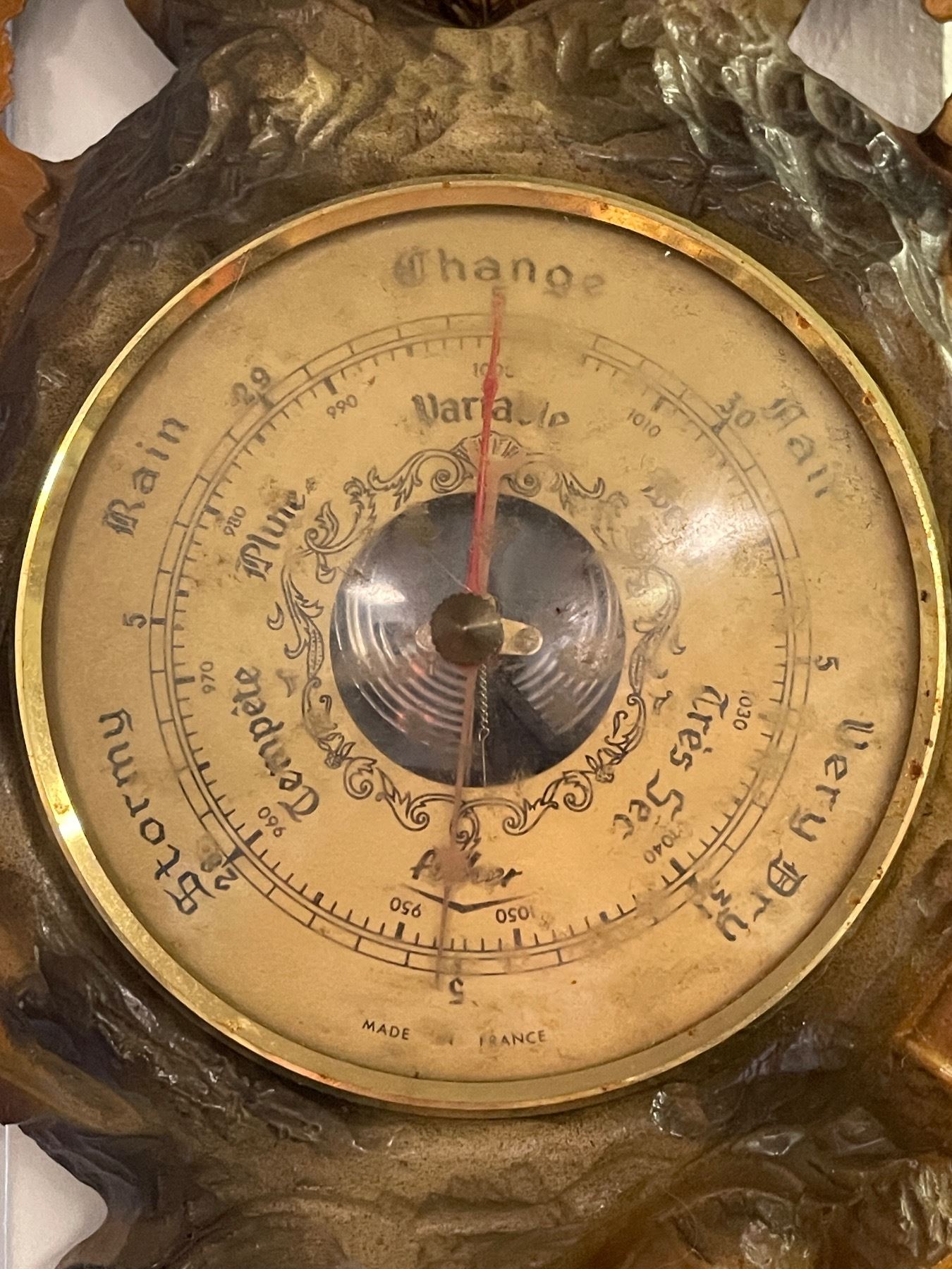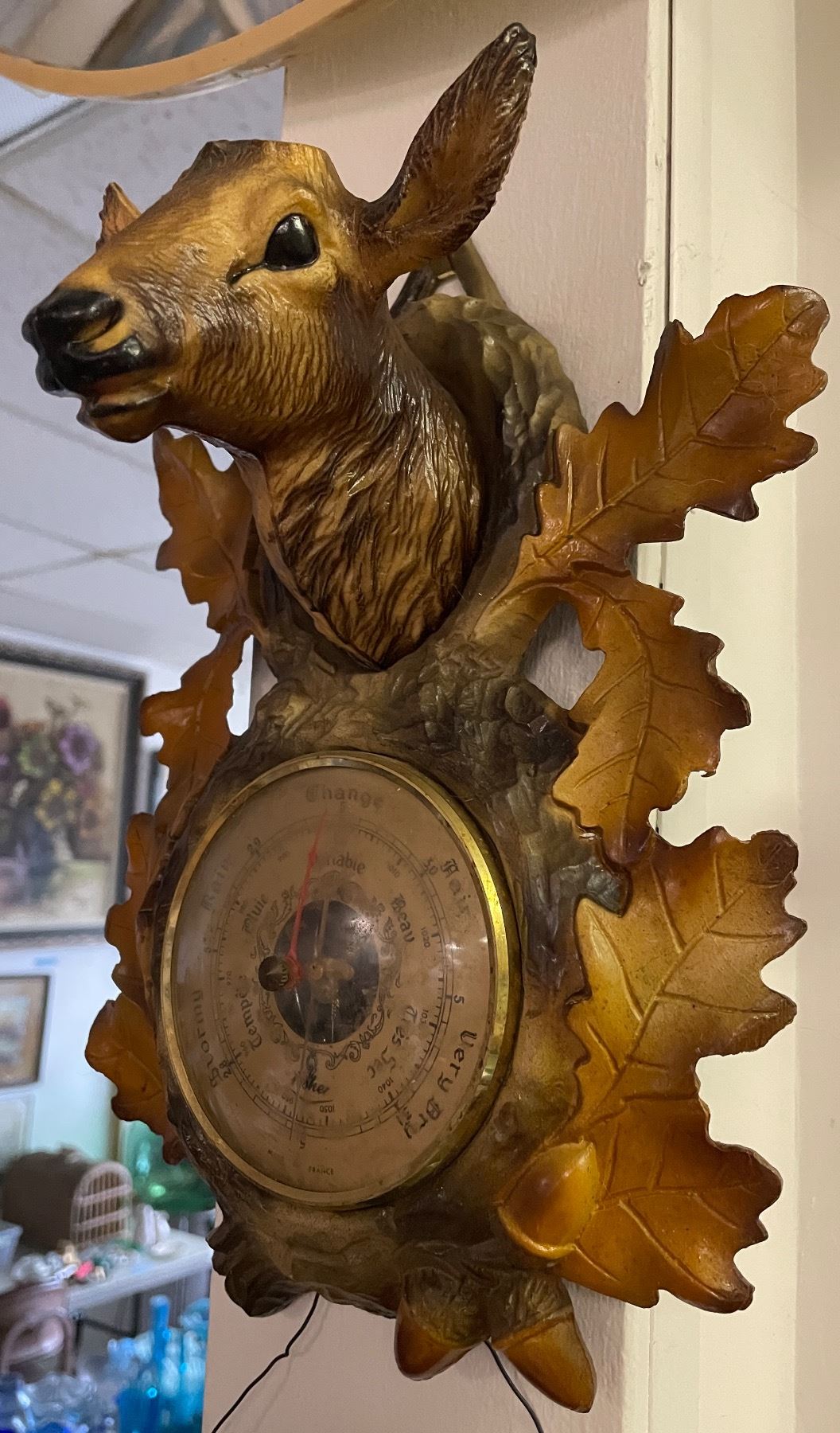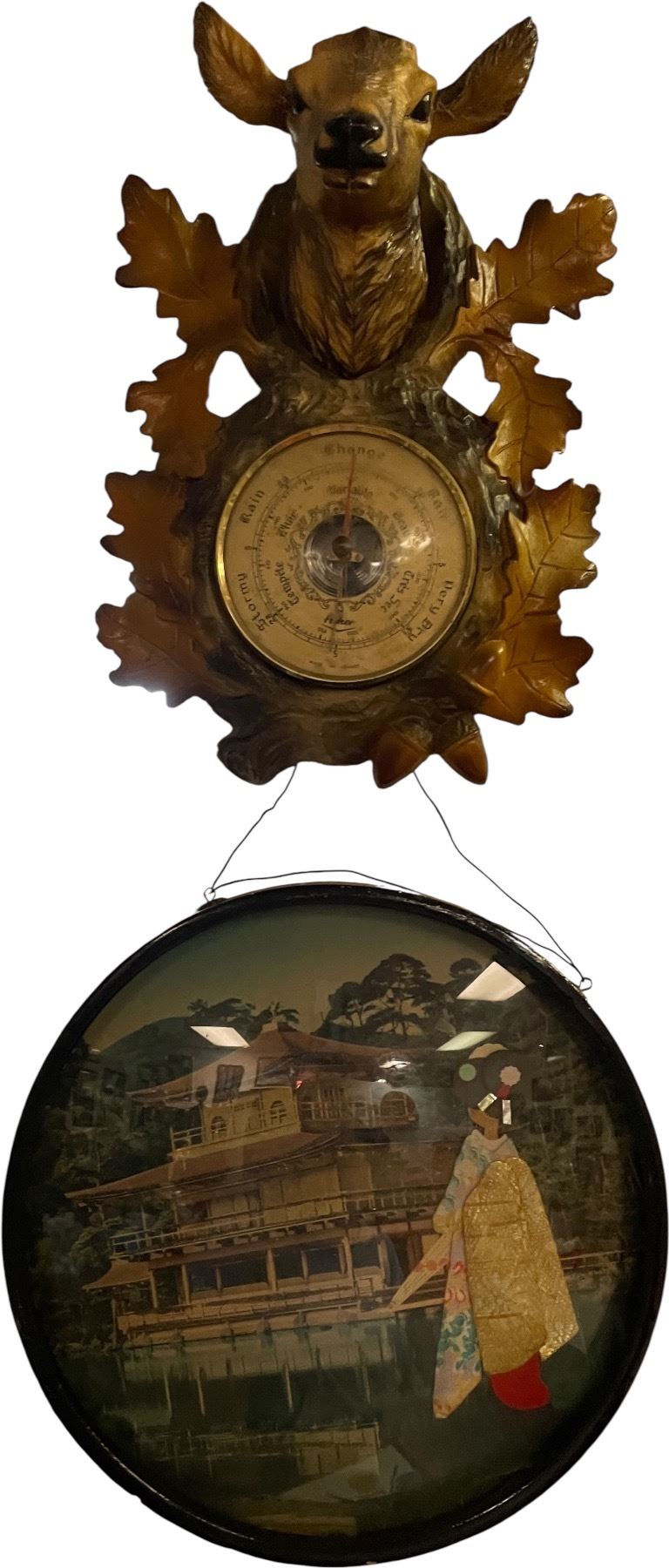 Vintage Deer Motif Wall Barometer with Round Framed Asian Scene Print