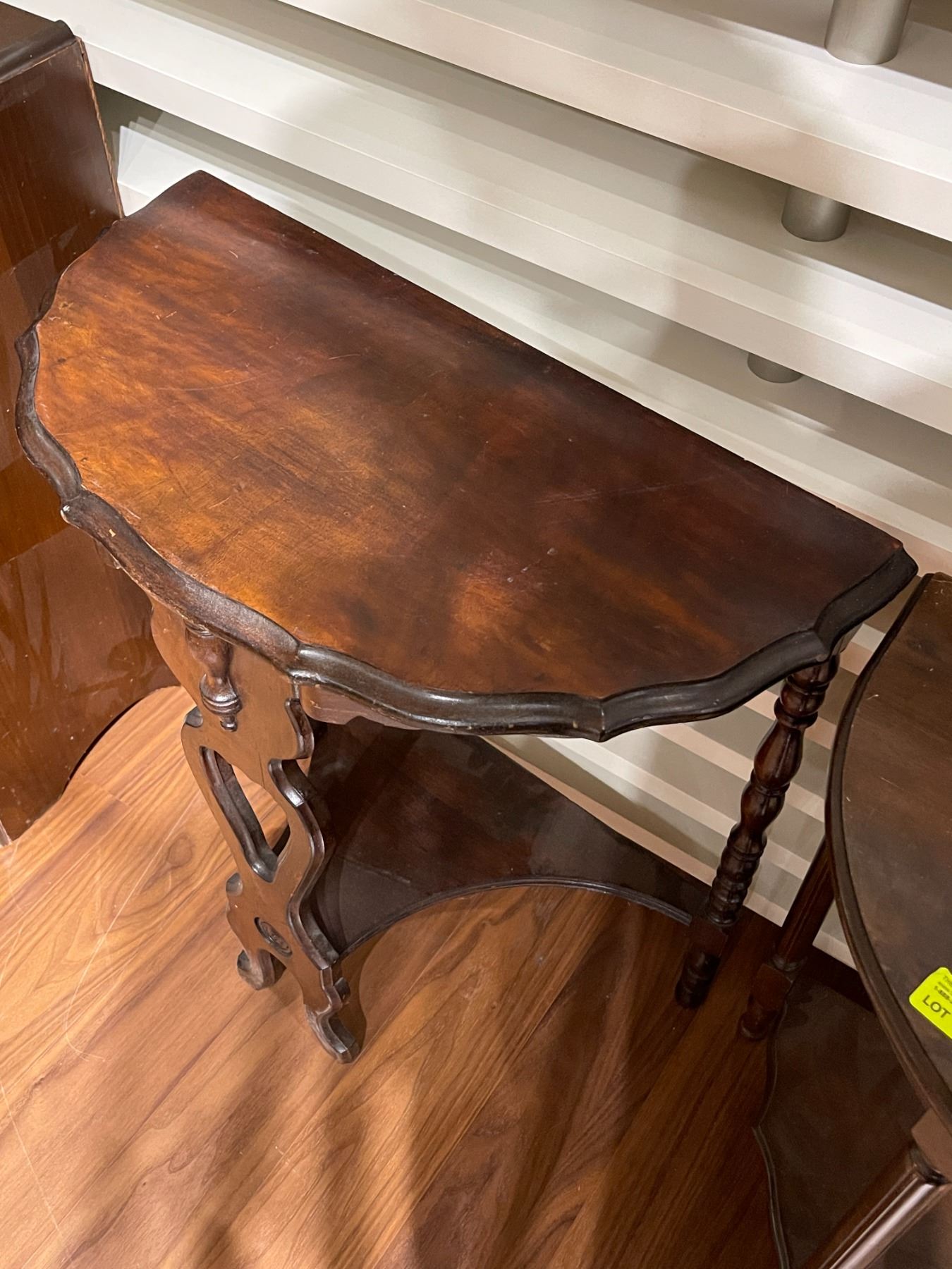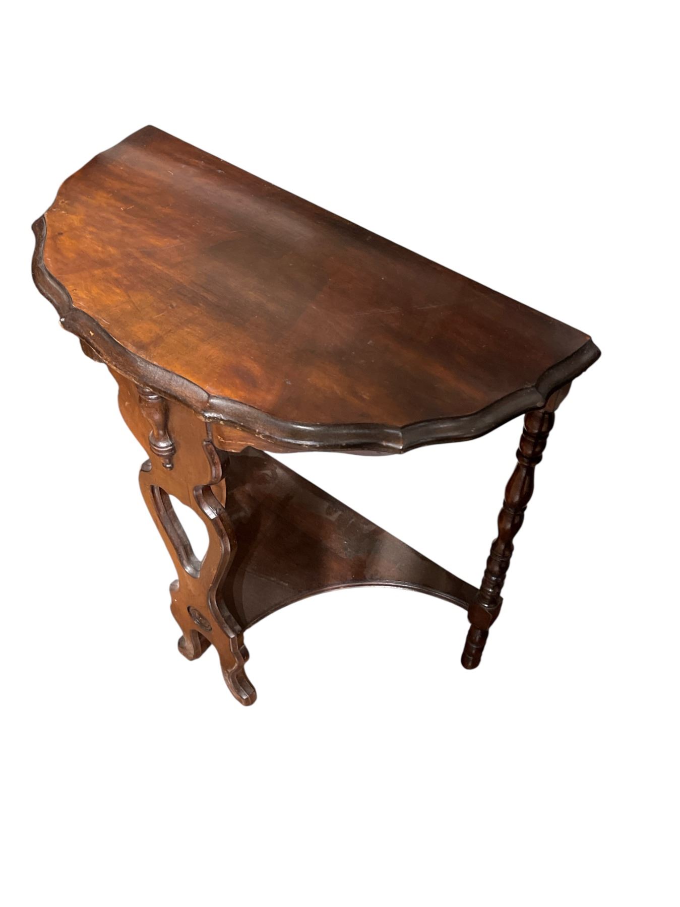 Vintage demilune side table featuring a semi-circular design. Dimensions are 24-Inch length, 12-Inch width, and 24.5-Inch height. Item showcases a classic style suited for a variety of interior decor settings. Item is as pictured.