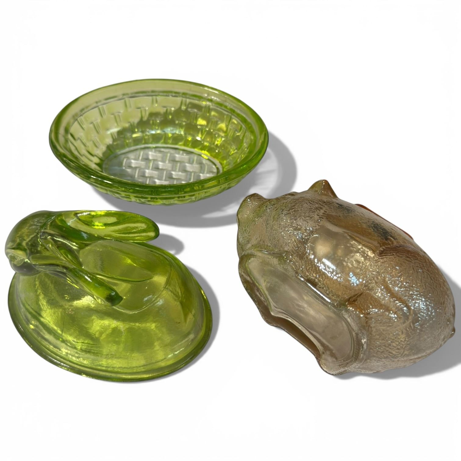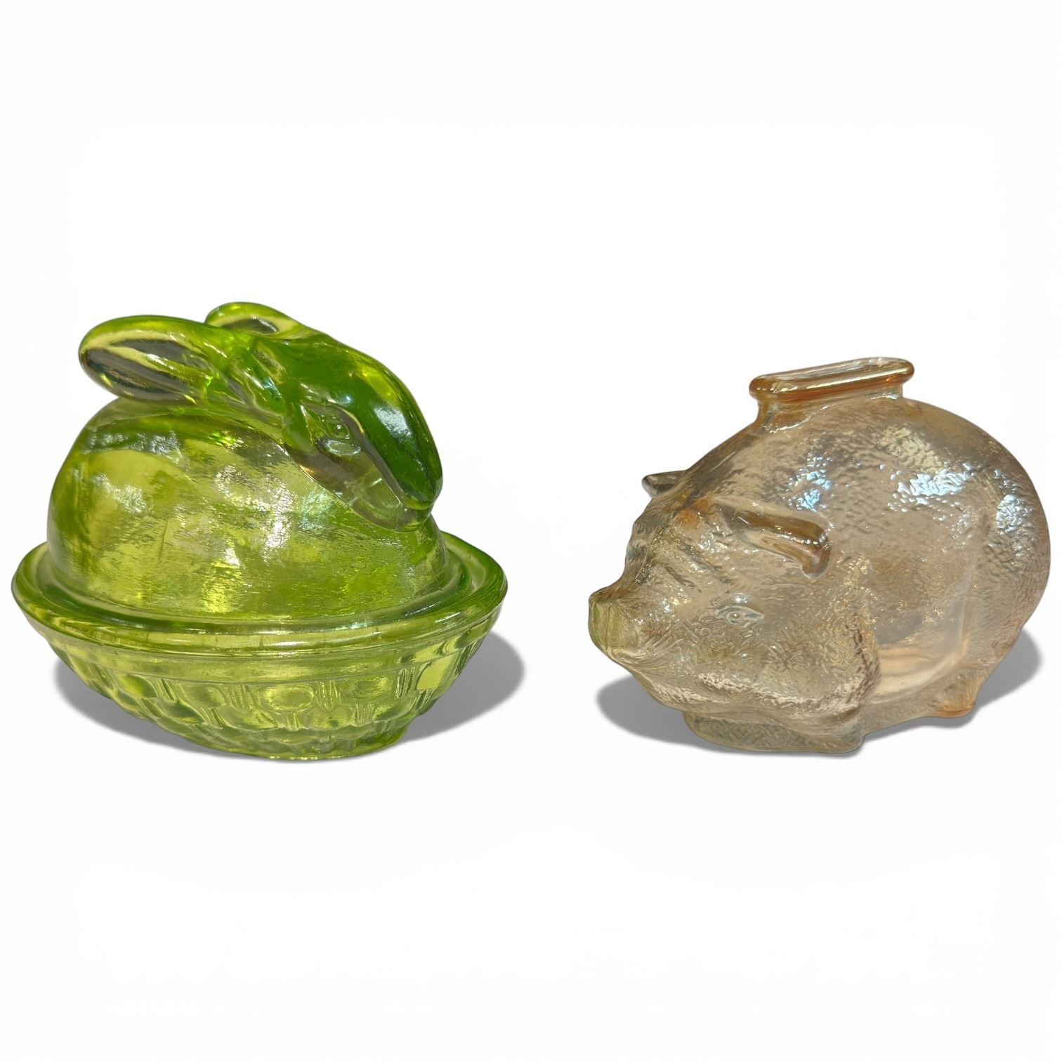 Vintage Depression Glass Bunny on Nest & Piggy Bank (Bunny on Nest is 4" x 5" x 4.5" tall)