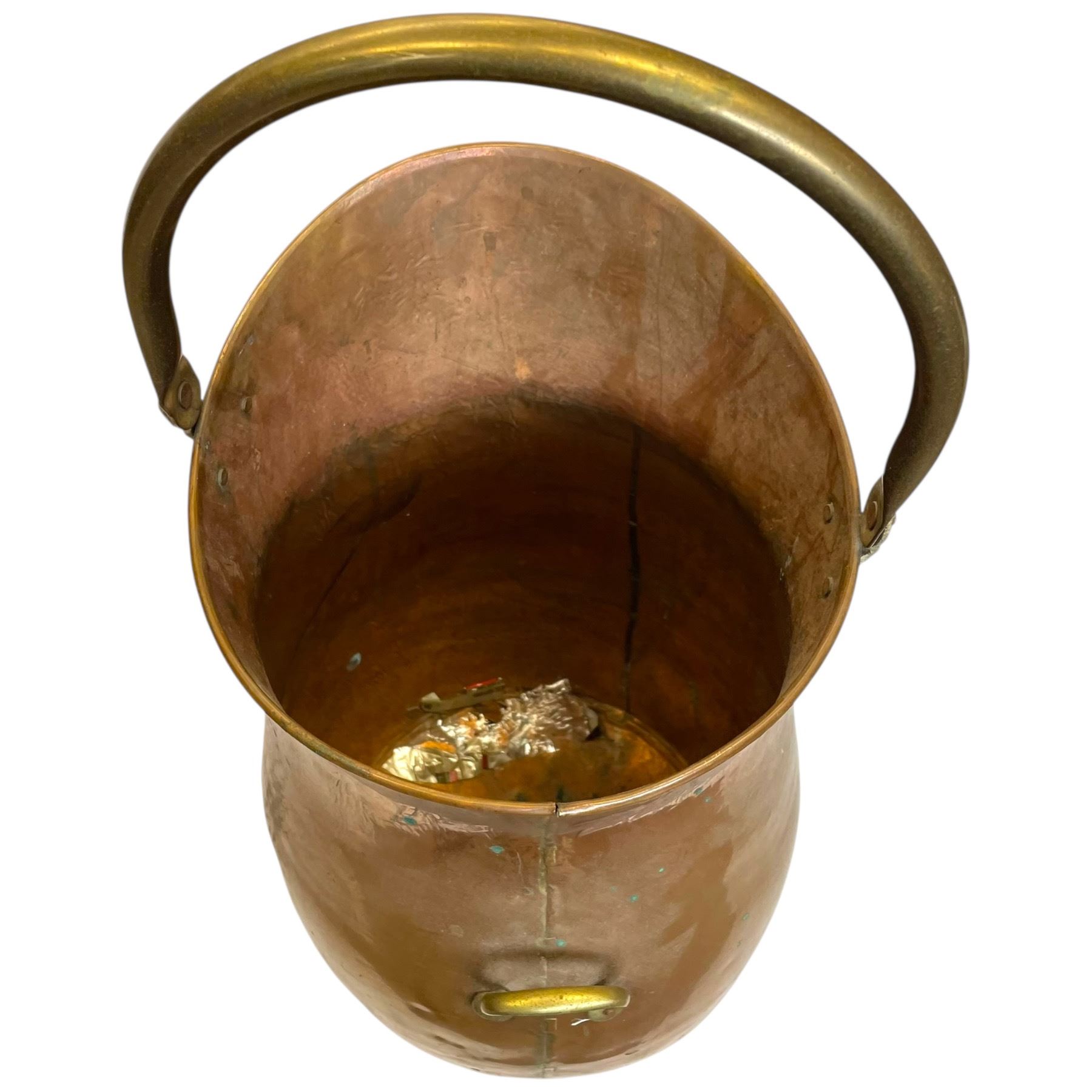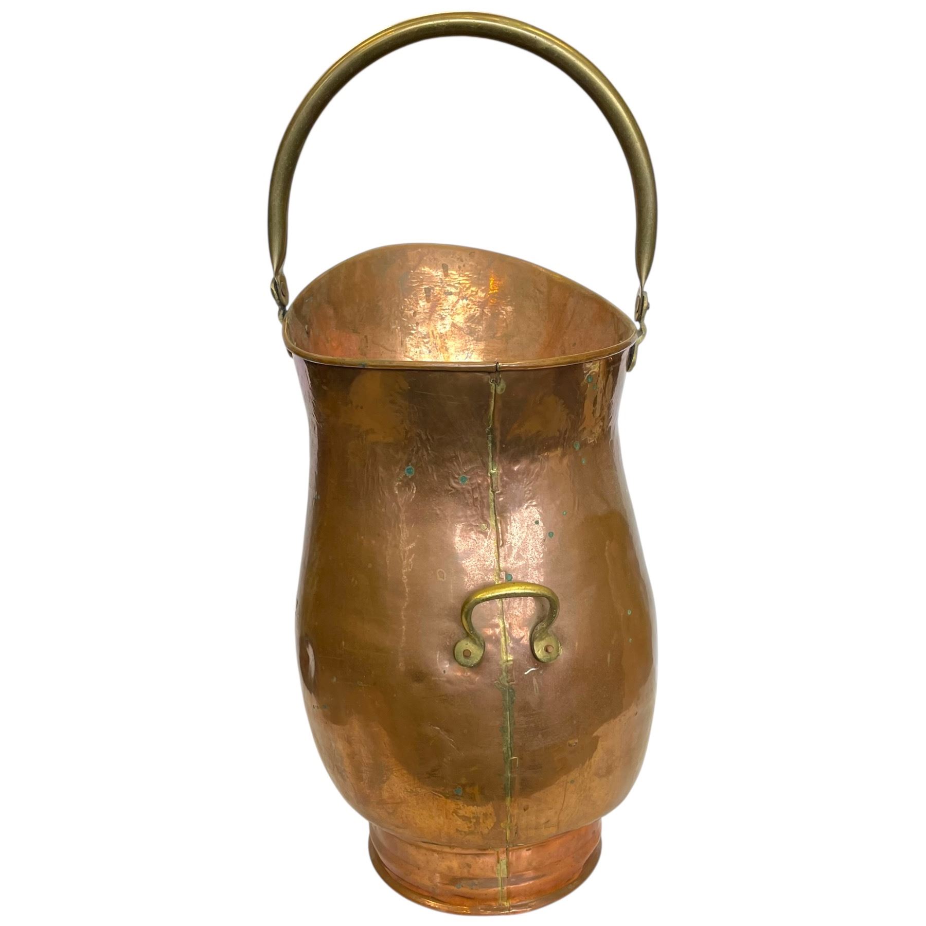 Vintage Dutch or French hammered copper coal scuttle with brass accents and ceramic handle. Helmet-shaped opening with large hooped handle and brass lion head rivets at the base. Originally used for coal transport, often repurposed as an umbrella stand or log holder. Measures 21.5 In tall including handle.