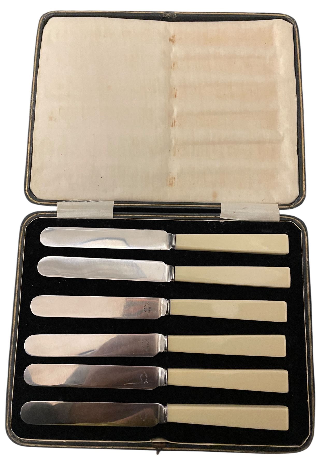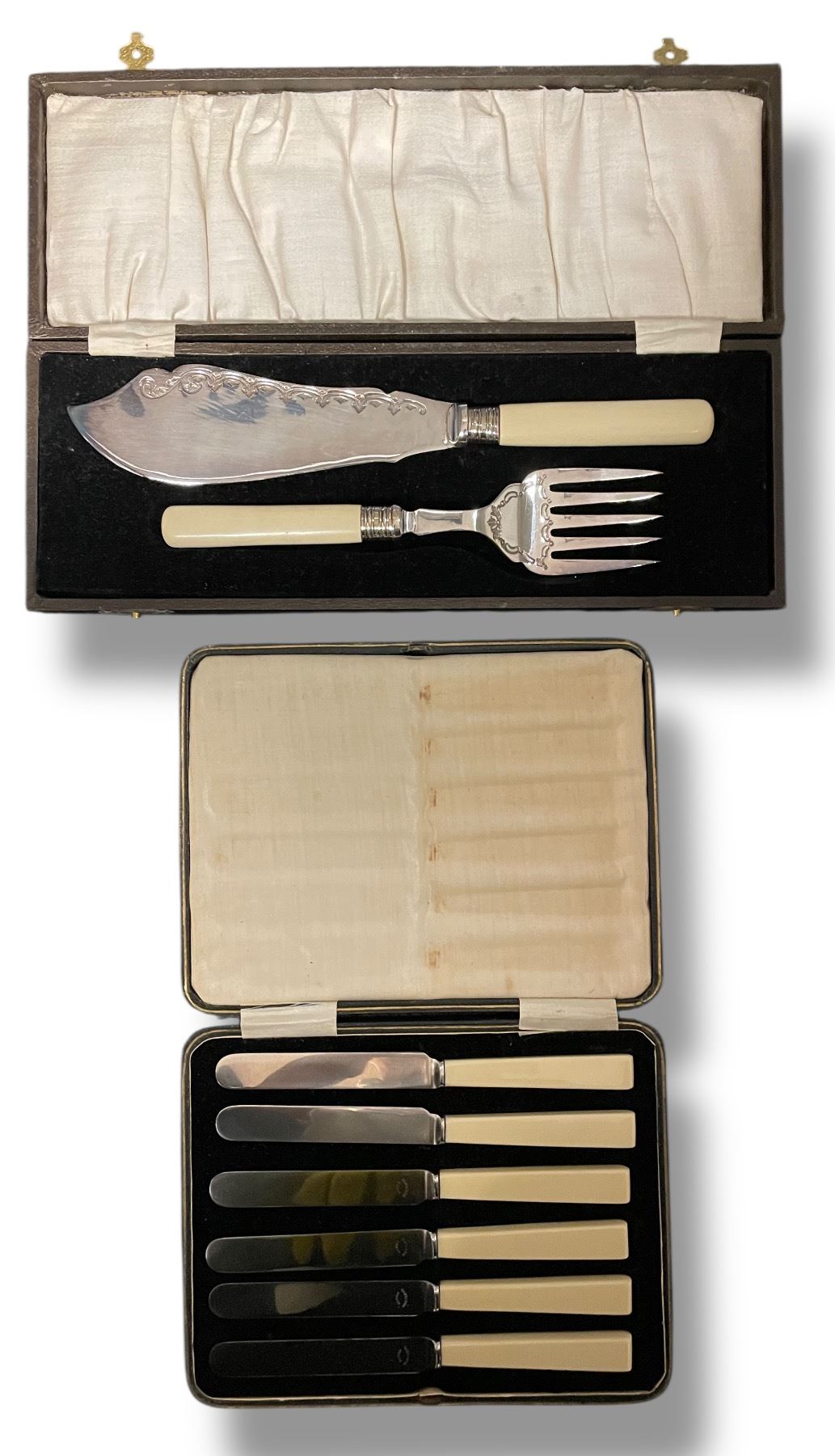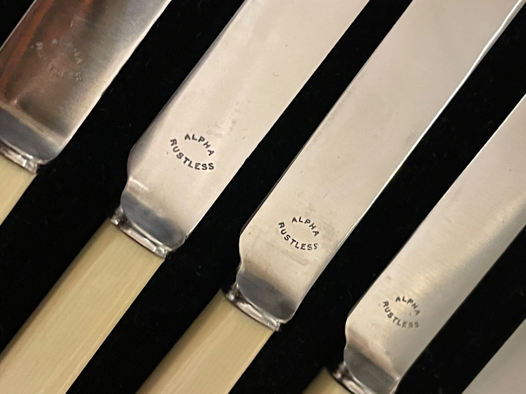 Vintage Faux Bone Handled Dessert Server Set & Set of 6 Dinner Knives in Fitted Case