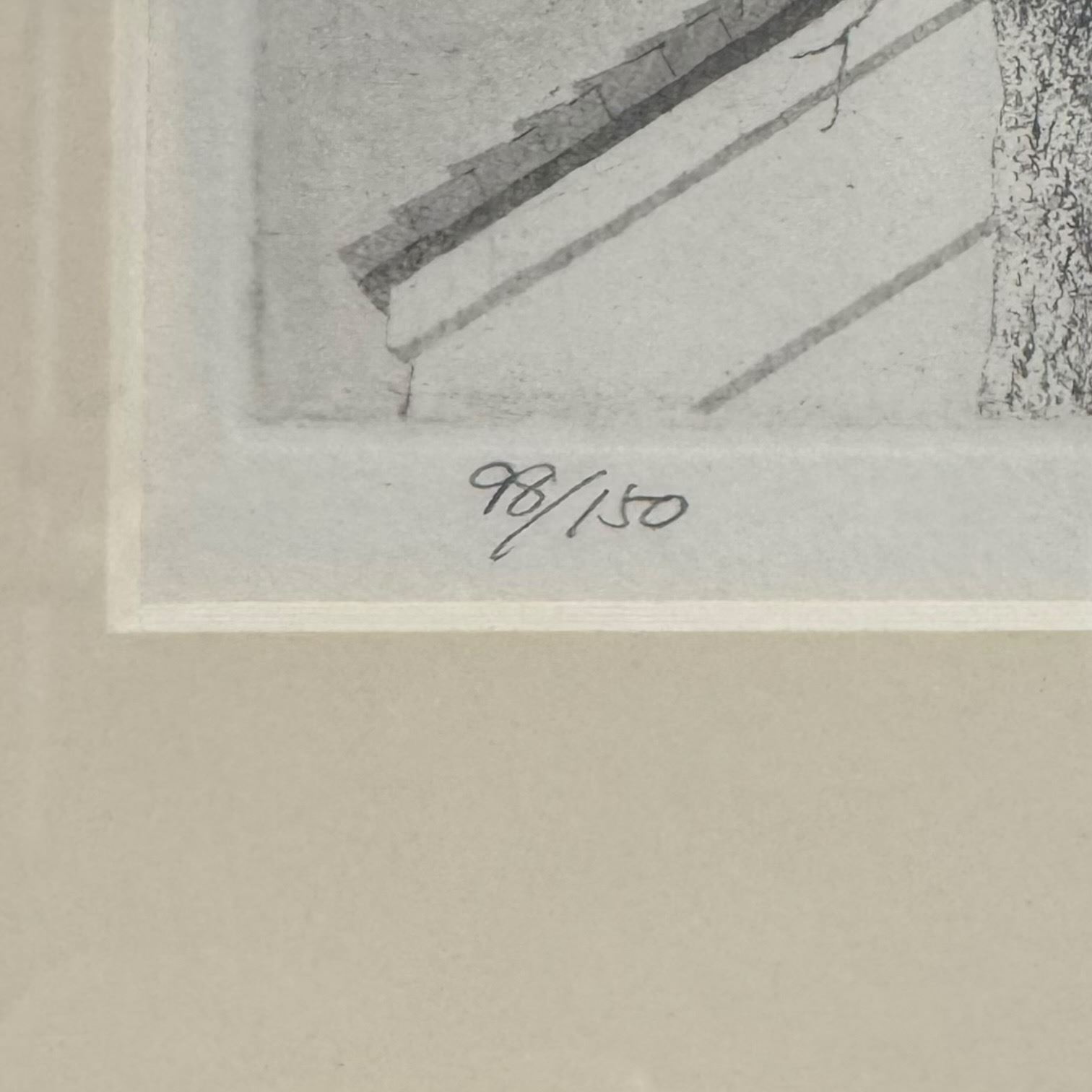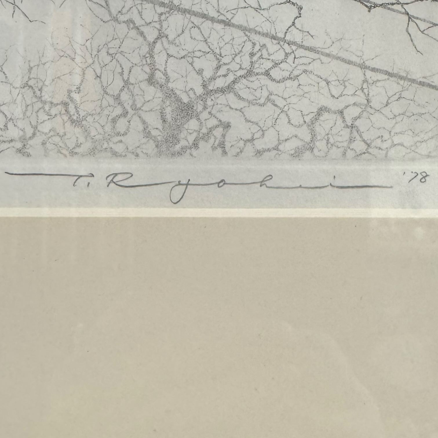 Ryohei Tanaka signed etching dated 1978. Limited edition print 98/150. Subject depicts tree branches in sunlight casting shadows on a roof peak. Framed artwork showcasing Tanaka's detailed style. Item is as pictured.