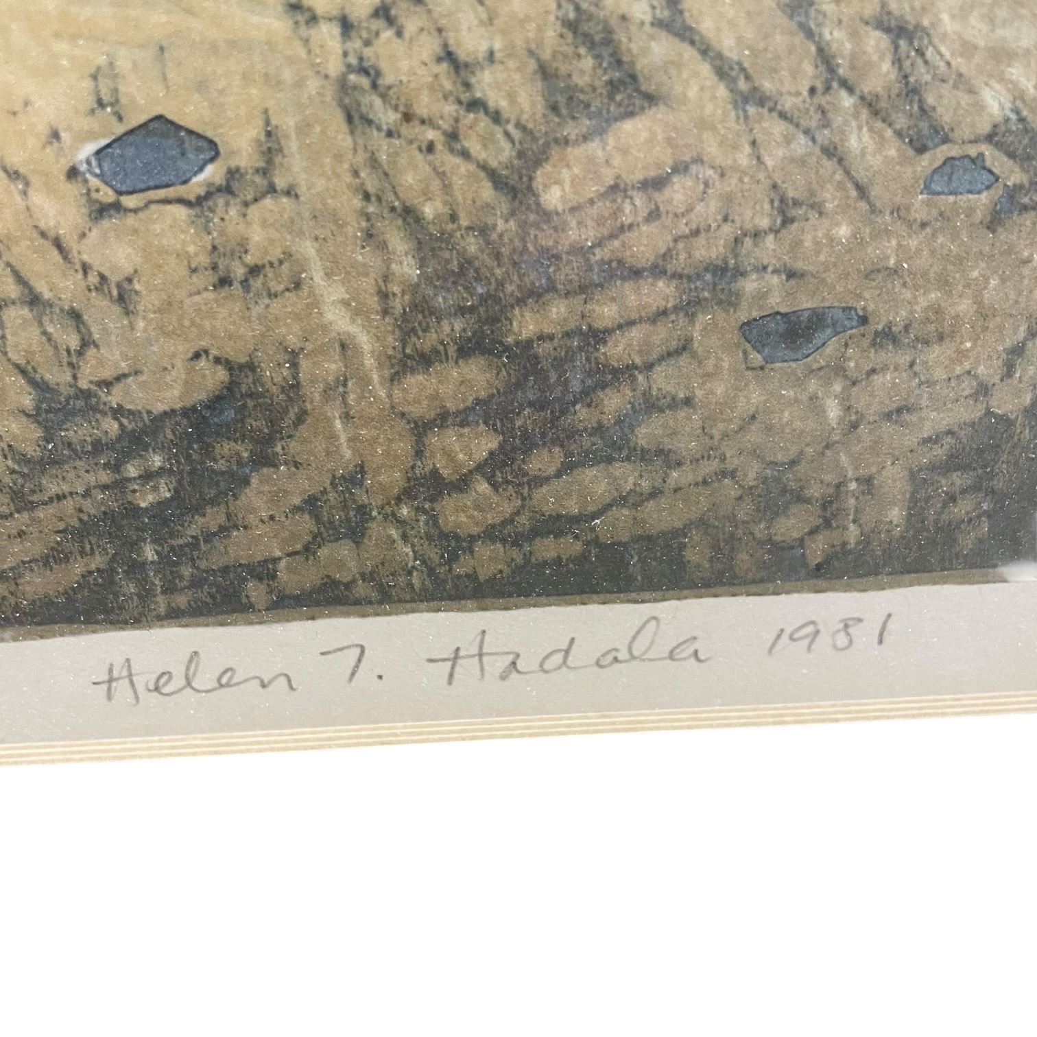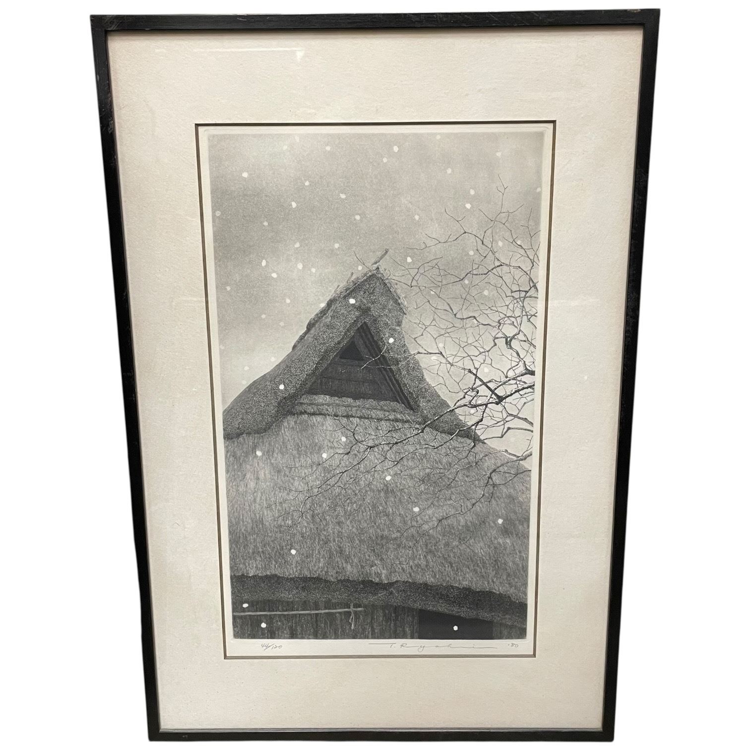 Framed etching by Japanese artist Ryohei Tanaka depicting a roof peak with snow falling. Signed by the artist and dated 1980. Limited edition numbered 44/120. Known for his detailed rural landscapes, Tanaka's works are highly regarded. Item is as pictured.