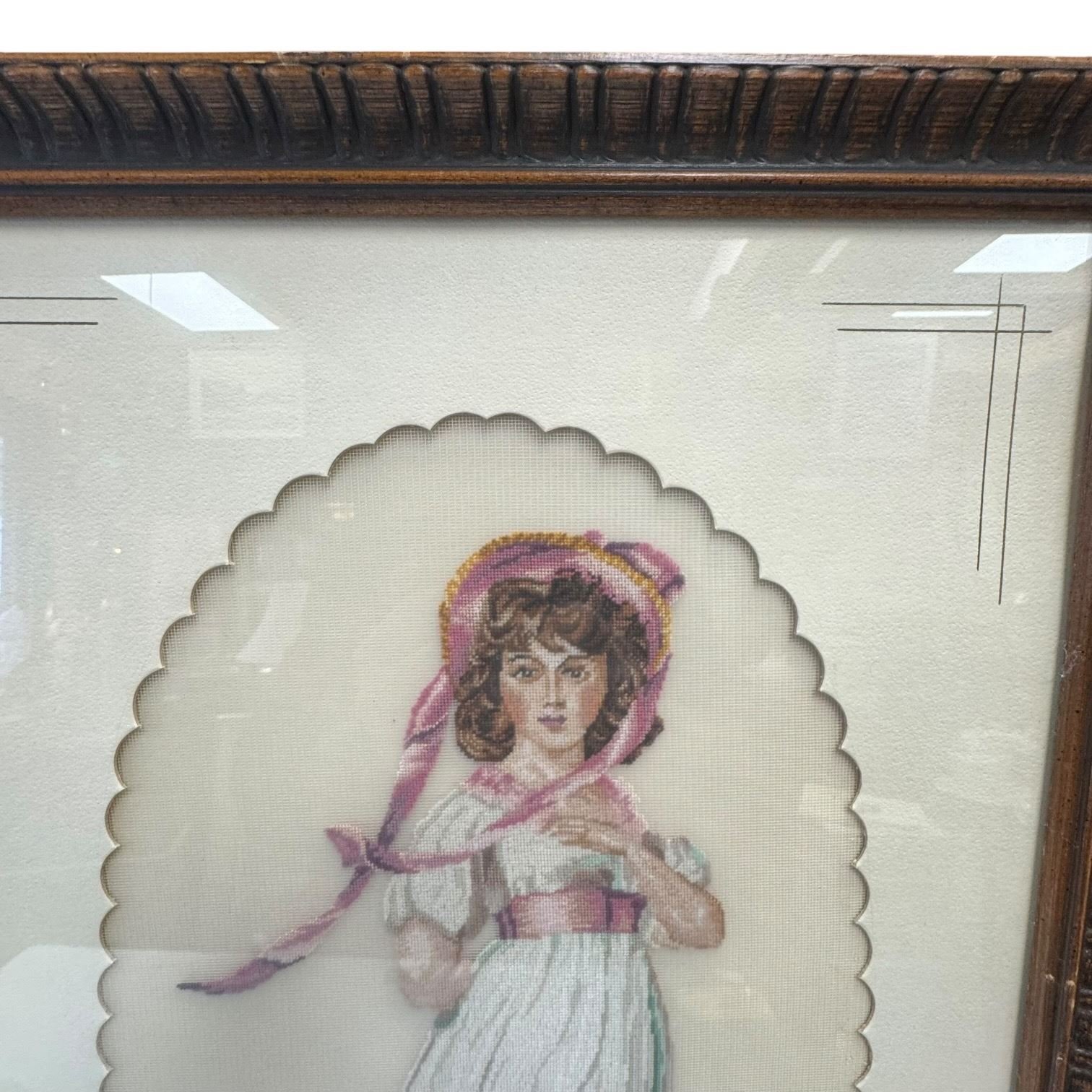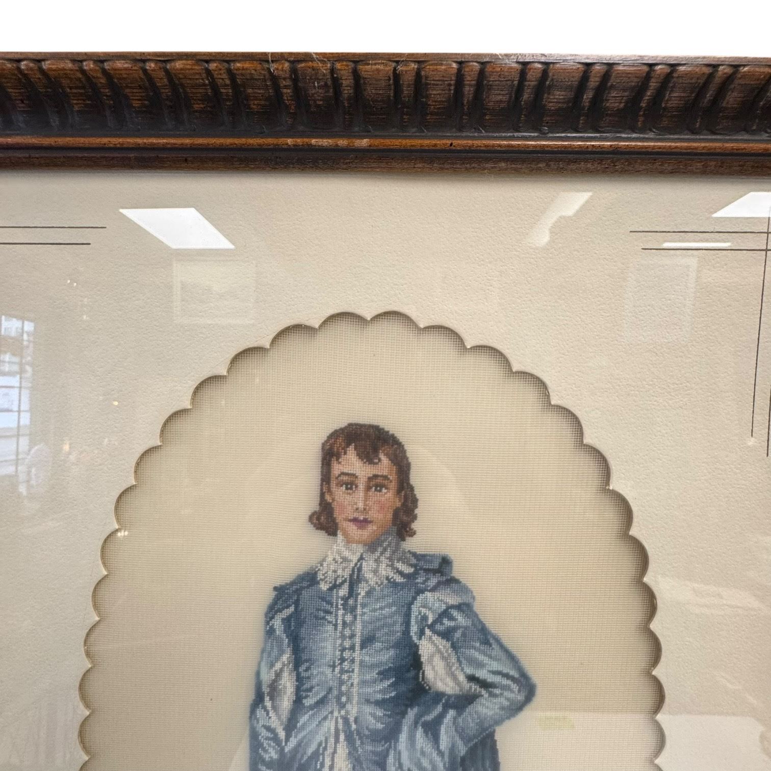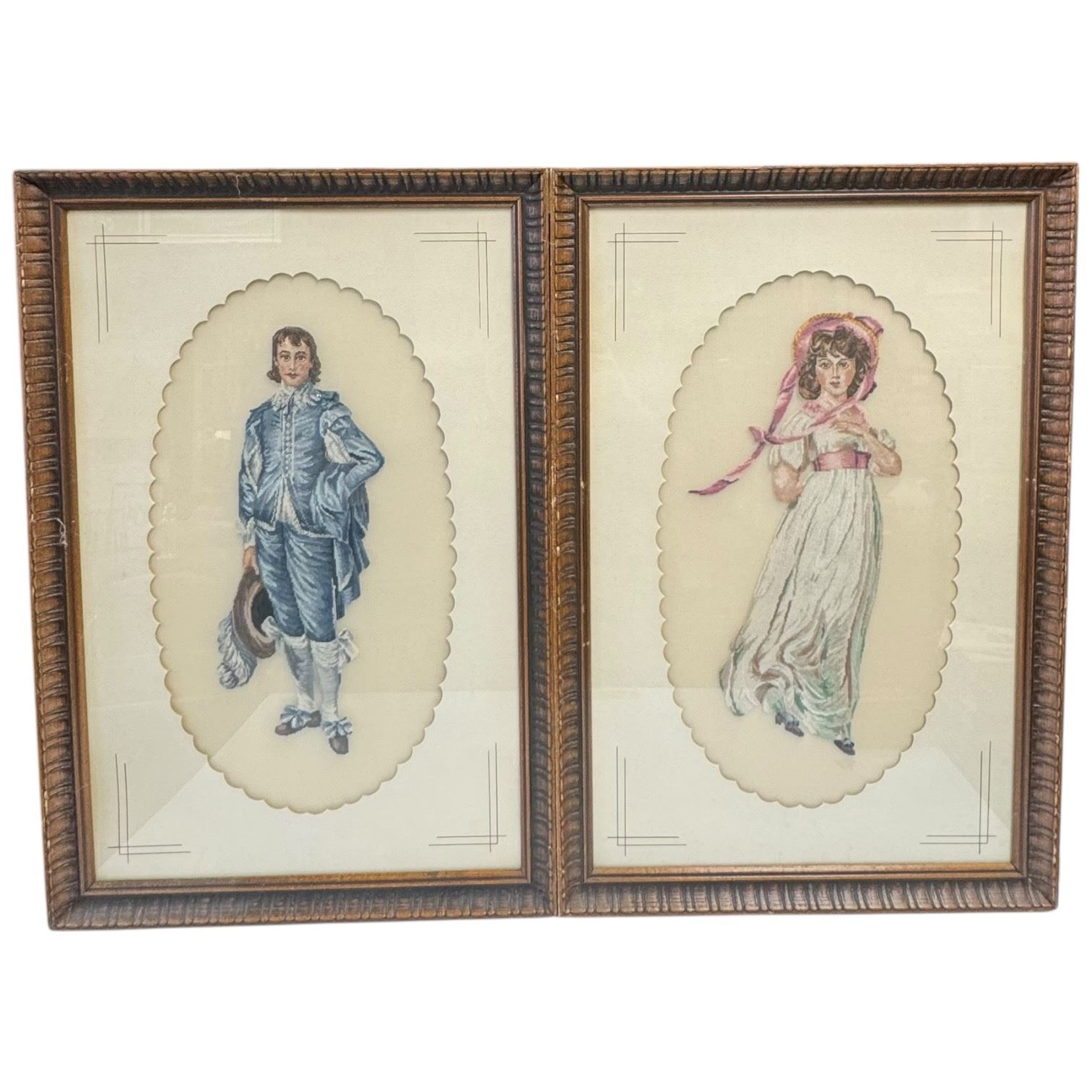 Vintage set of framed needlepoint tapestries depicting famous portraits 'The Blue Boy' by Thomas Gainsborough and 'Pinkie' by Thomas Lawrence. Signed by R Armstrong dated 1974. Frames measure 14.5-Inch in width and 21.5-Inch in height. Item is as pictured.