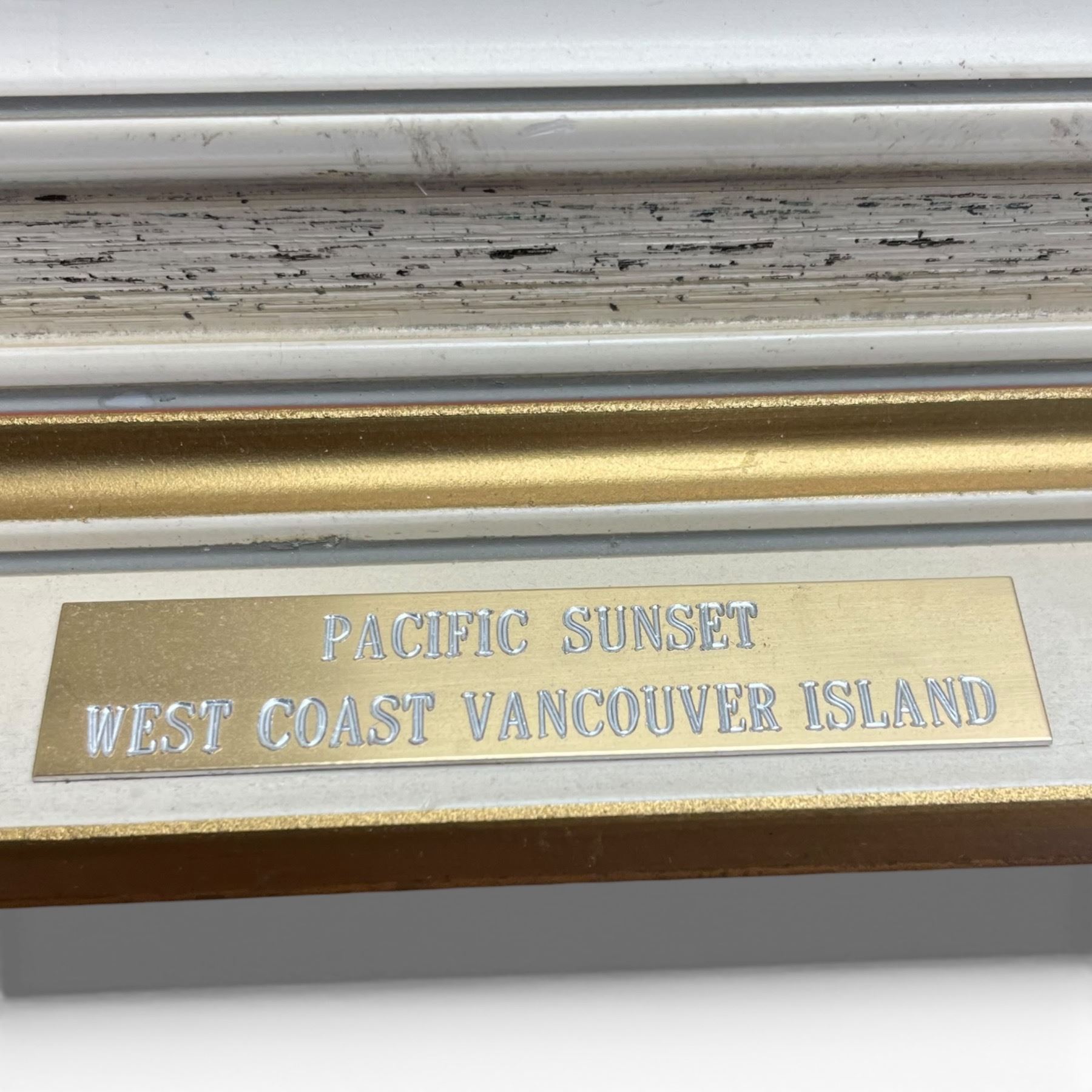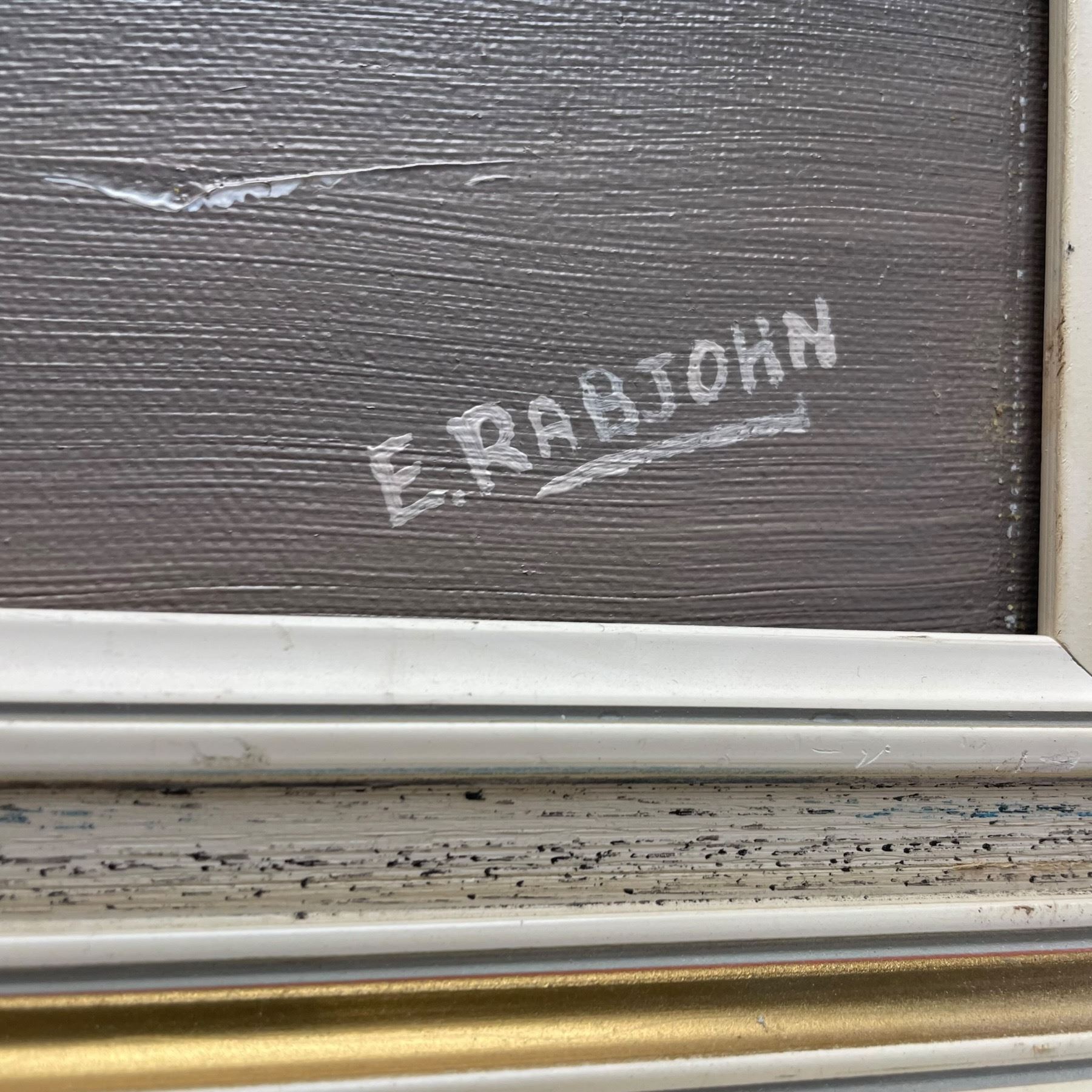 Framed vintage oil painting signed by E. Rabjohn. Depicts a coastal seascape with waves crashing against rocky shores, capturing a serene or stormy ocean atmosphere. Frame dimensions are 27-Inch width and 21-Inch height. Item is as pictured.