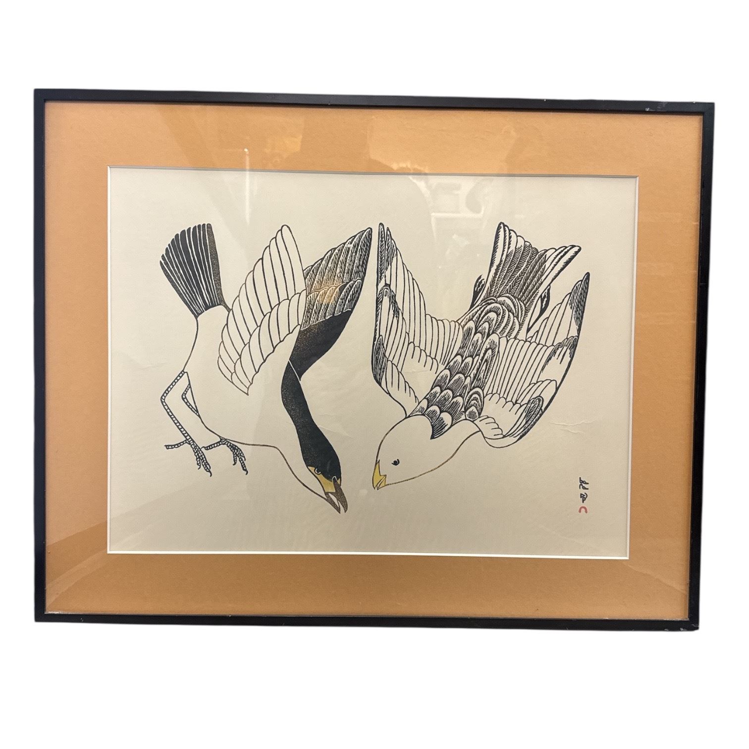 Vintage Framed Print of "Snow Buntings" by Artist Kananginak Pootoogook, Cape Dorset * Framed dimensions: approximately 30" x 28"