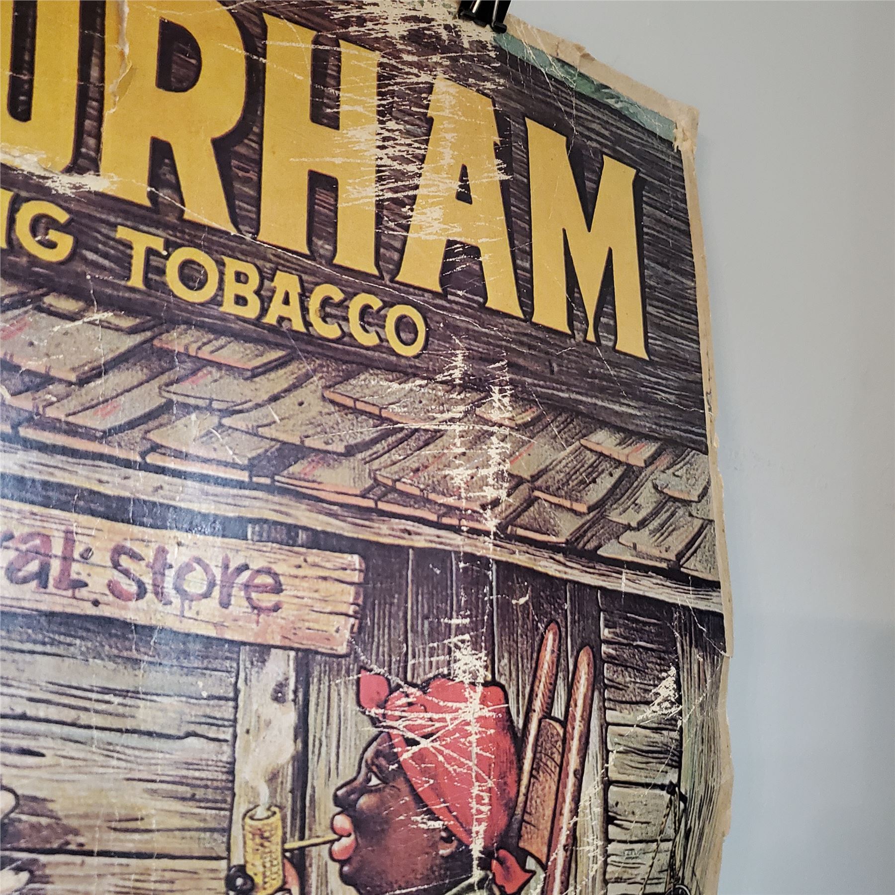 This is an original vintage advertising sign for Genuine Durham Smoking Tobacco, measuring 24x19 inches and printed on paper. The sign shows age-related wear with visible tears and damage. It features classic tobacco advertising graphics, indicative of historical marketing styles.
