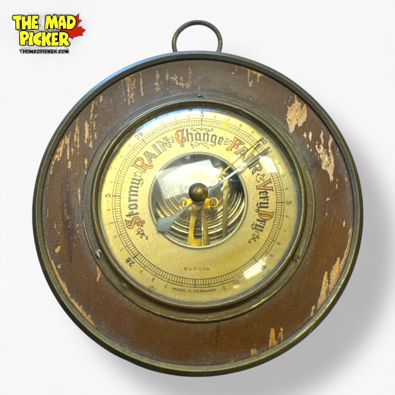 German-made aneroid barometer from the mid-20th century. Features a wood case, brass trim, and a glass face. Designed to measure atmospheric pressure with precision. Likely produced circa 1940s-1960s. Includes finely detailed markings and a classic design reflective of the era.