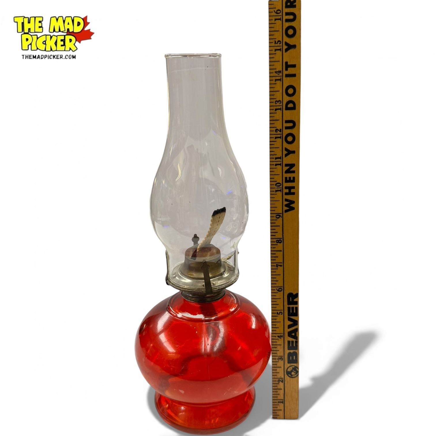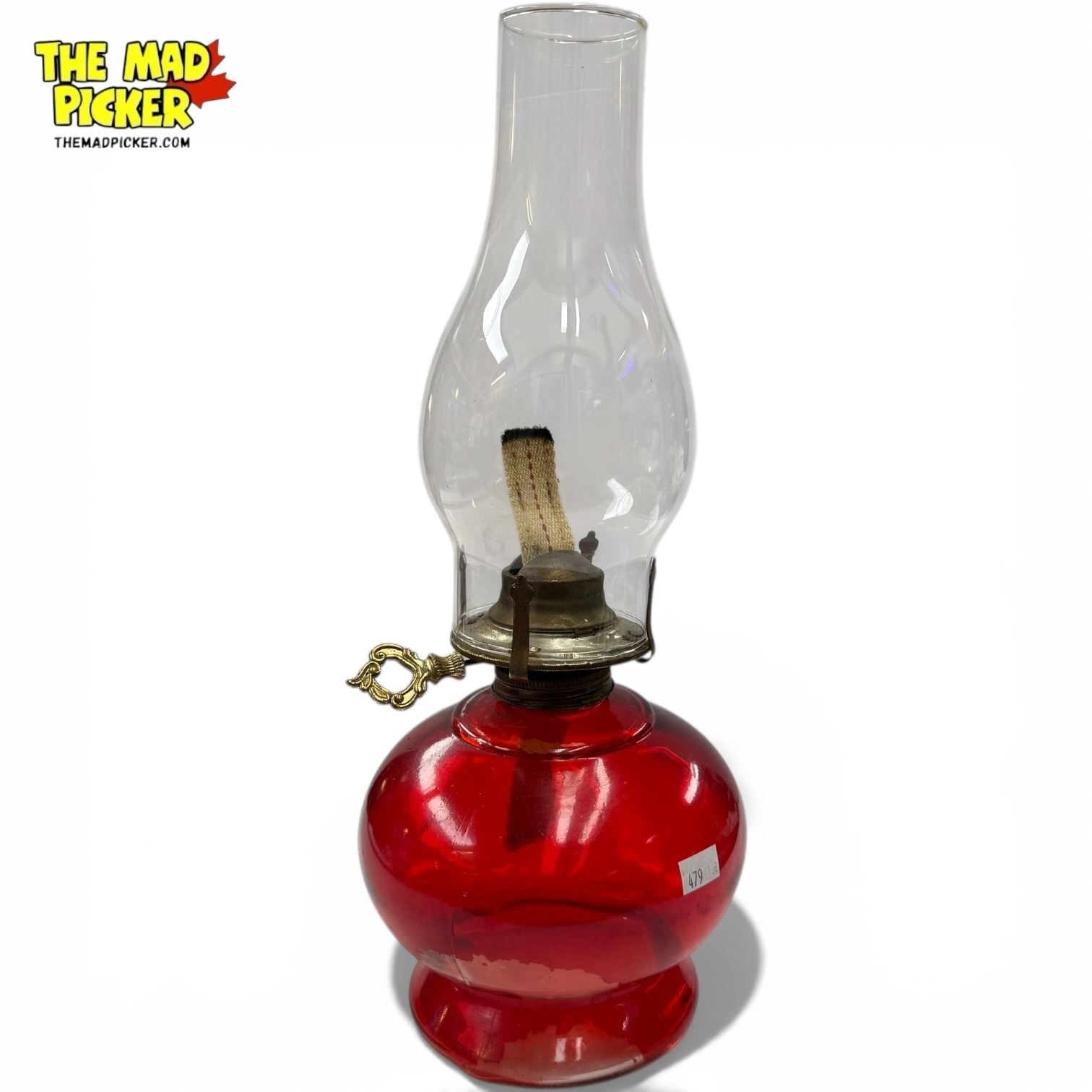 Vintage Glass Oil Lamp Complete with Chimney - Red Base