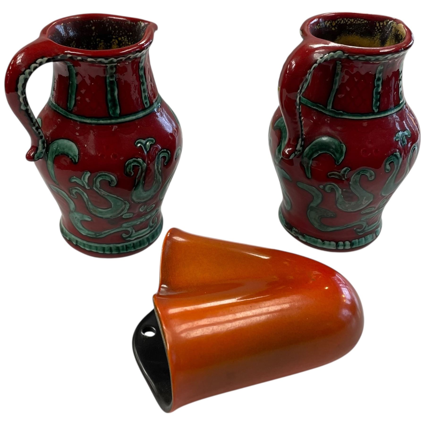 Pair of vintage ceramic pitchers produced by Gmundner Keramik, a renowned Austrian brand, along with a Waechtersbach wall hanging vase.