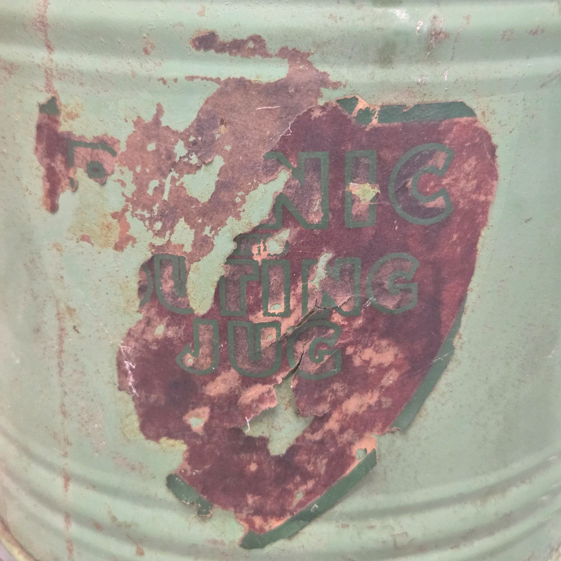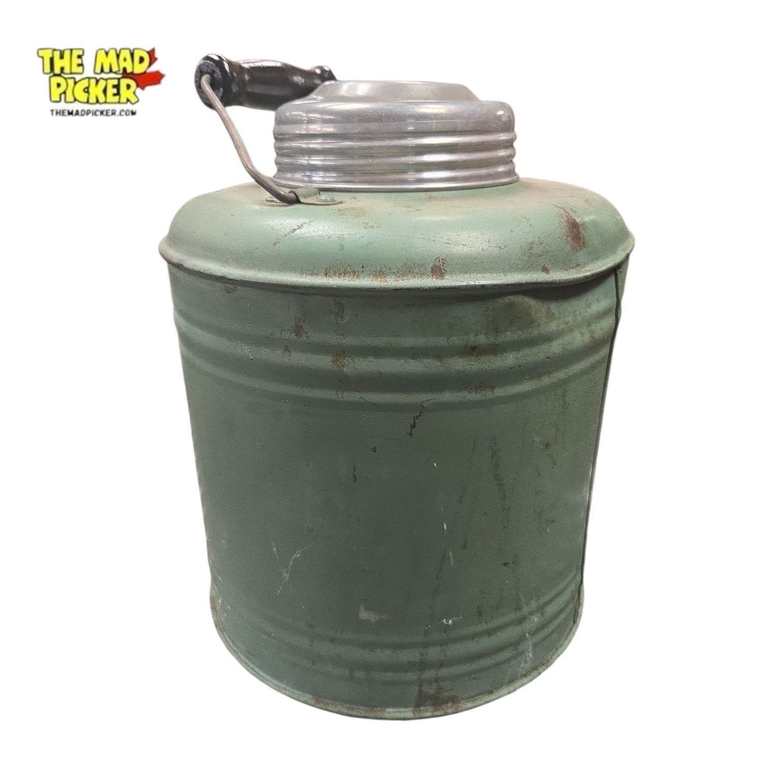 Vintage green metal water jug, likely a 'Therm-a-Jug' made by Knapp Monarch Co. or similar from Landers, Frary & Clark. Produced circa 1940s-1960s, with aluminum lid, ceramic or porcelain lining, and 1-gallon capacity. Features a sturdy wire handle with black wooden grip. Designed for keeping beverages hot or cold.