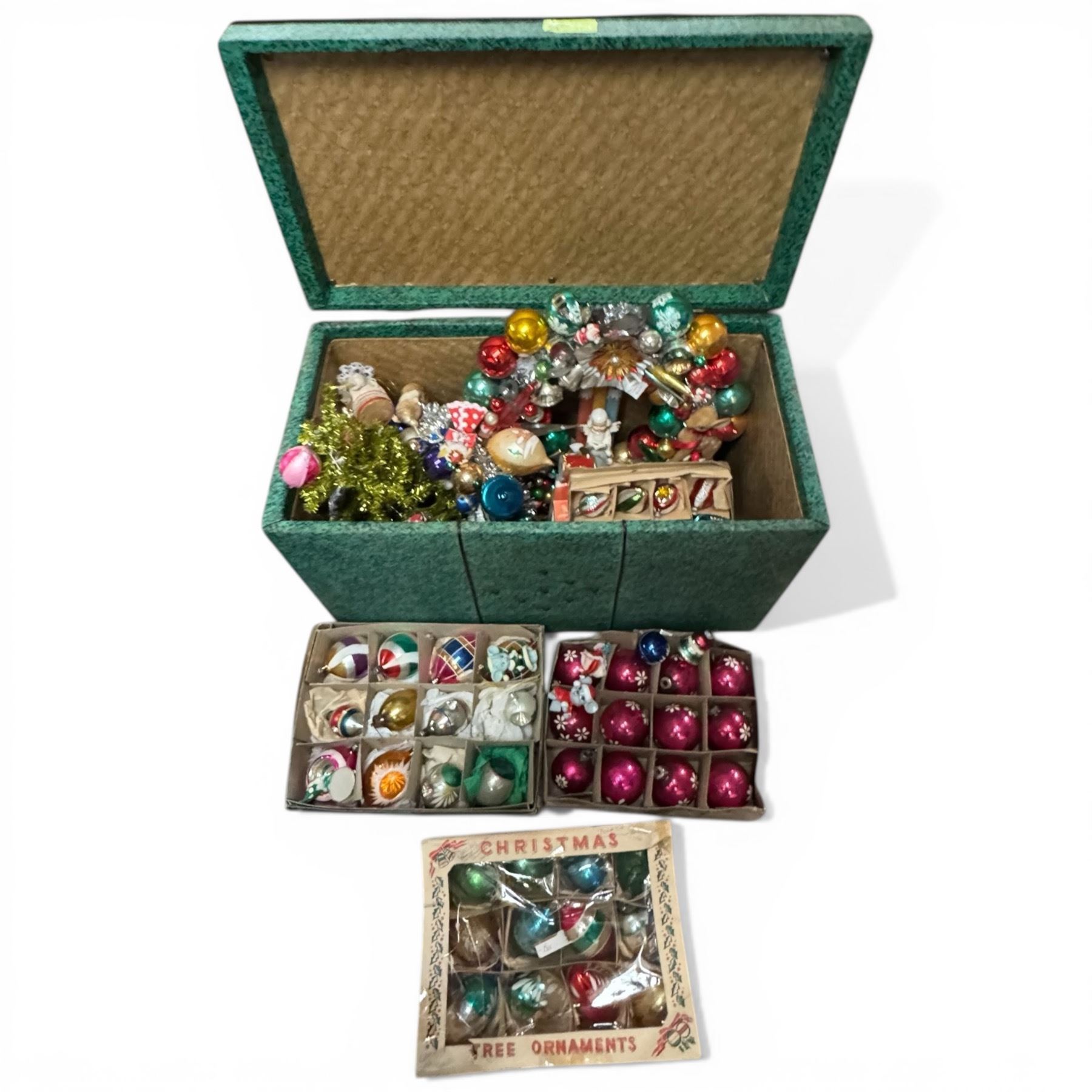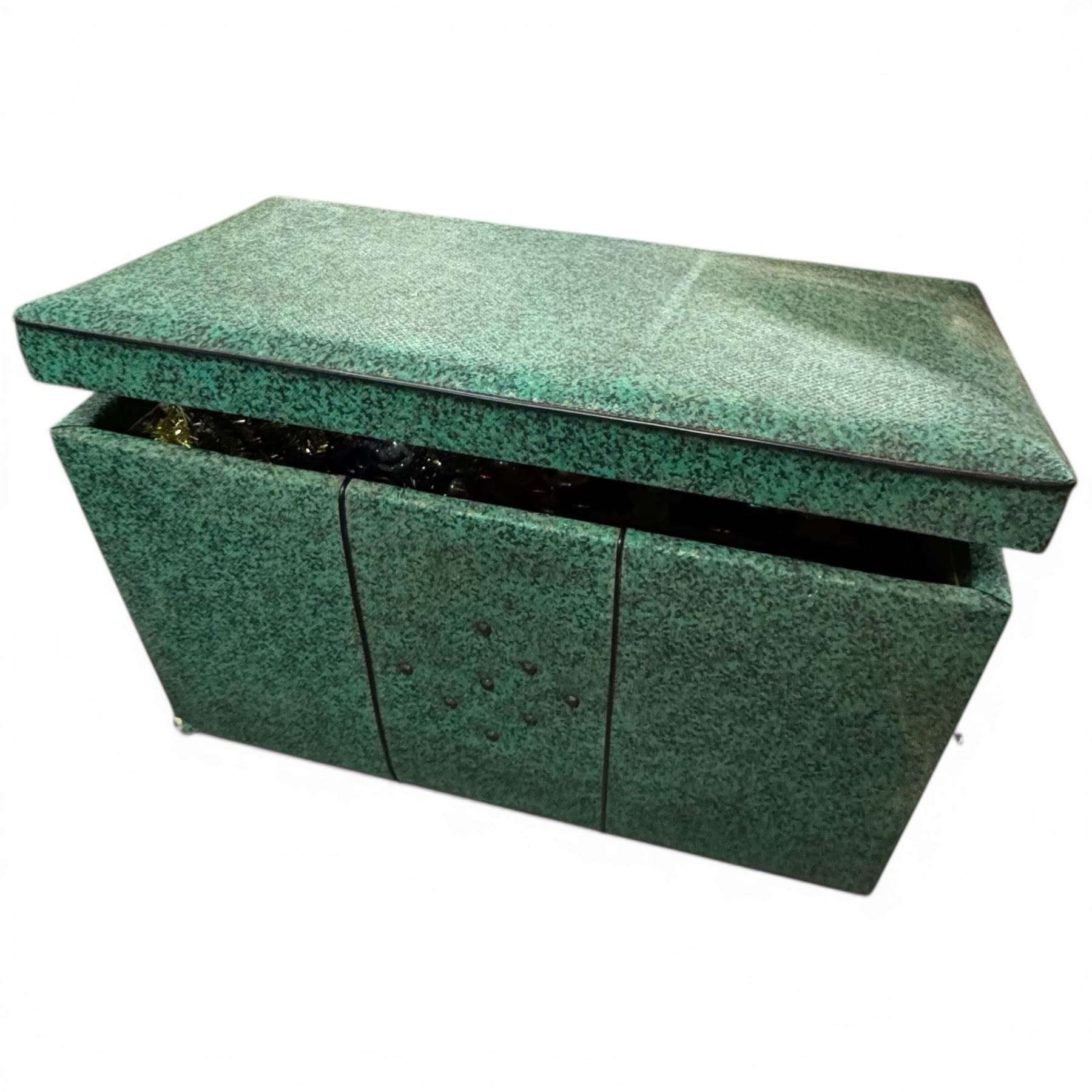 Vintage Green Vinyl Chest Filled with Vintage Christmas Decorations