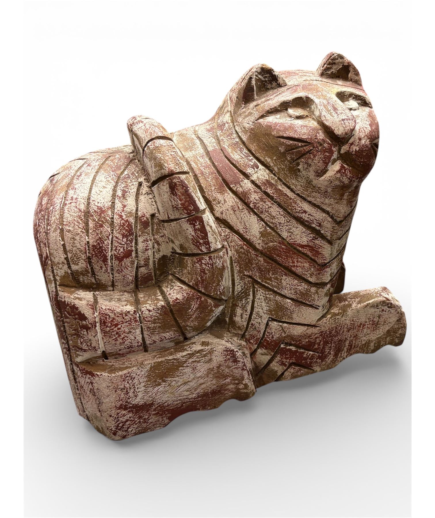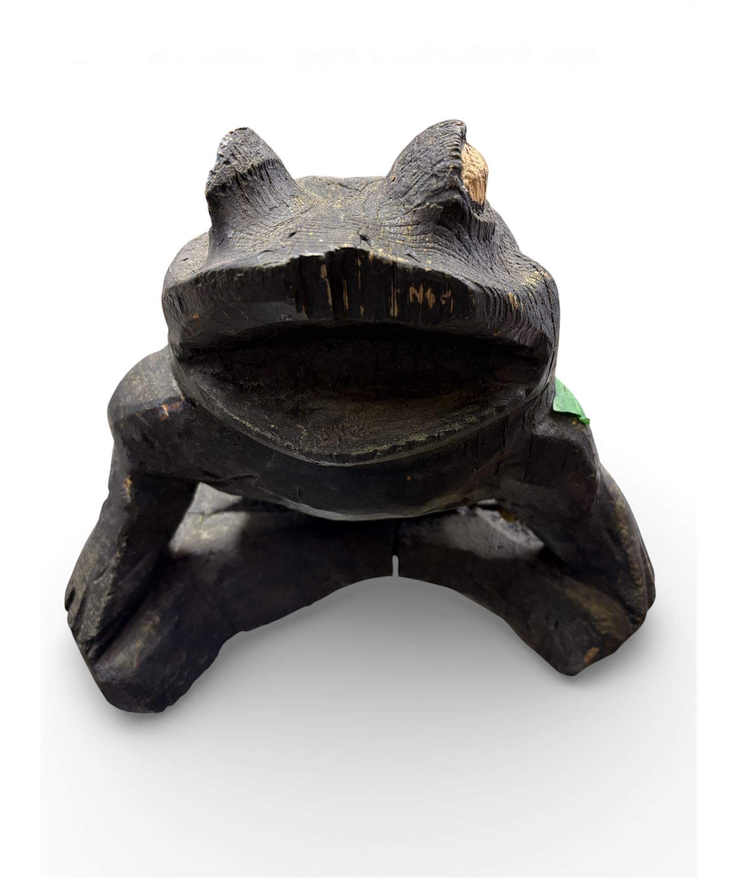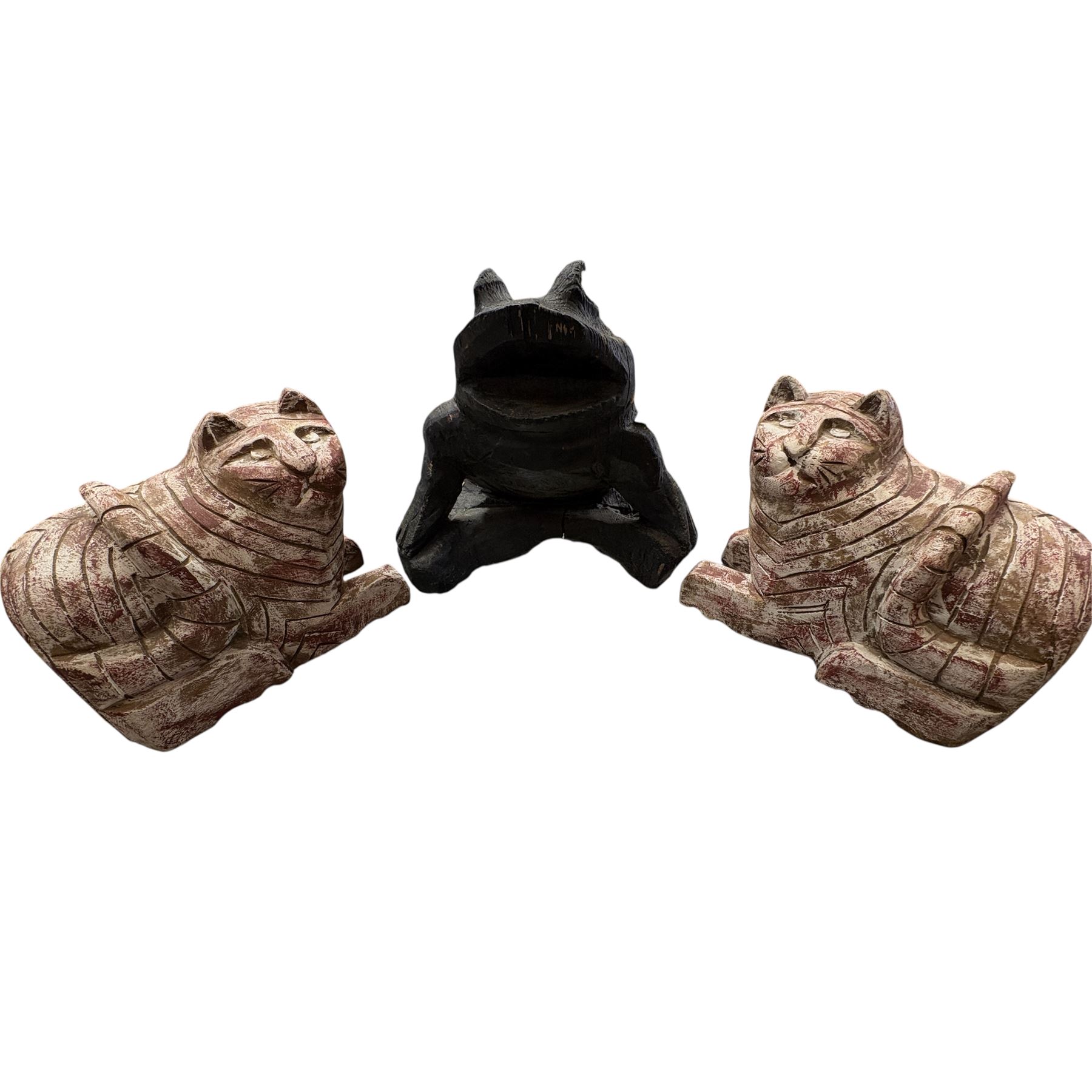 Set of vintage folk art wooden sculptures featuring a 13.5-inch carved frog and two carved cats. Handcrafted with detailed carving and smooth finishes. Pieces display charming, rustic craftsmanship, likely mid-to-late 20th century. Unique collectible for folk art enthusiasts.