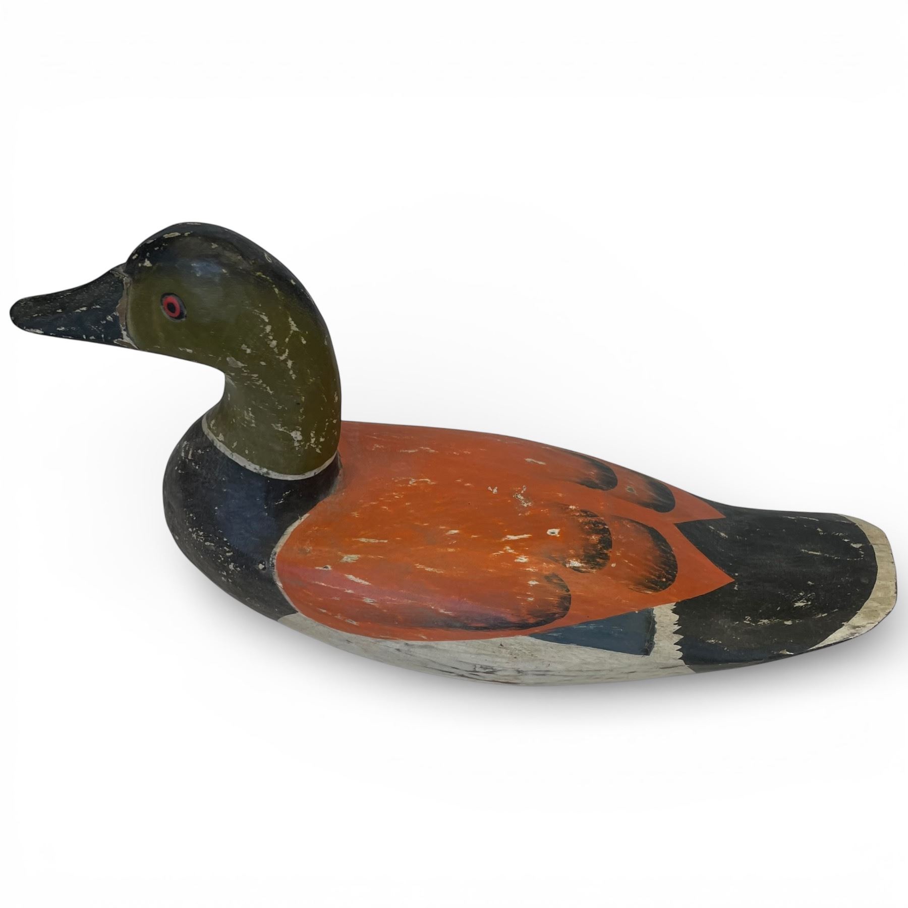Vintage mallard duck decoy crafted from wood, hand-carved and hand-painted. Measures 16-Inch in length. Features intricate detailing and realistic coloration, showcasing traditional craftsmanship. Item is as pictured.