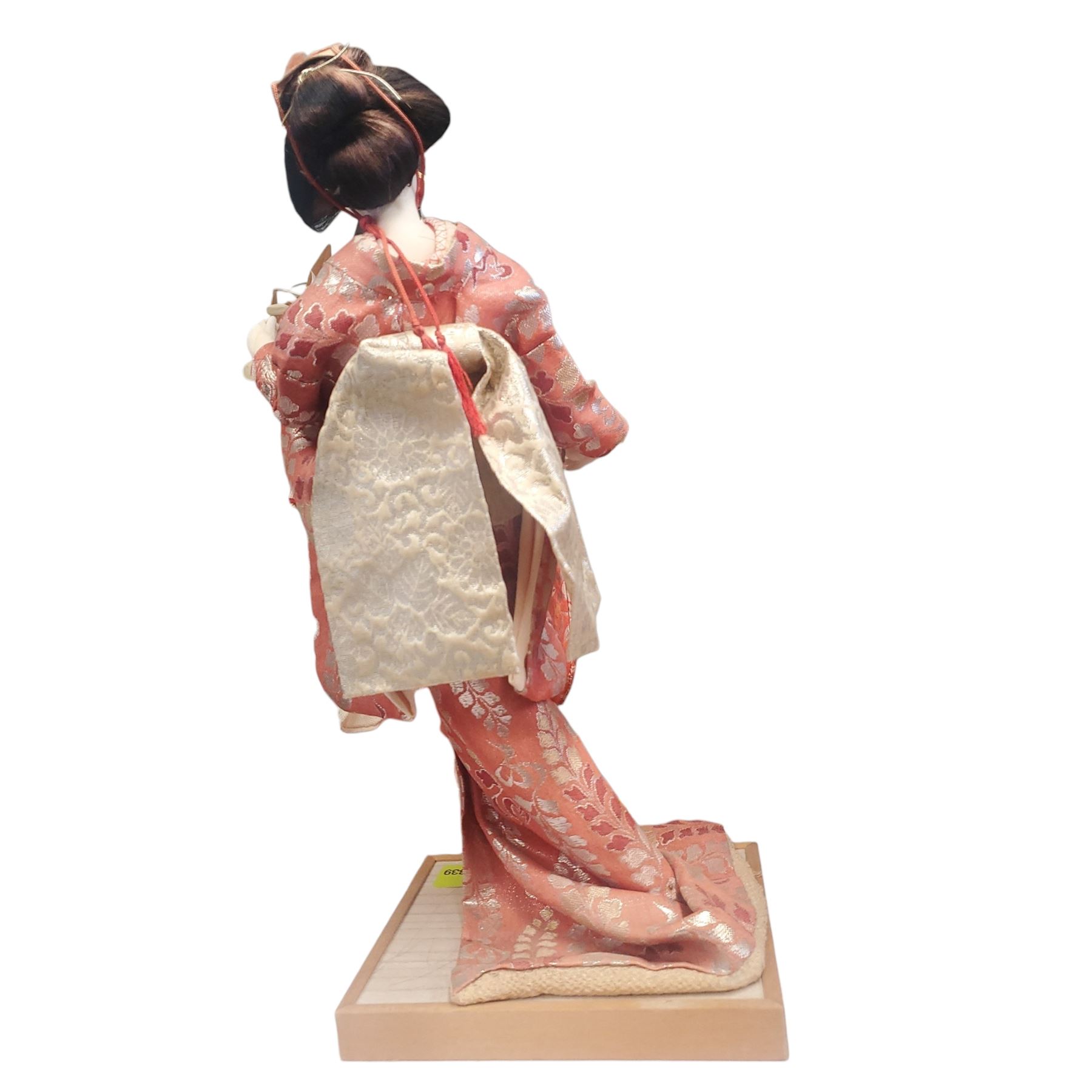 Vintage hand made Japanese Geisha doll wearing a traditional kimono. The doll measures 17-Inch tall. Features intricate detailing on the face and attire consistent with traditional craftsmanship. Item is as pictured.
