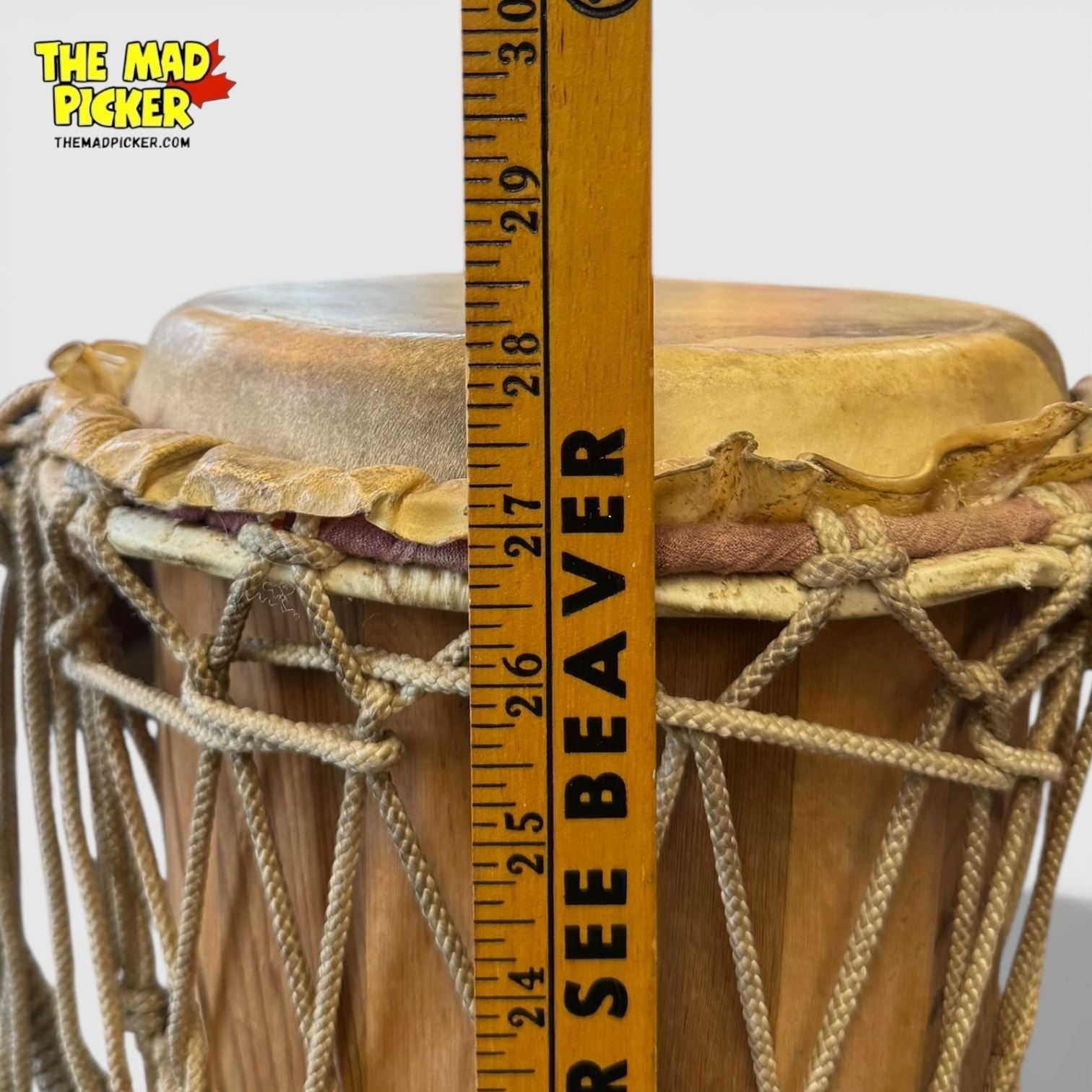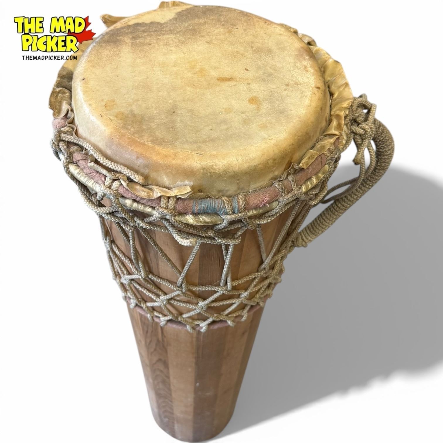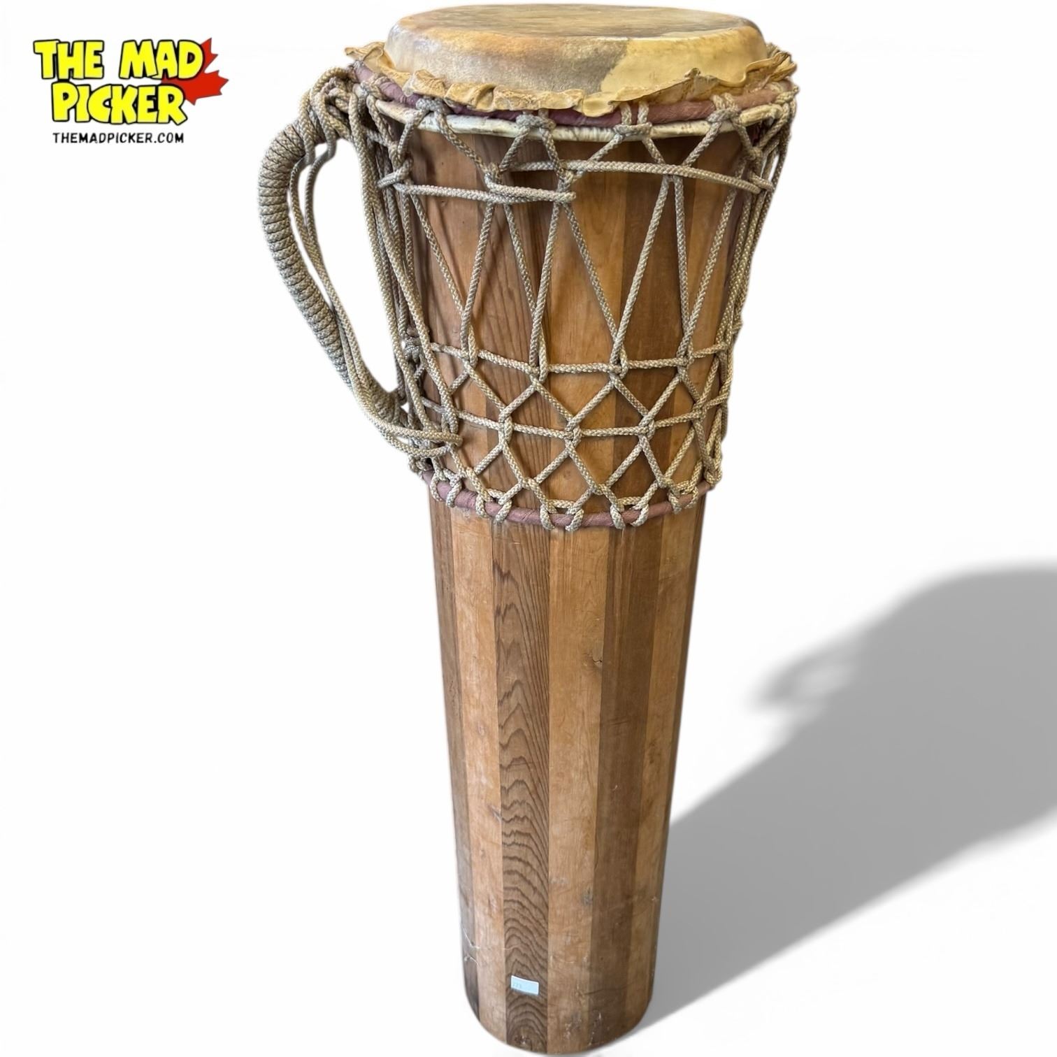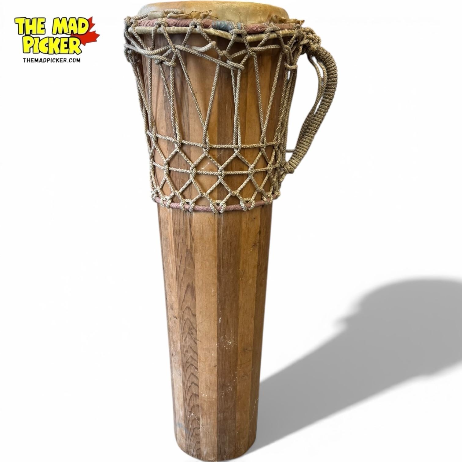 28-inch vintage handmade Ashiko drum with wooden conical body, rope lacing system, and carrying handle. Features a hide drum head, likely pig or goat skin. Originates from West Africa (specifically Nigeria) and traditionally used in ceremonies and drum circles. Close relative of the djembe.