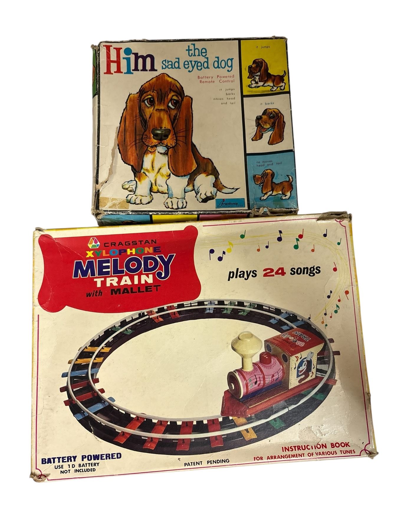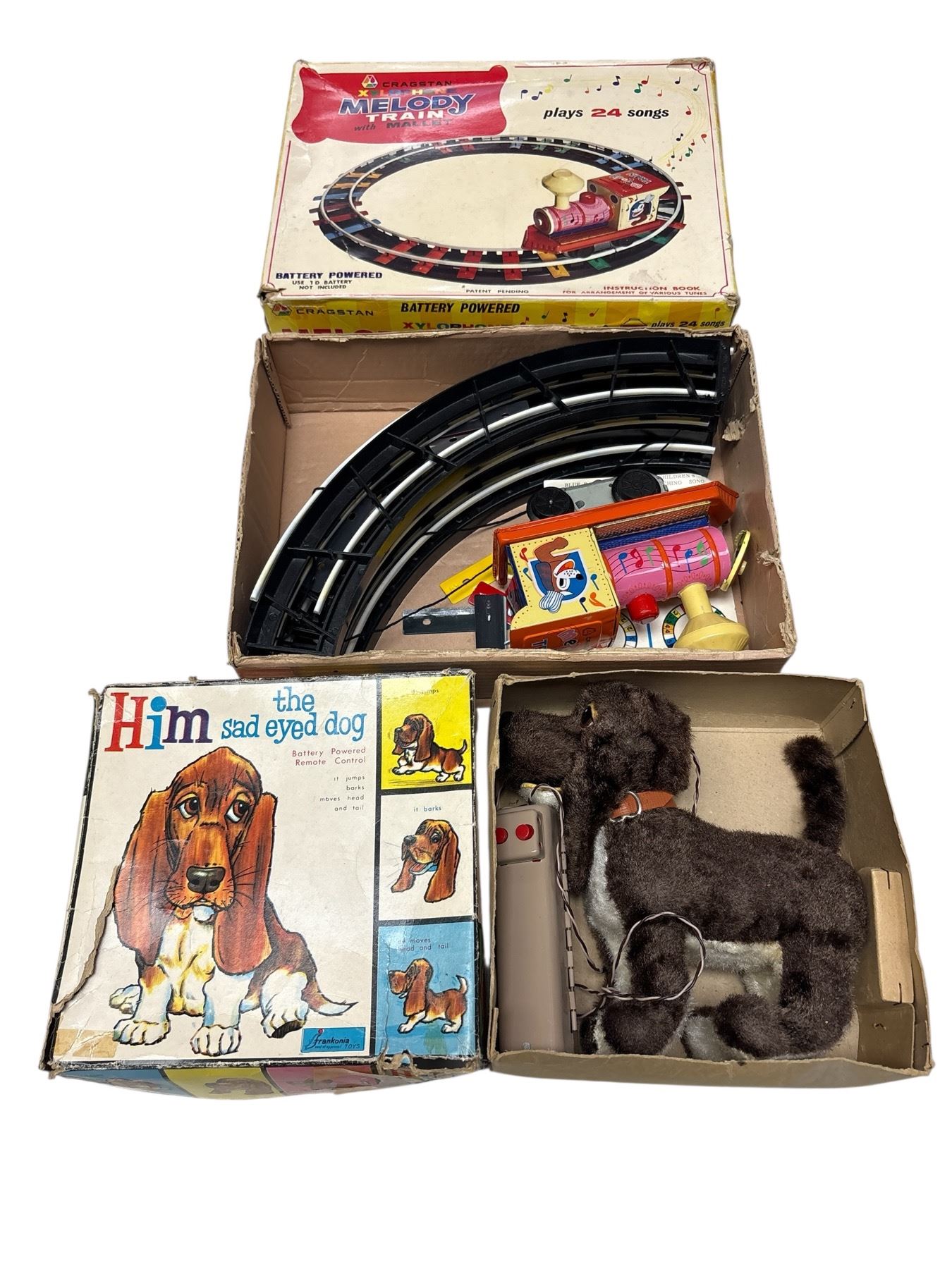 Includes a vintage Him the Sad Eyed Dog plush toy and Cragston Xylophone Melody Train tin toy. The dog features sad eyes with soft plush material. The train is a wind-up tin design with a xylophone that plays melodies as it runs. Likely mid-20th century production, makers known for nostalgic toys.