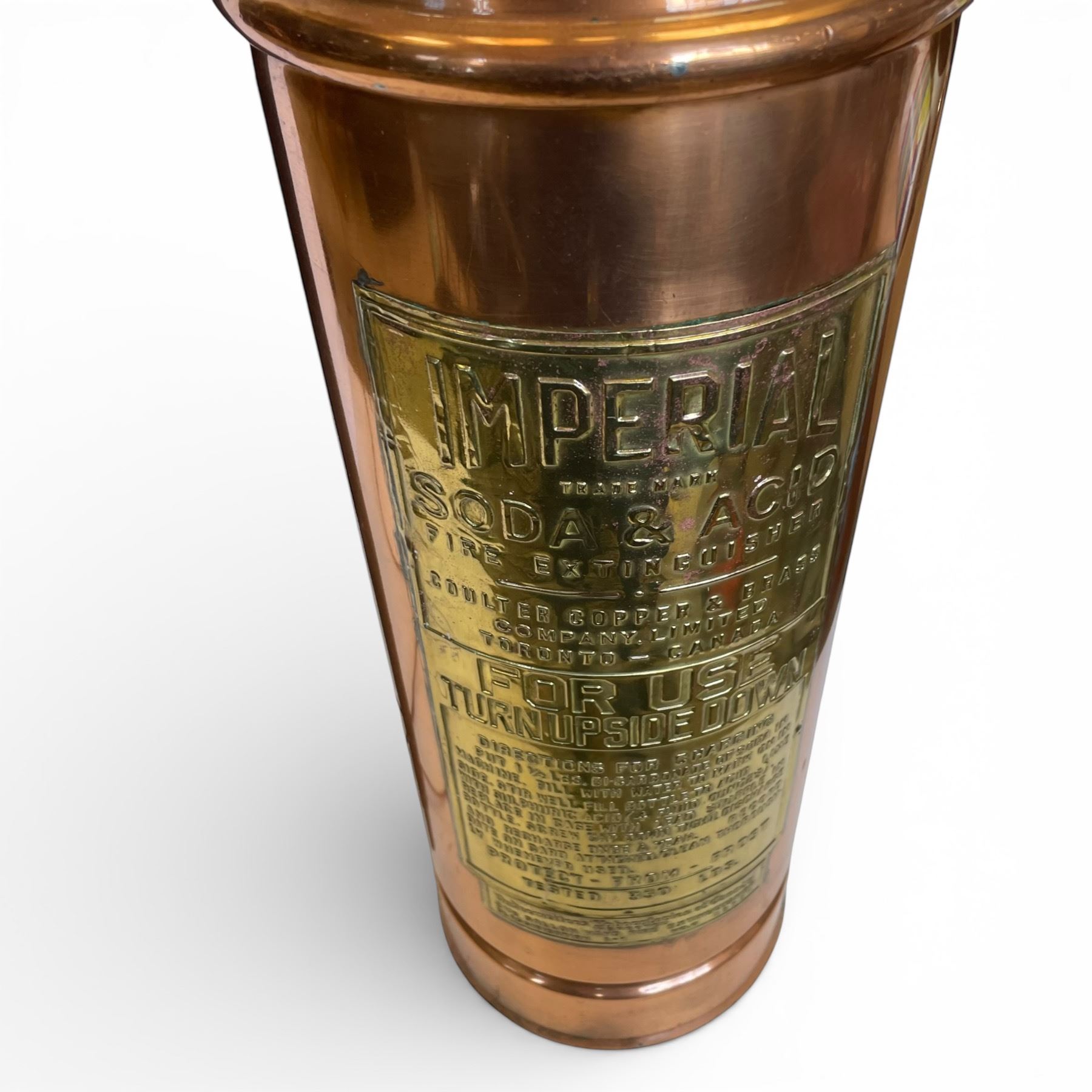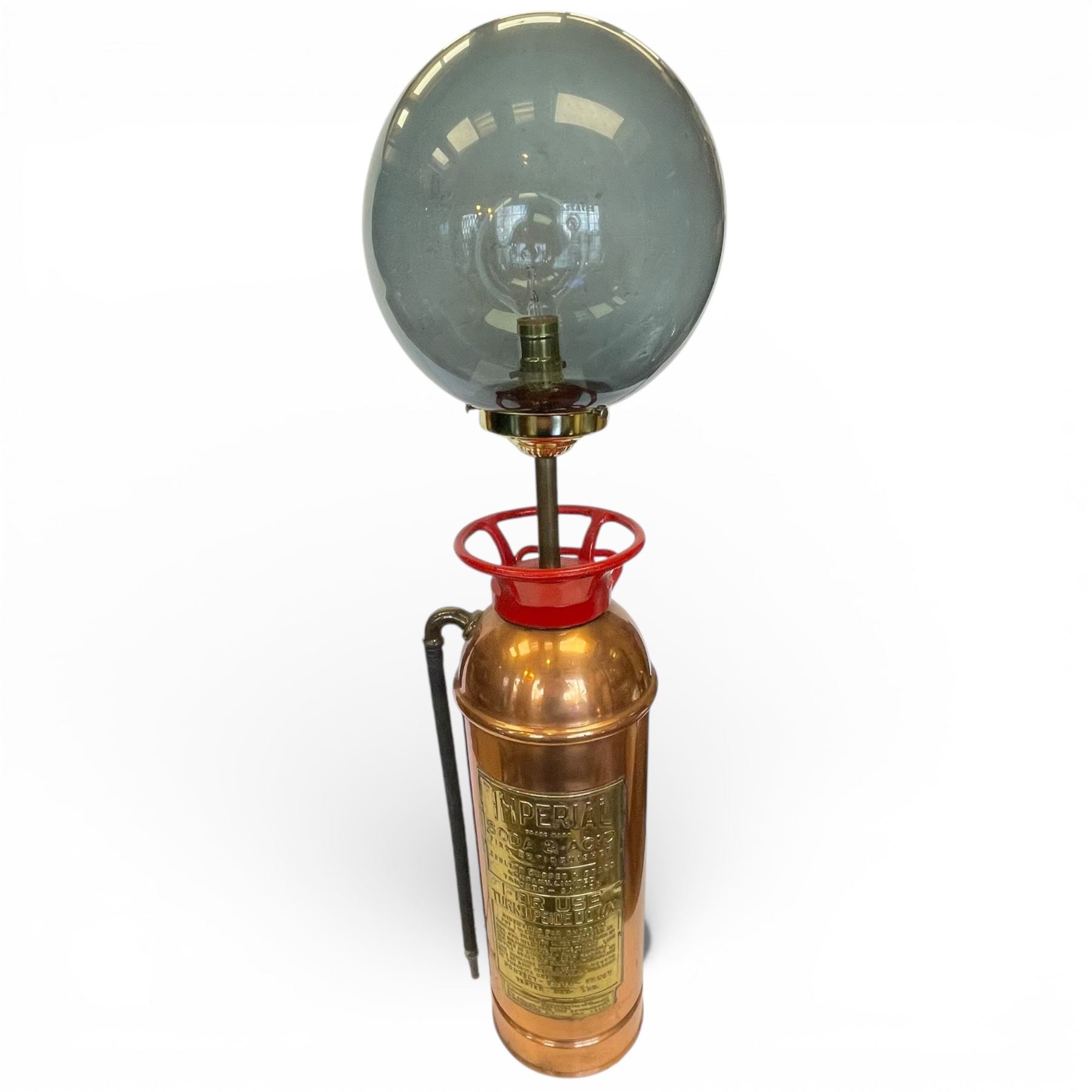 Vintage Imperial brass fire extinguisher converted into a touch activated lamp. Polished brass construction. Height measures 37-Inch. Functional lamp feature integrated onto the extinguisher body. Item is as pictured.