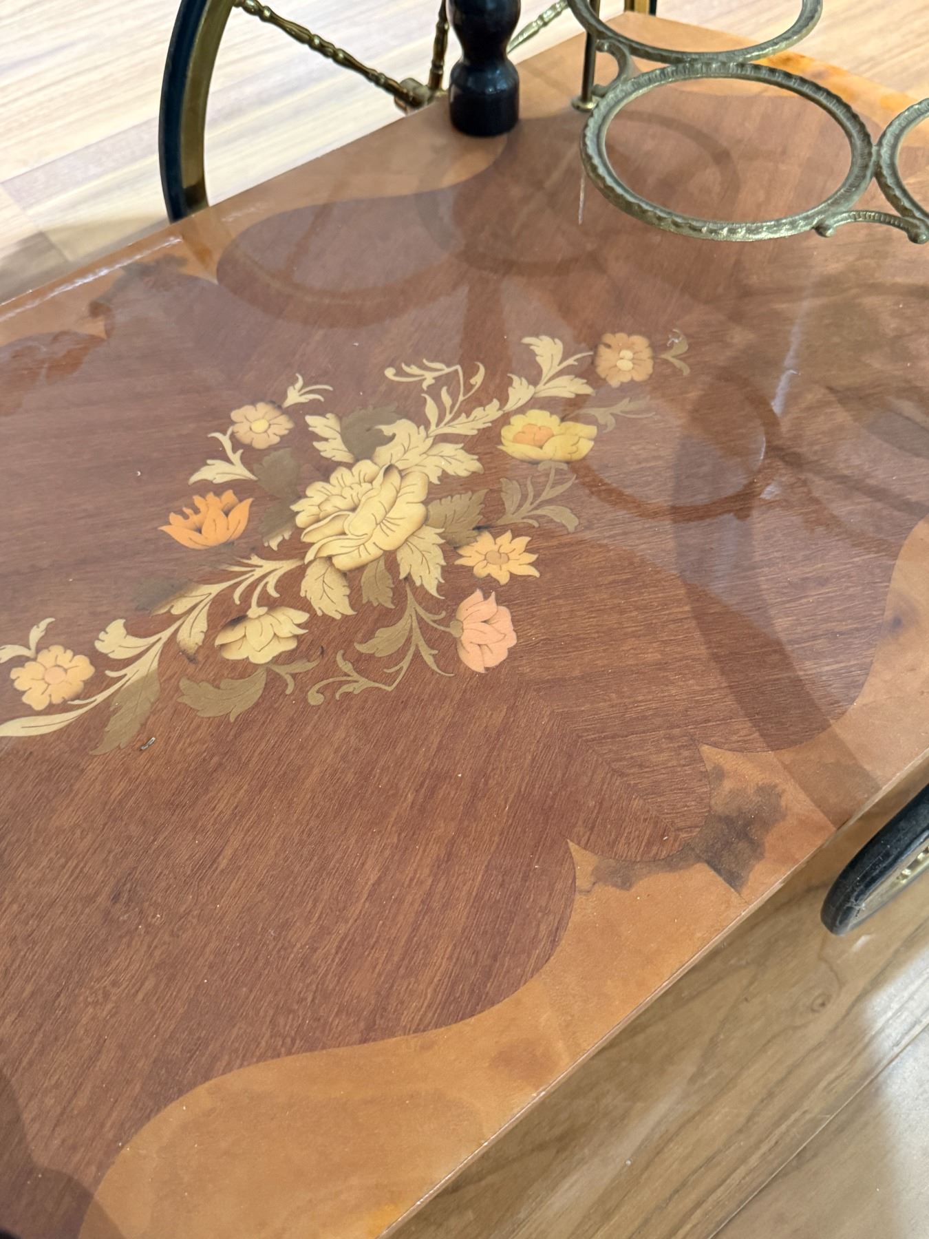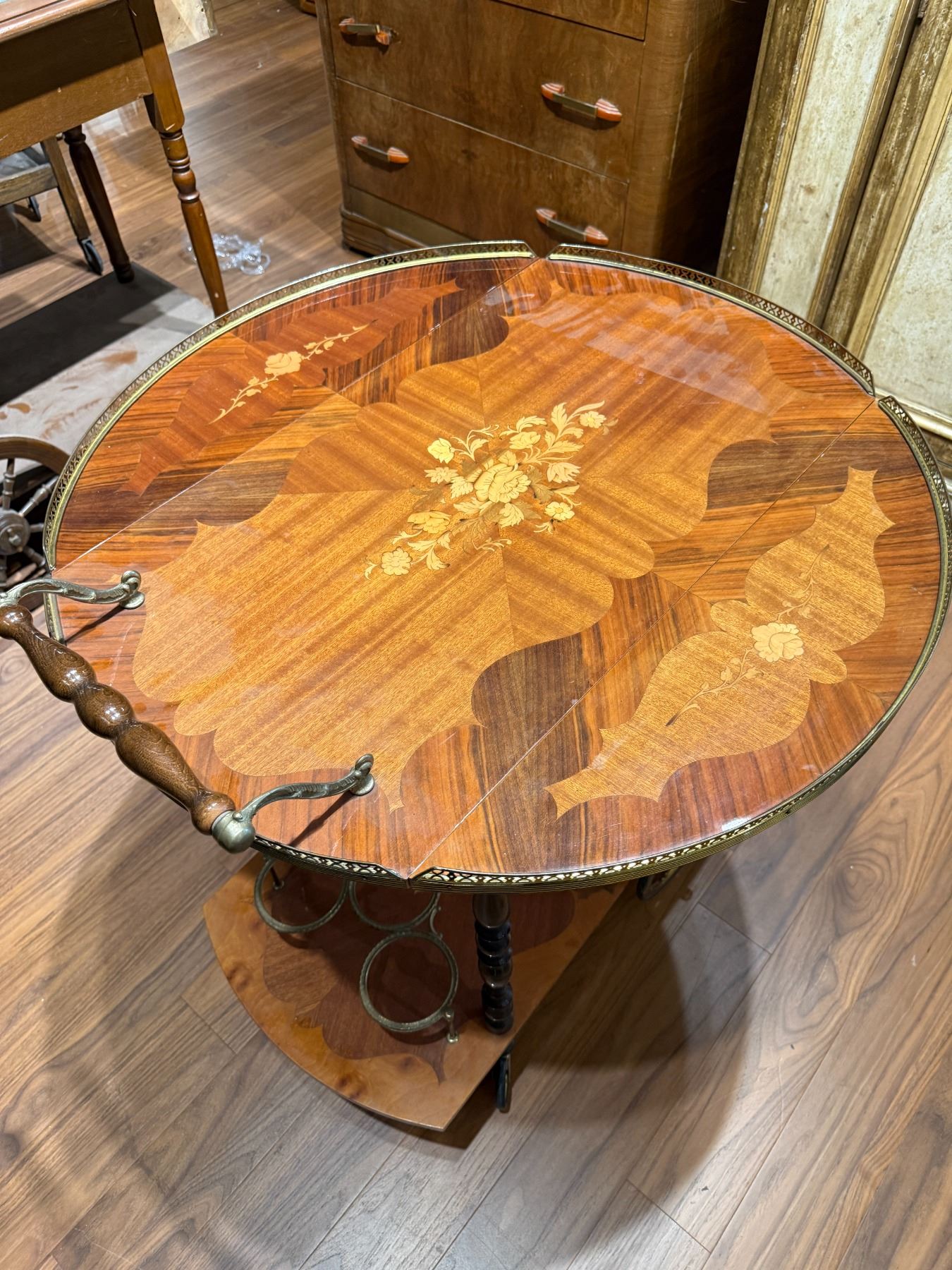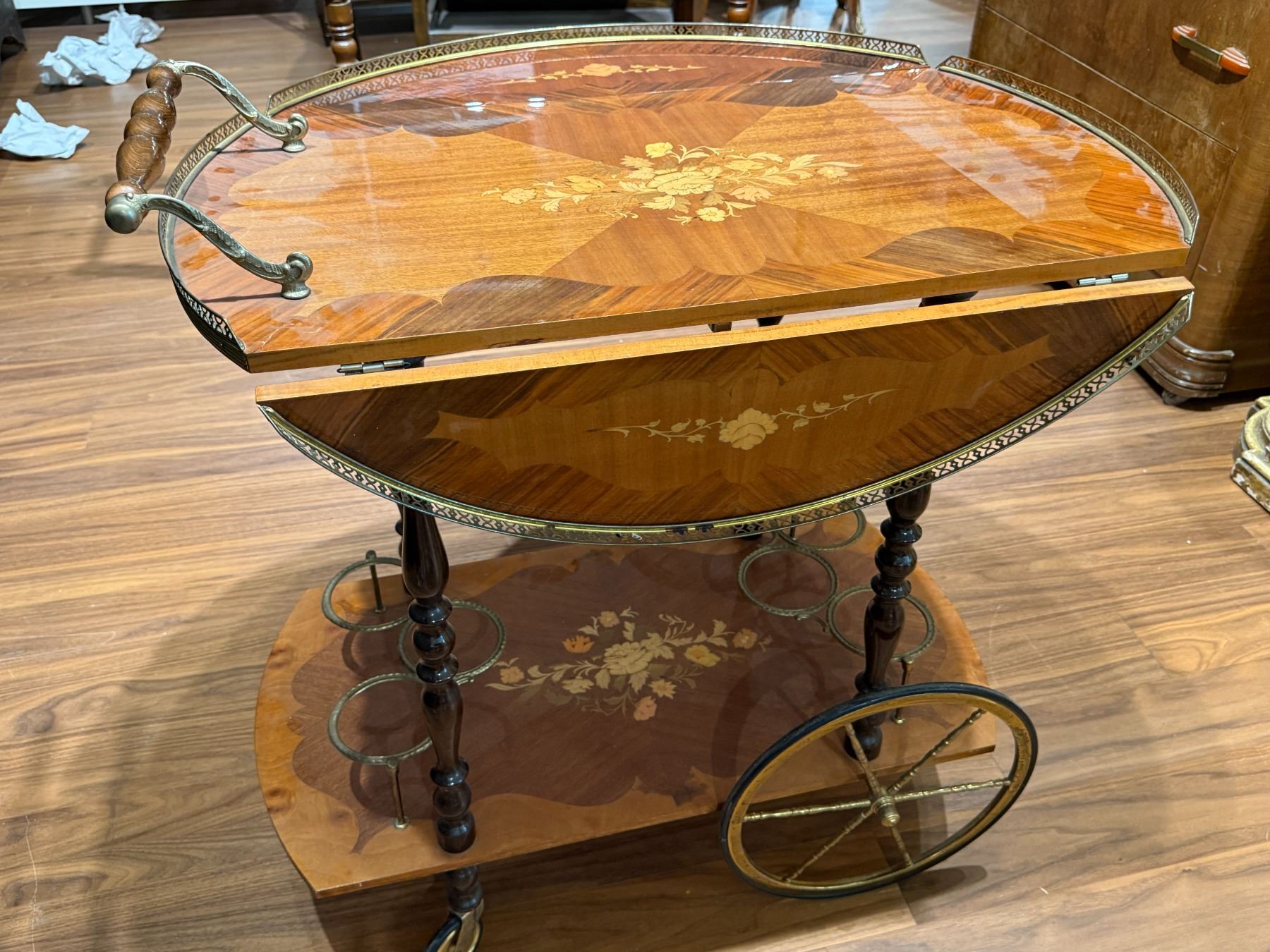 Vintage drop leaf Italian marquetry bar cart featuring intricate inlay design. Measures 29-Inch in height and 30-Inch in diameter. The top tray piece requires reattachment. Item is as pictured.