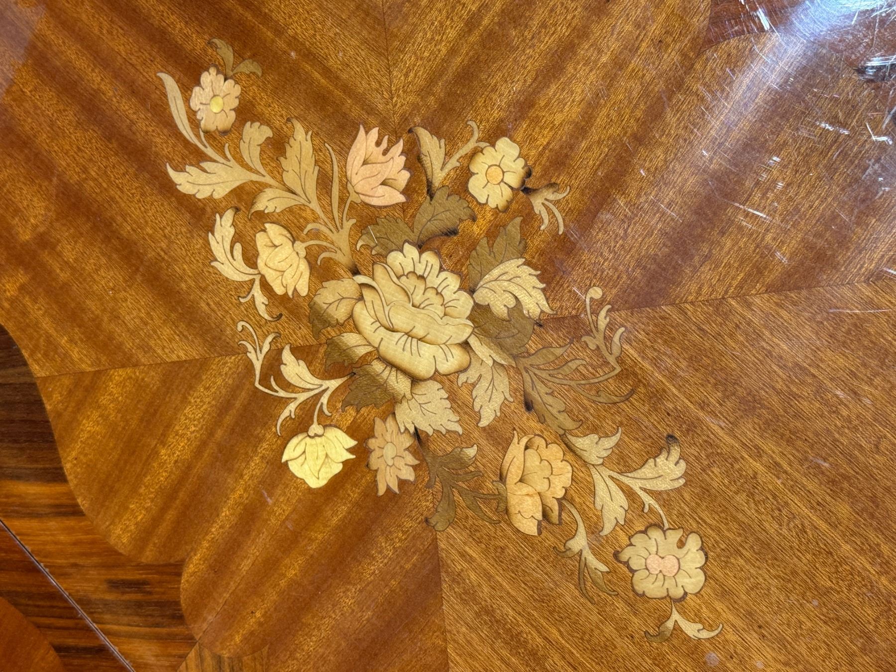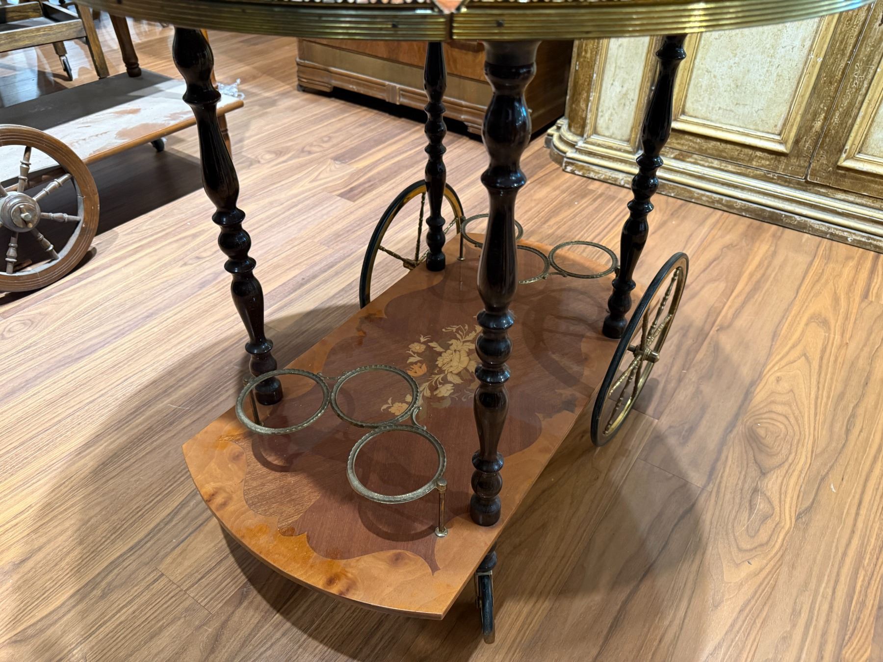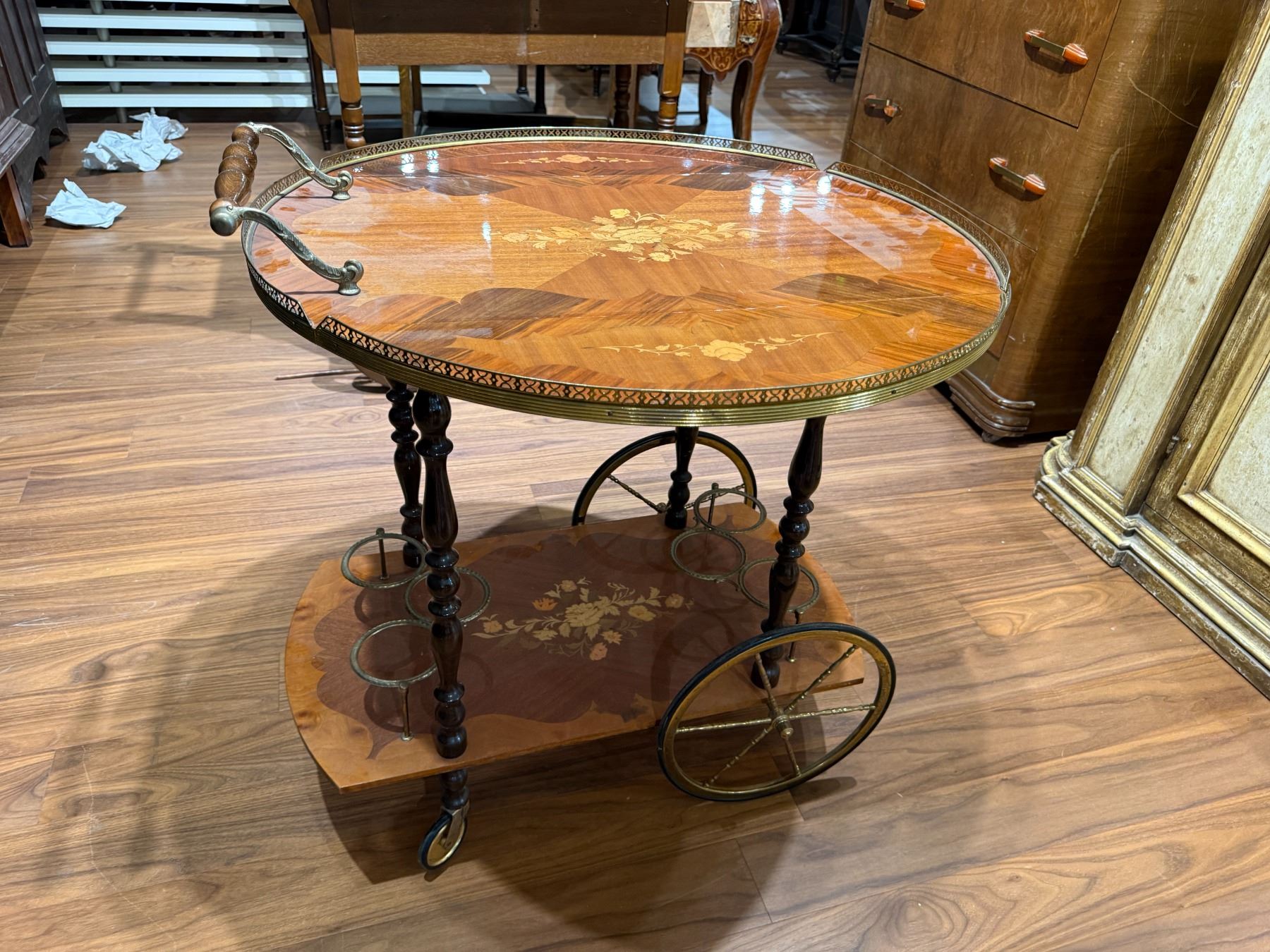 Vintage drop leaf Italian marquetry bar cart featuring intricate inlay design. Measures 29-Inch in height and 30-Inch in diameter. The top tray piece requires reattachment. Item is as pictured.