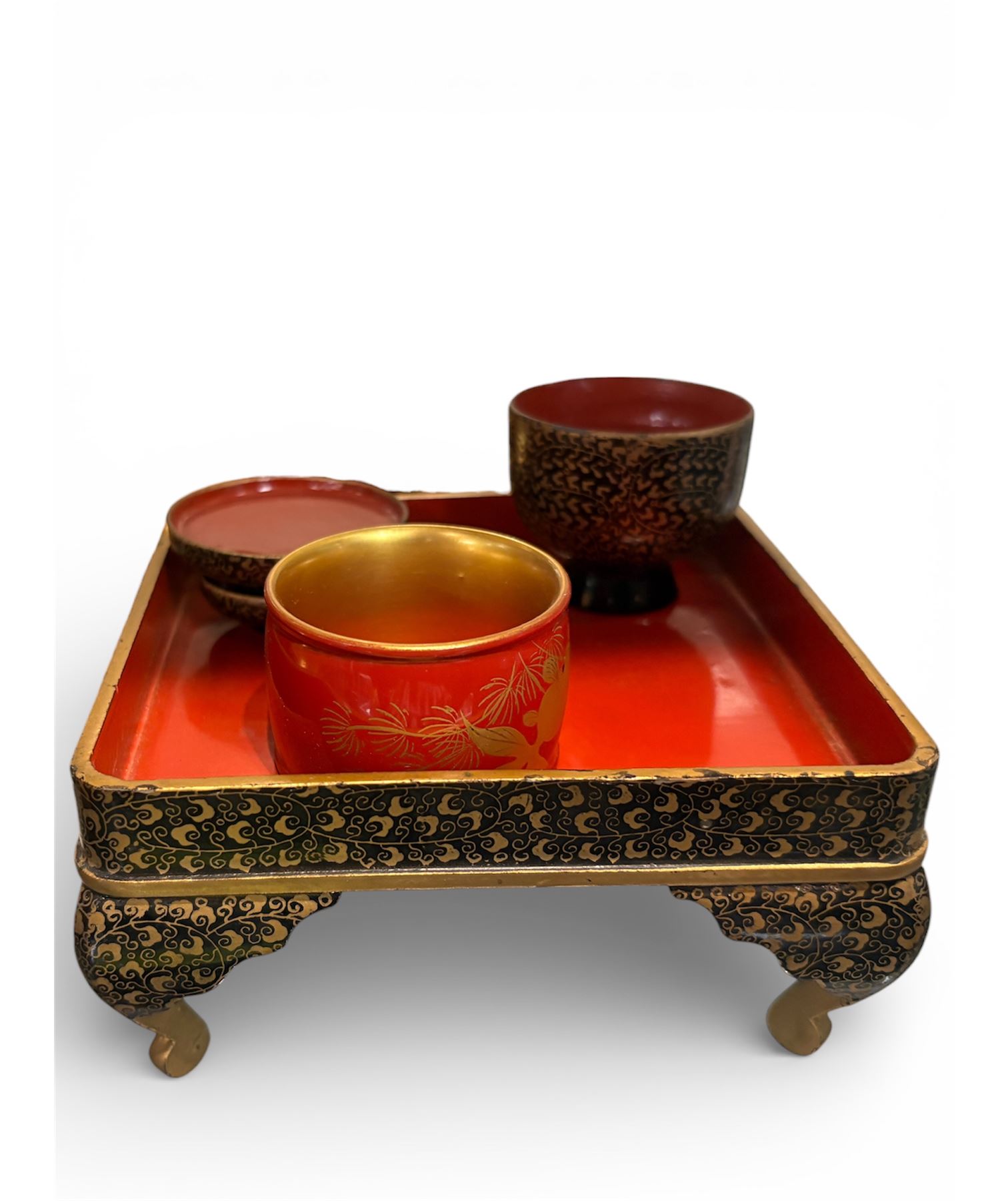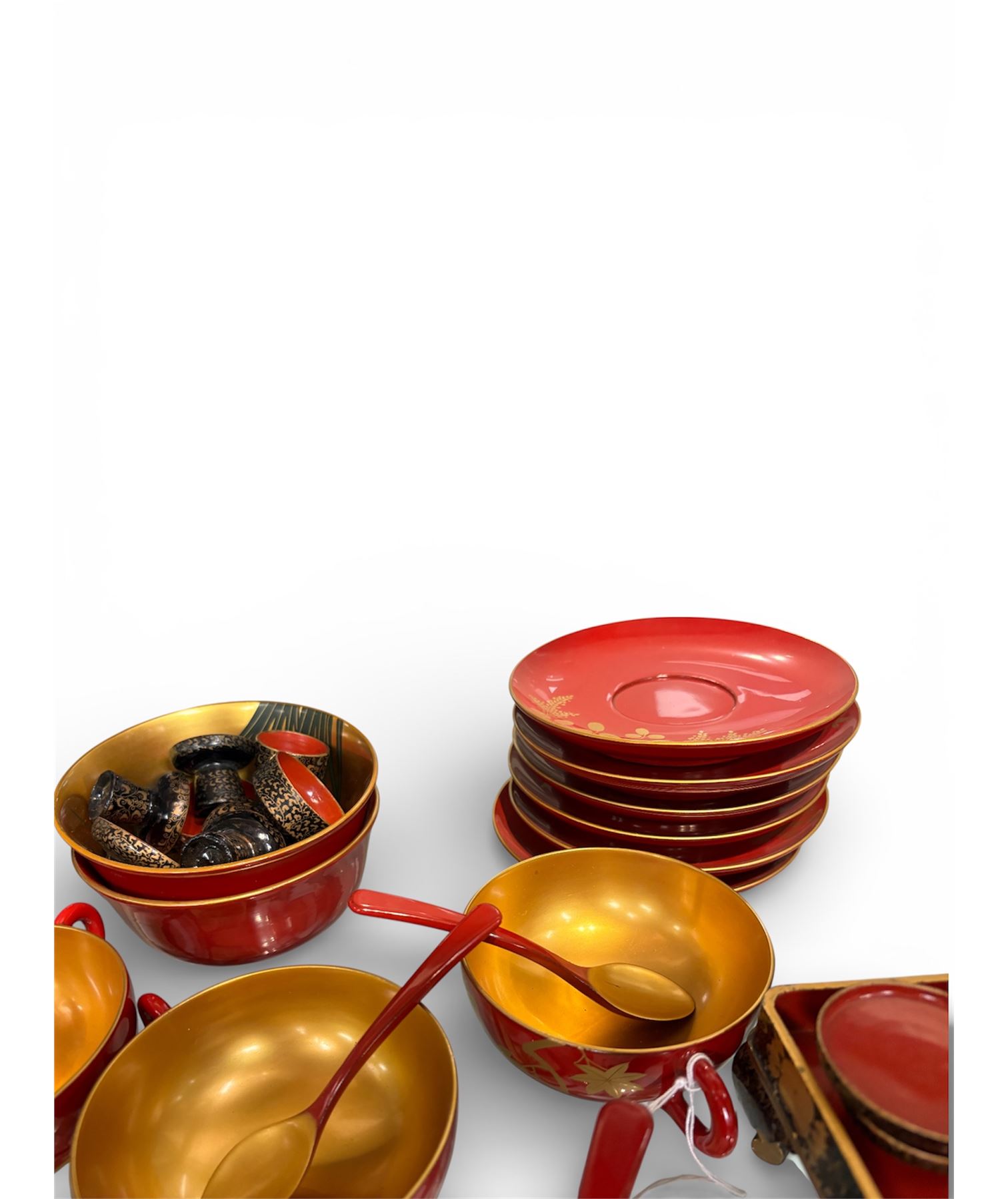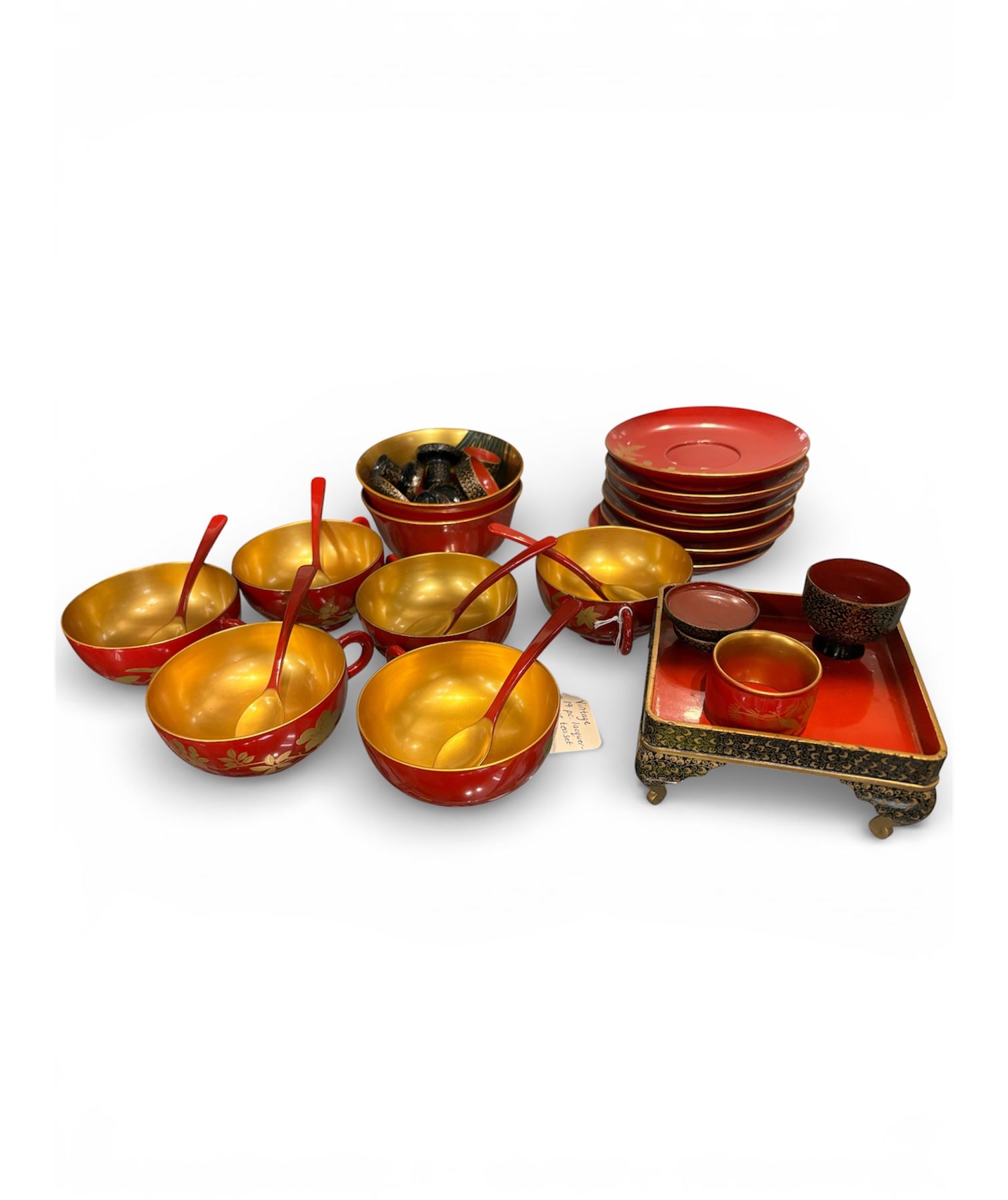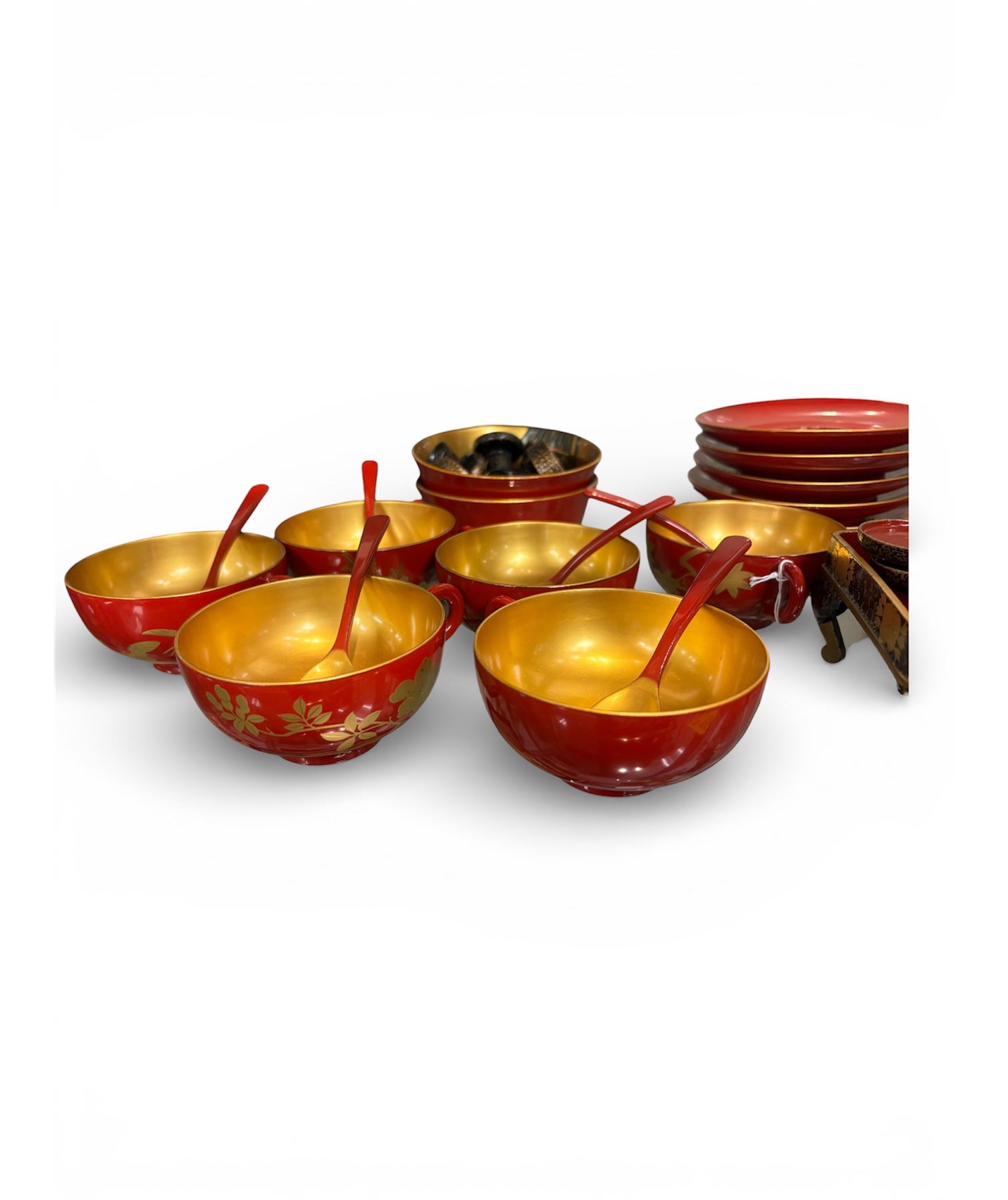 Vintage Japanese lacquerware set featuring a vibrant red and gold color palette with intricate hand-painted floral designs. Likely mid-20th century craftsmanship, showcasing traditional Japanese artistry. The set includes multiple matching pieces, reflecting a cohesive decorative theme.