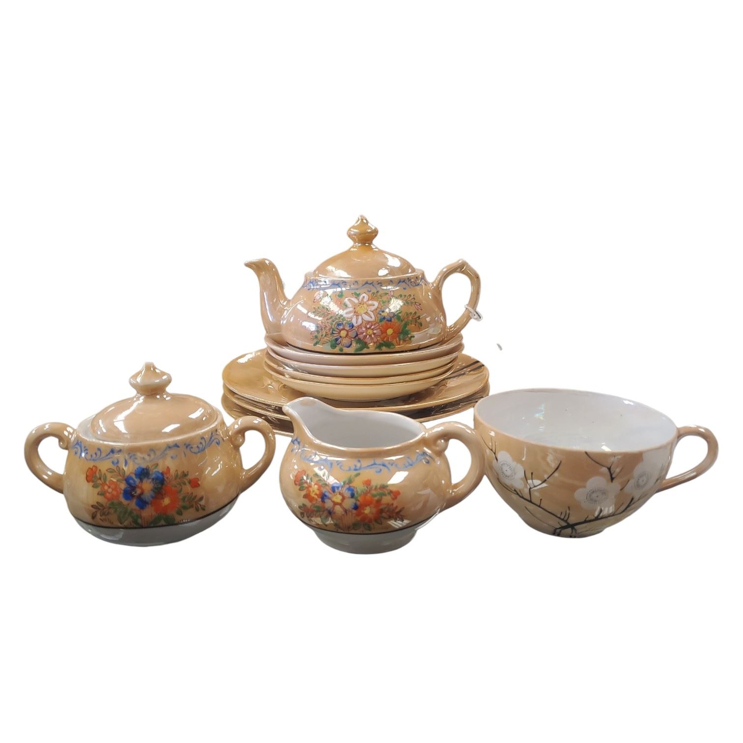 Vintage Japanese Lustreware tea set featuring a teapot, teacup, saucers and plates. Known for its iridescent glaze, Lustreware was highly popular in Japan during the early-to-mid 20th century. This set showcases traditional craftsmanship and design details. Item is as pictured.