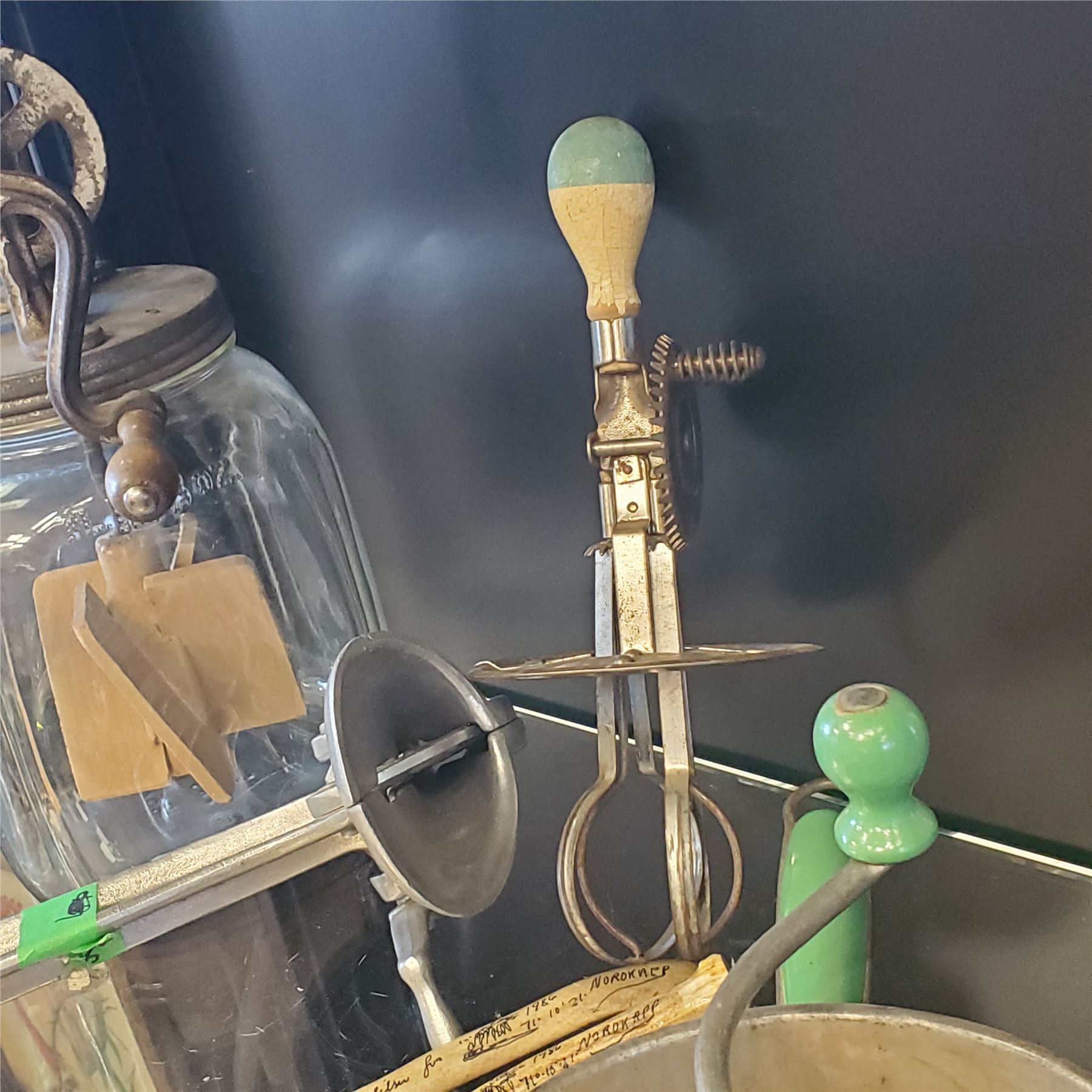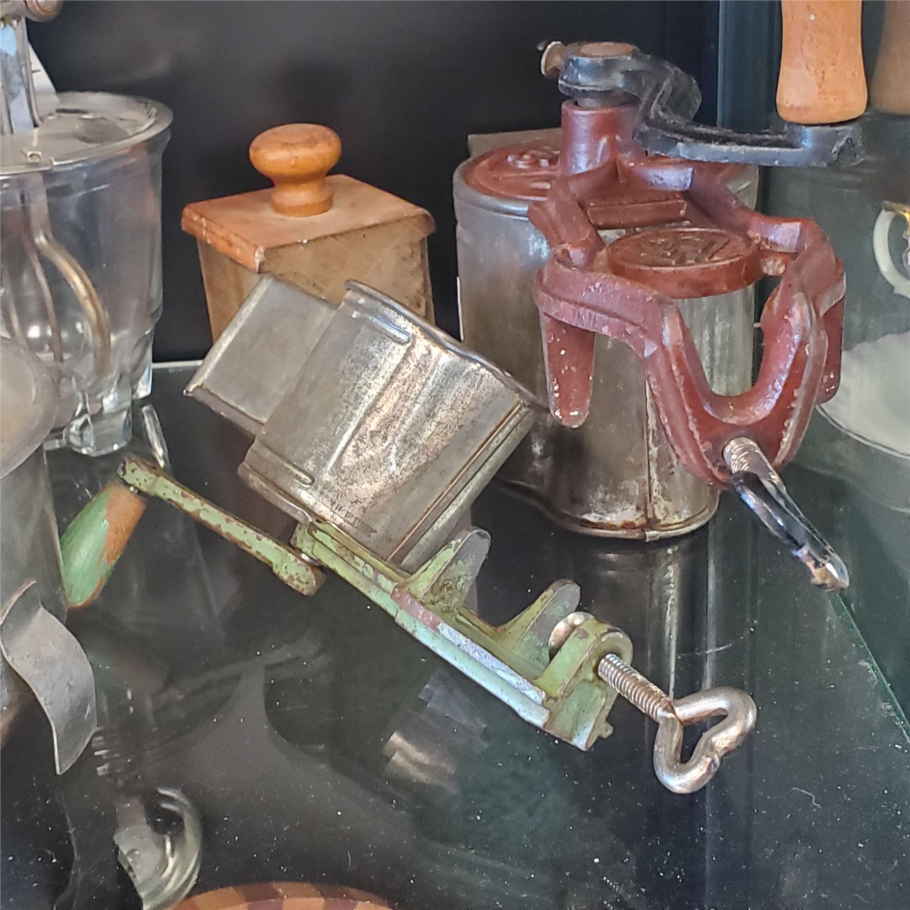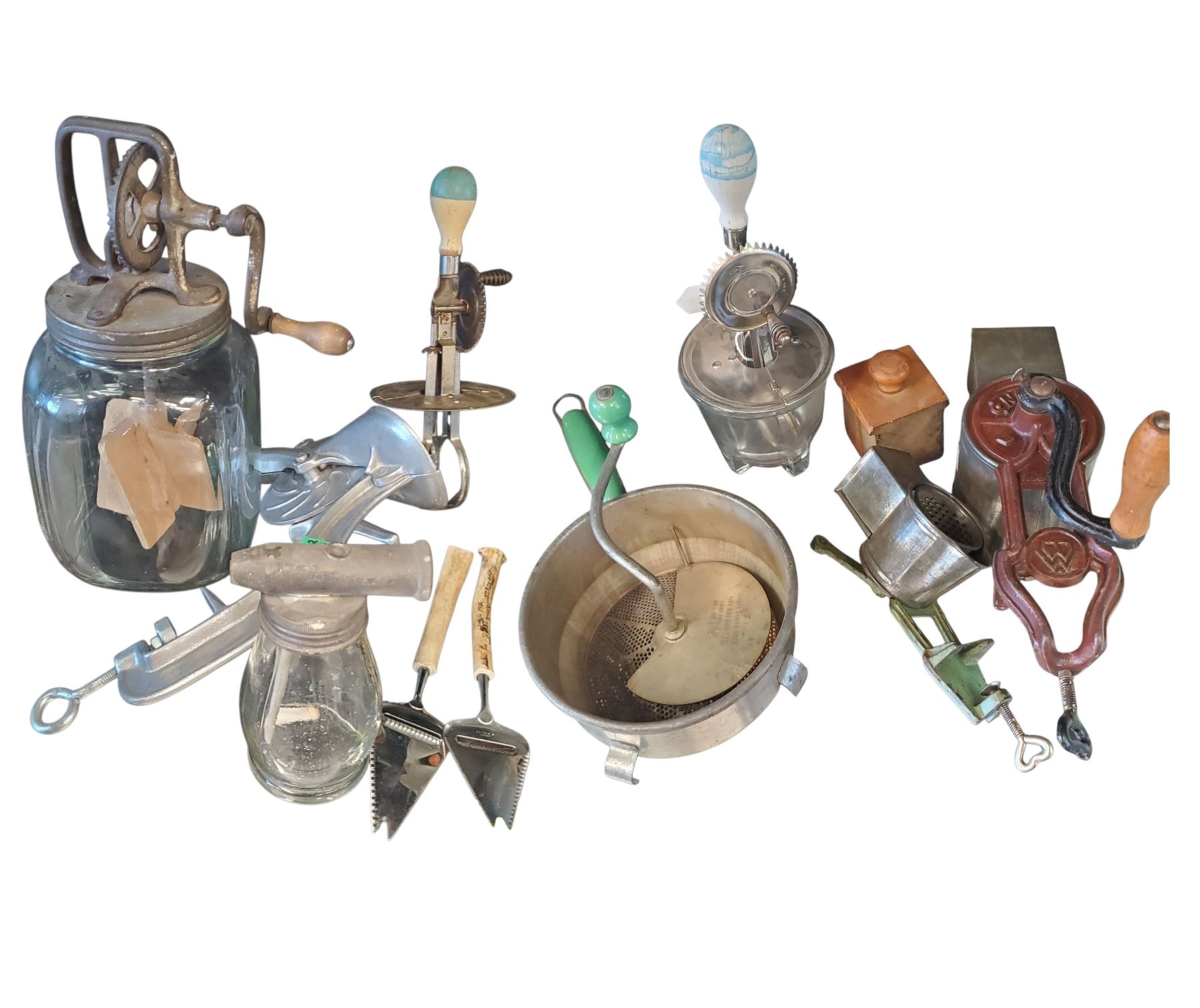 Collection of vintage kitchen items includes a butter churner, mixers, sifters, grinders and slicers. These items showcase traditional designs and functional elements used in earlier kitchen tools. All pieces are as pictured and reflect age-appropriate wear. Perfect for display or practical use.