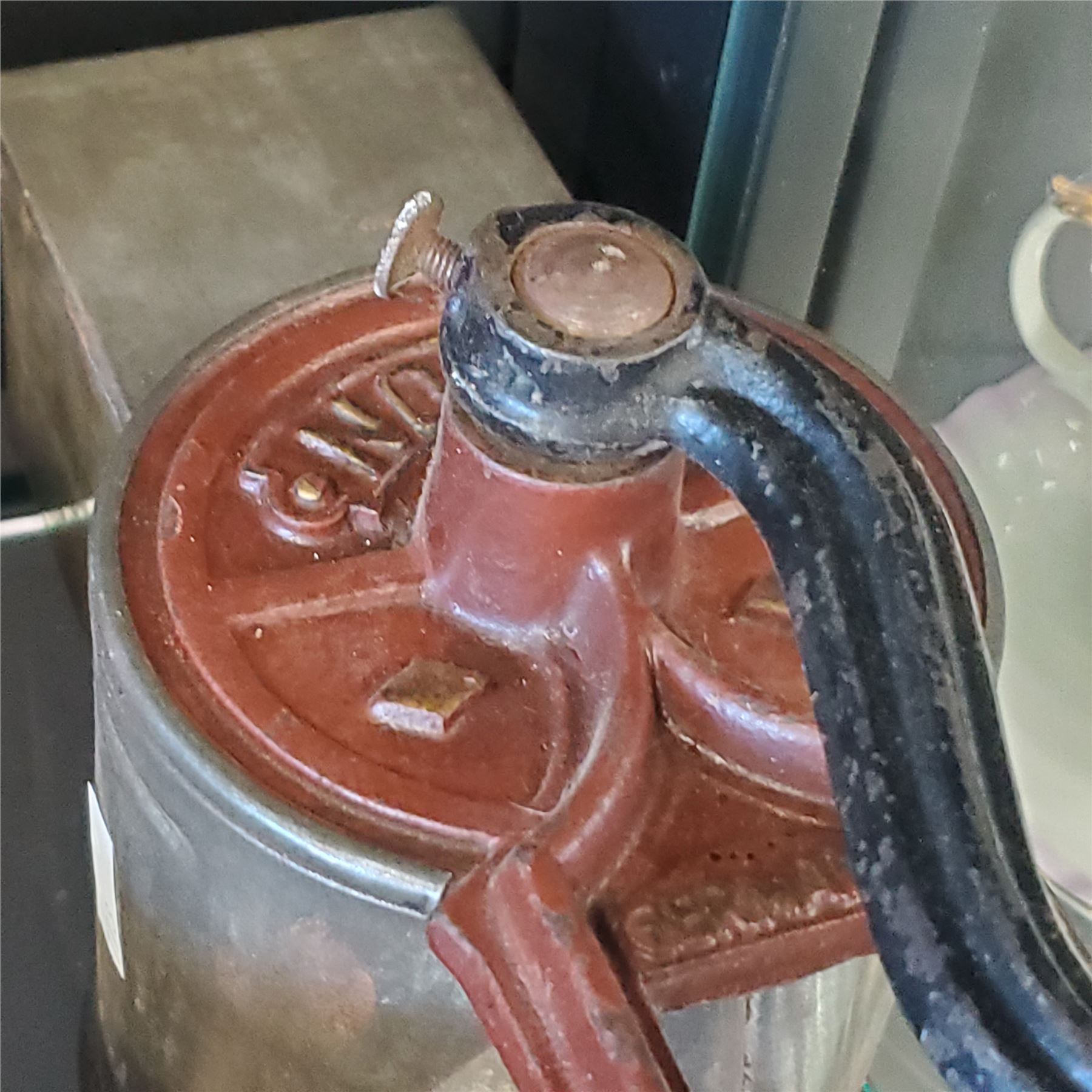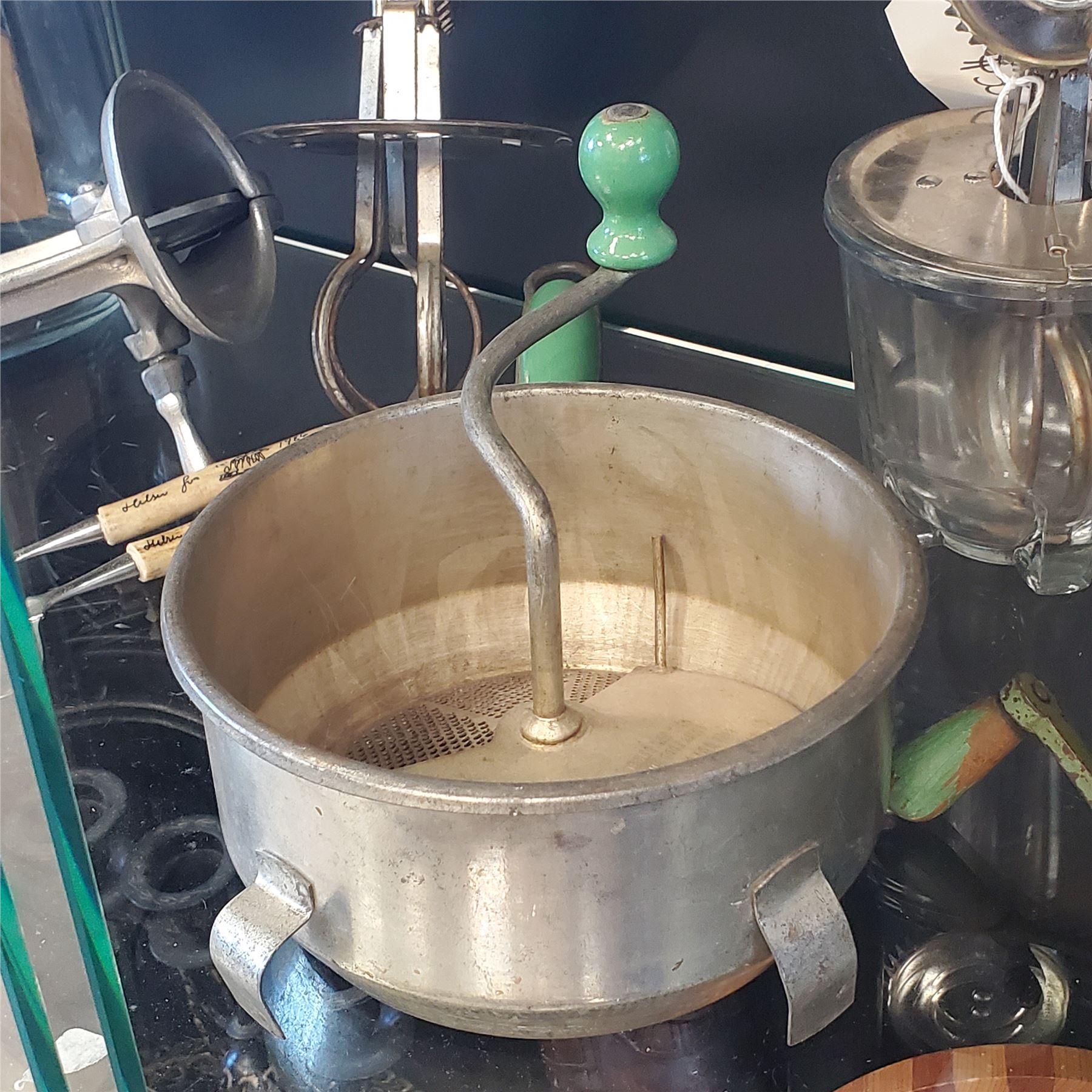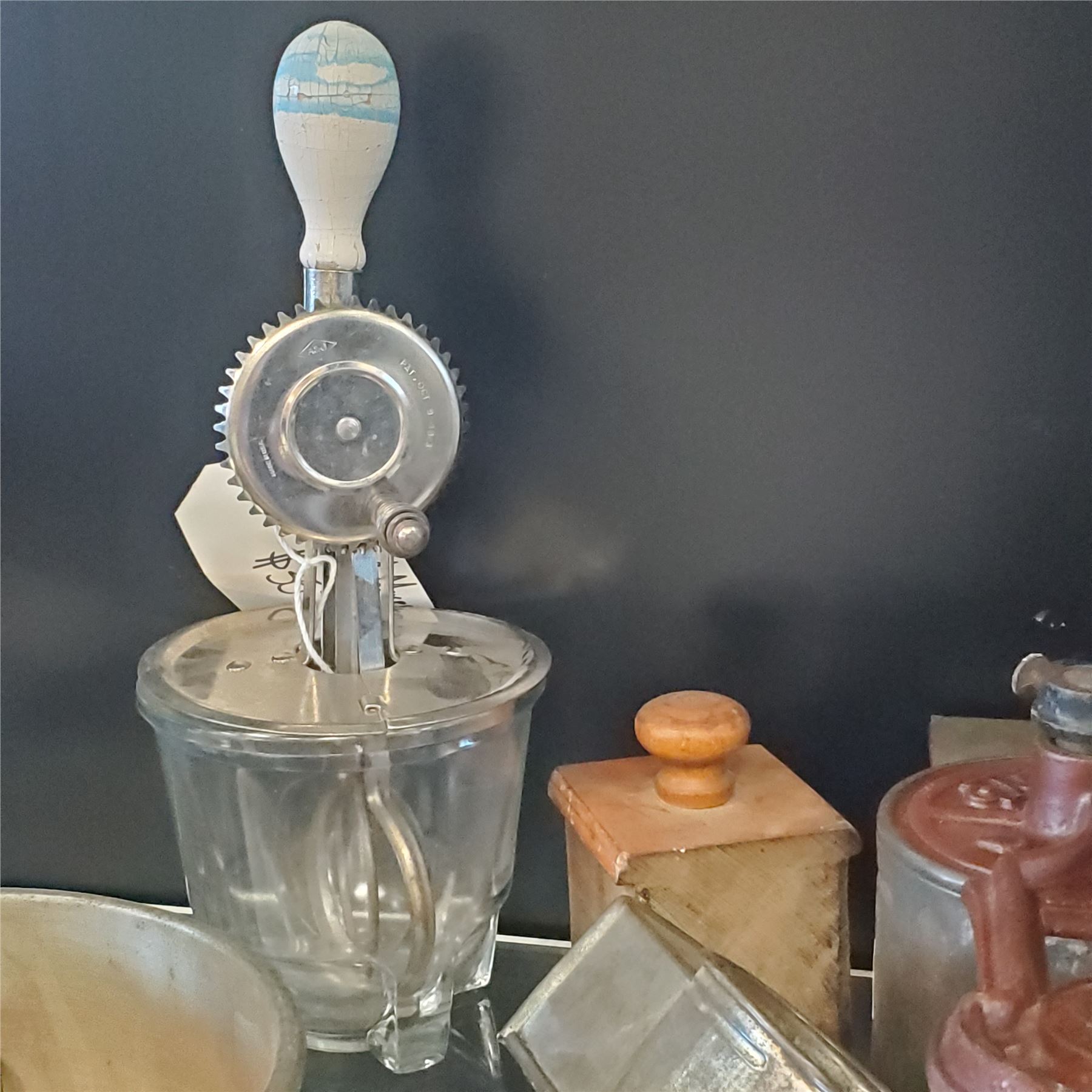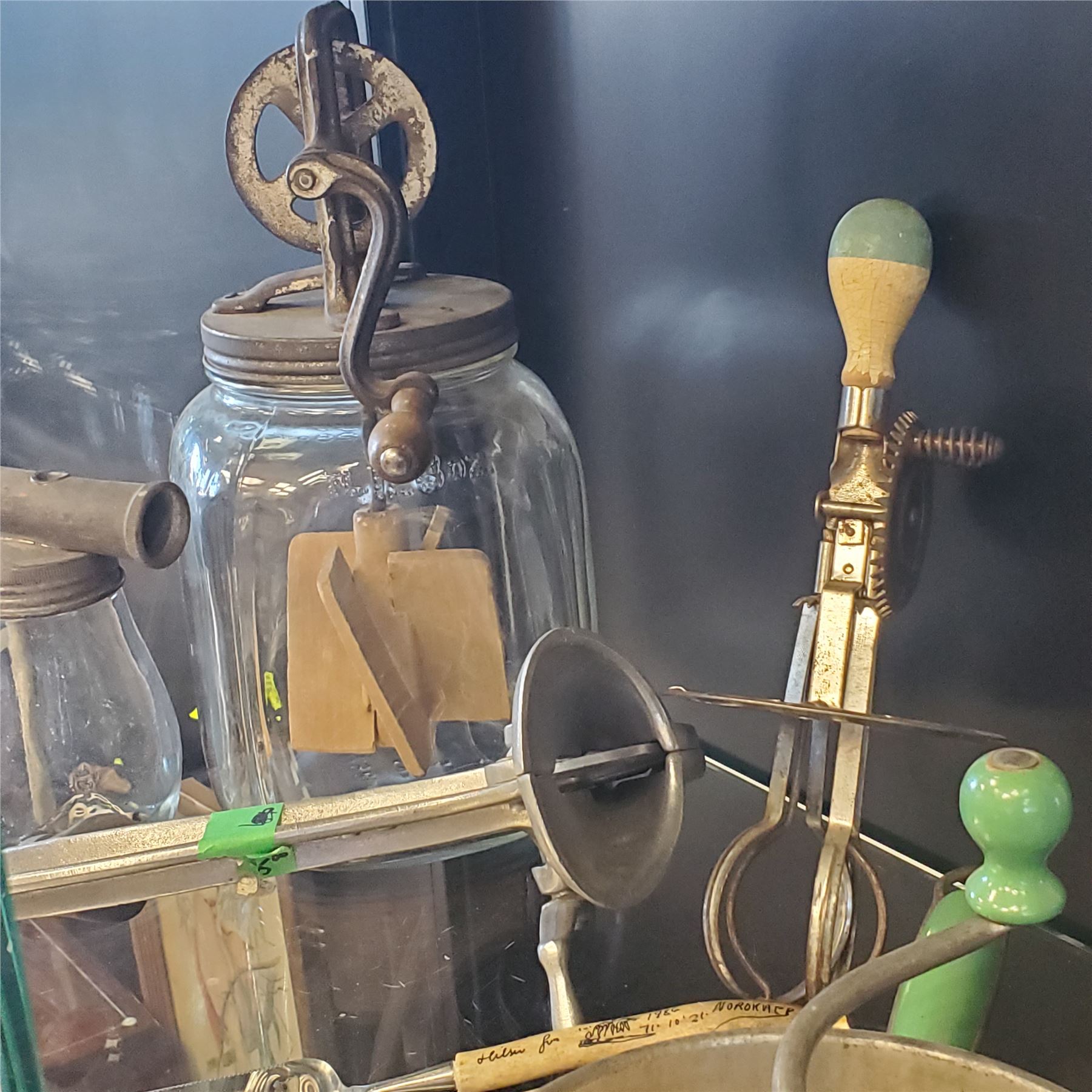 Collection of vintage kitchen items includes a butter churner, mixers, sifters, grinders and slicers. These items showcase traditional designs and functional elements used in earlier kitchen tools. All pieces are as pictured and reflect age-appropriate wear. Perfect for display or practical use.