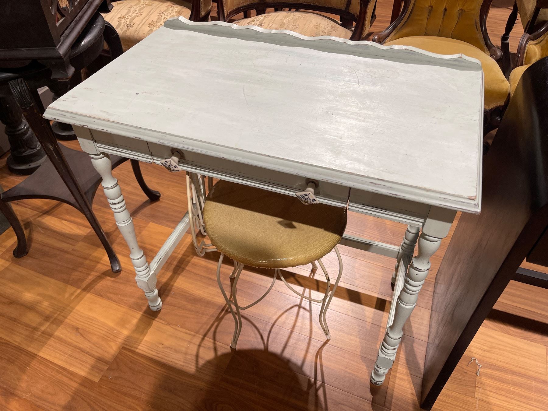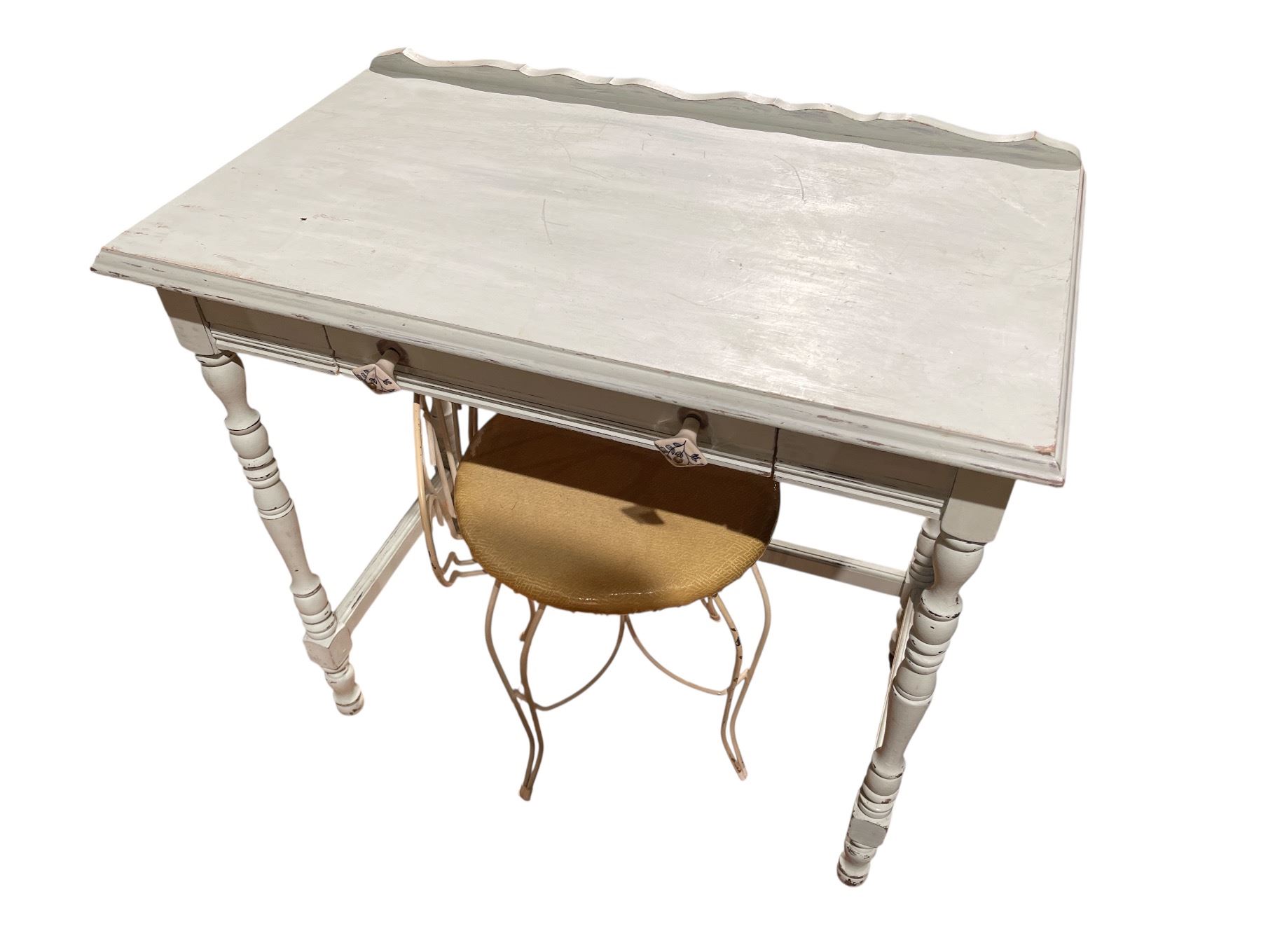Vintage light blue wood table paired with a short backed wire chair. Table dimensions are 32-Inch length, 18-Inch width, and 29.5-Inch height. Features a classic design suitable for various settings. Item is as pictured.