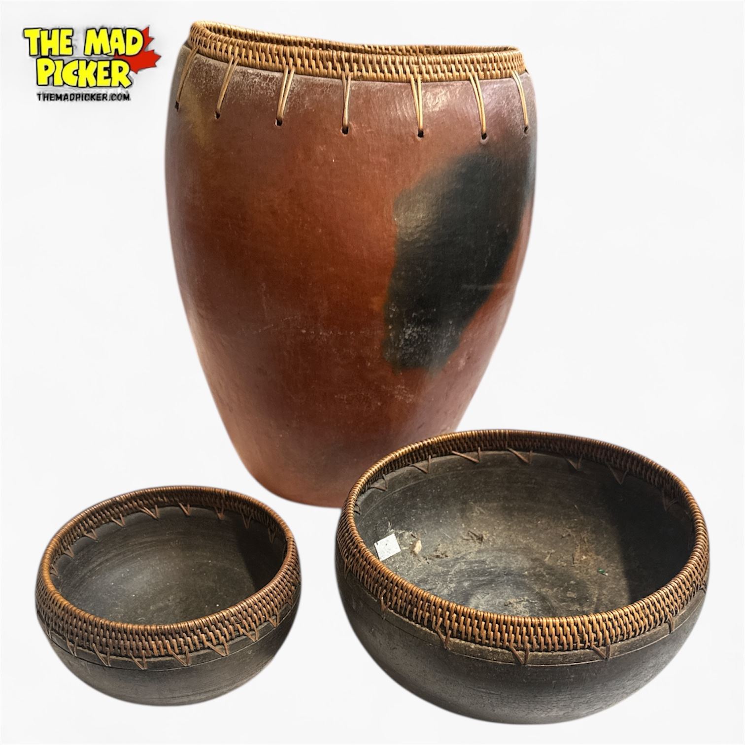 Set of vintage handcrafted Lombok terracotta pottery featuring one large vase and two smaller bowls. Pieces have a natural reddish-brown finish with black burn marks. Decorated with finely woven rattan rims. Represents distinctive art pottery style. Collectible vintage items from Lombok, Indonesia.