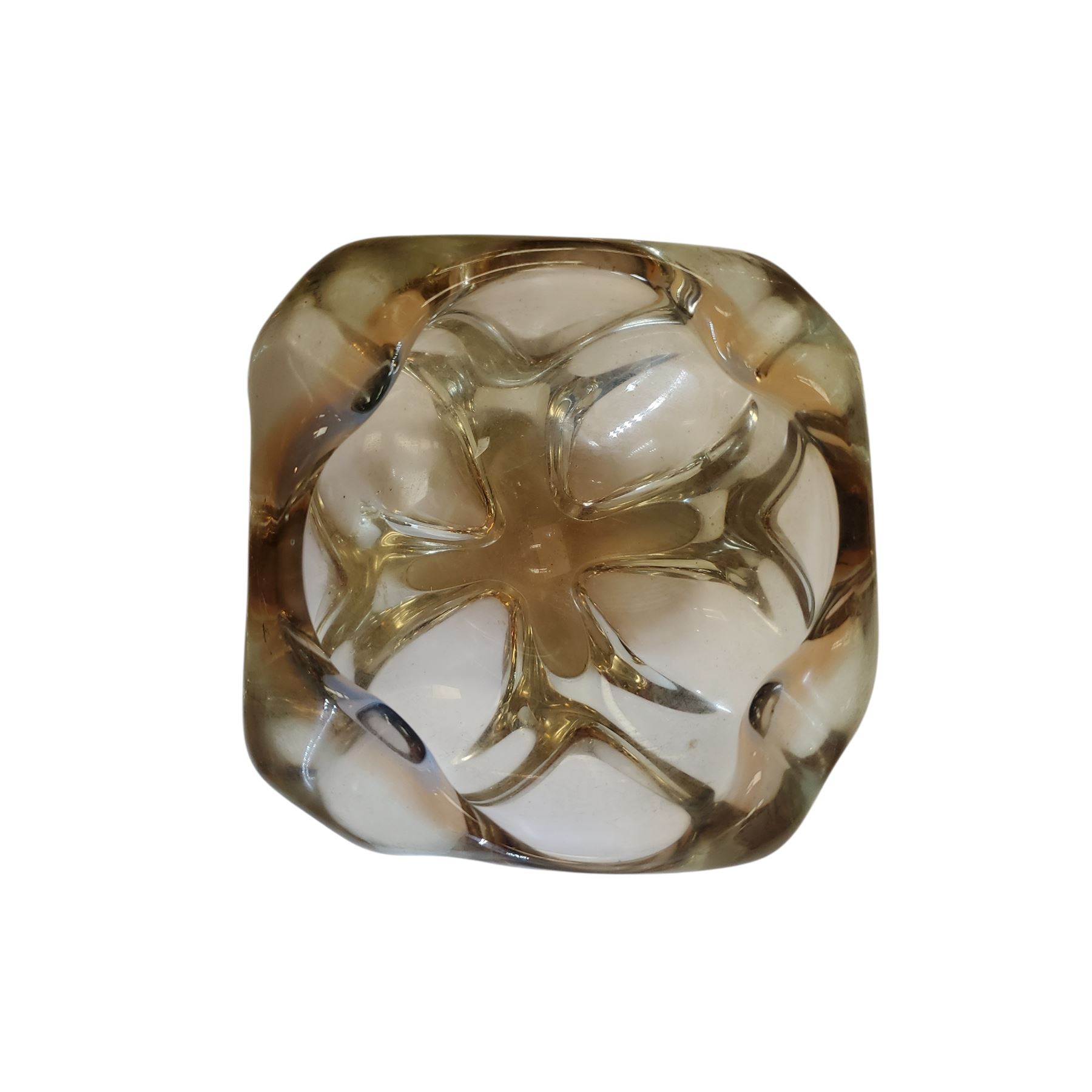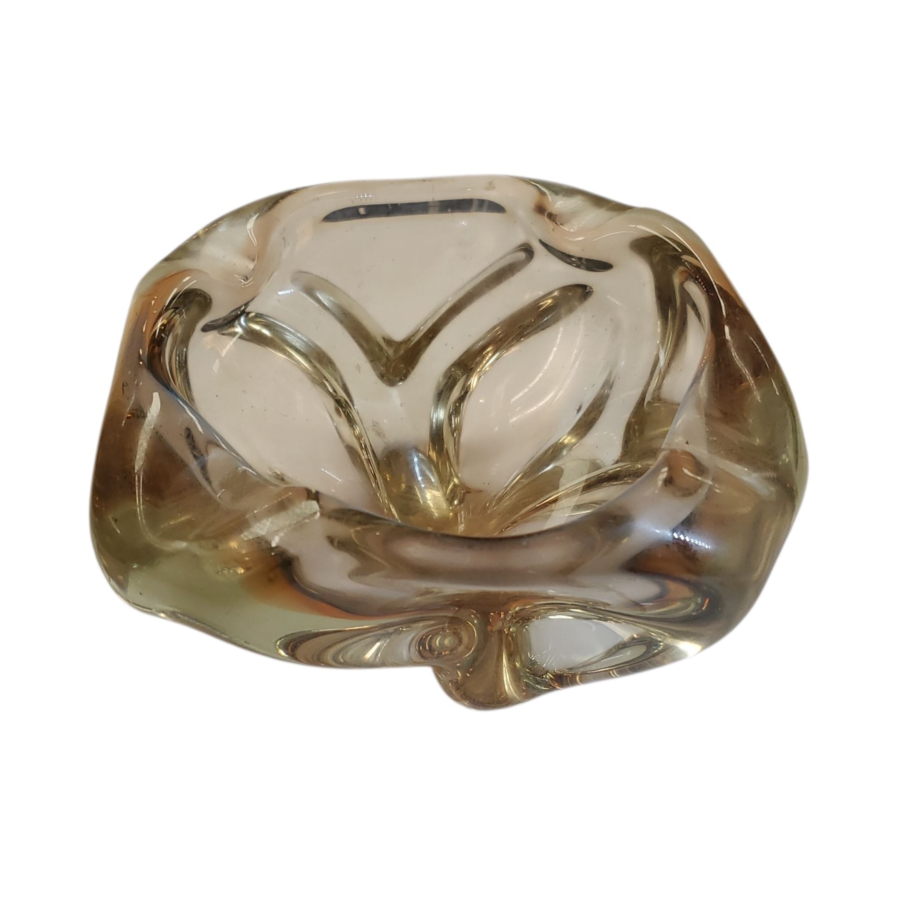 Vintage Mid-Century Modern hand-blown art glass ashtray from the 1960s-70s. Organic freeform design with translucent light brown, amber tint. Features multiple rest points, typical of MCM biomorphic style. Attributed to Chalet Glass (Canada) or Seguso (Murano, Italy). Unsigned.
