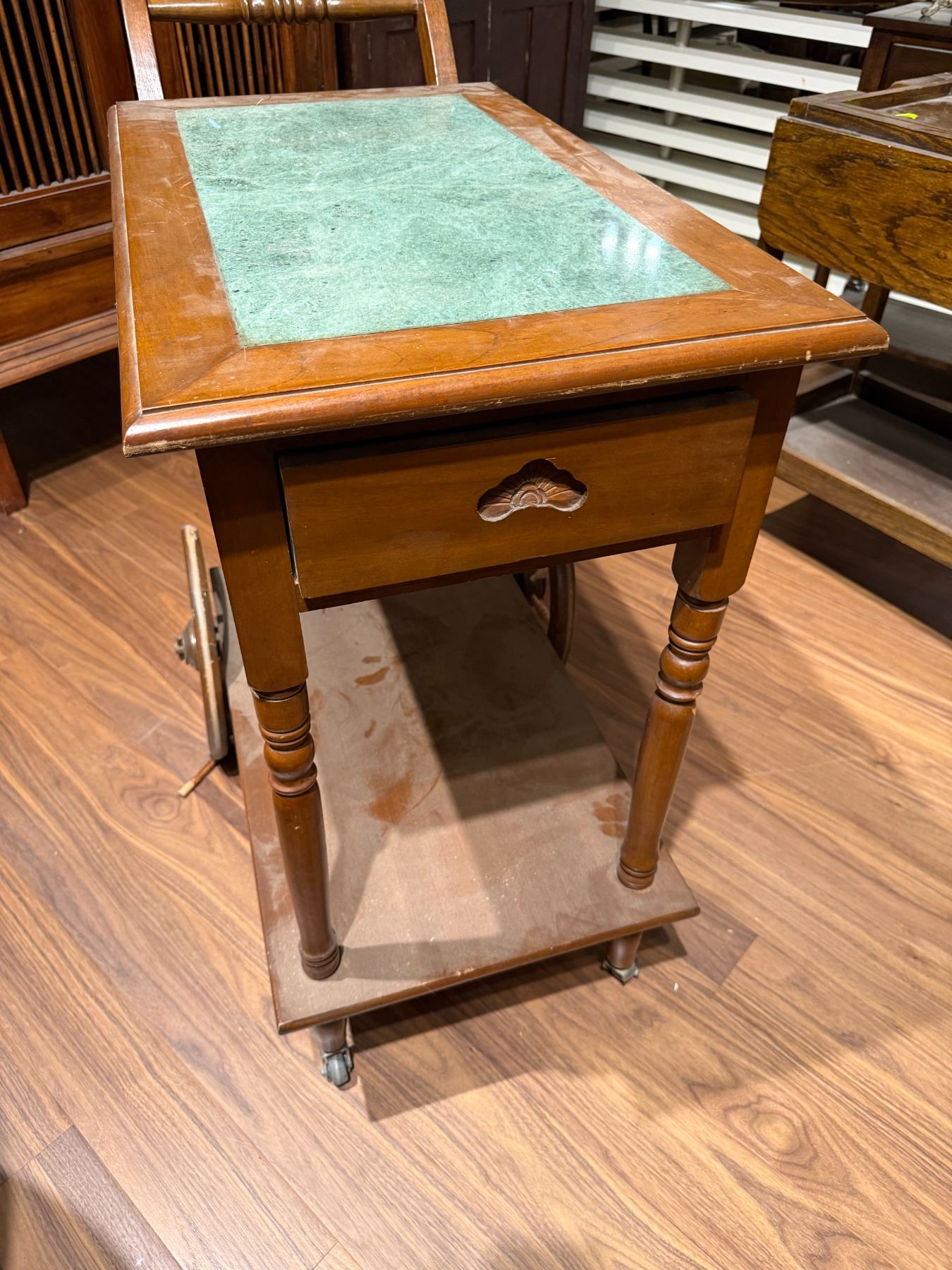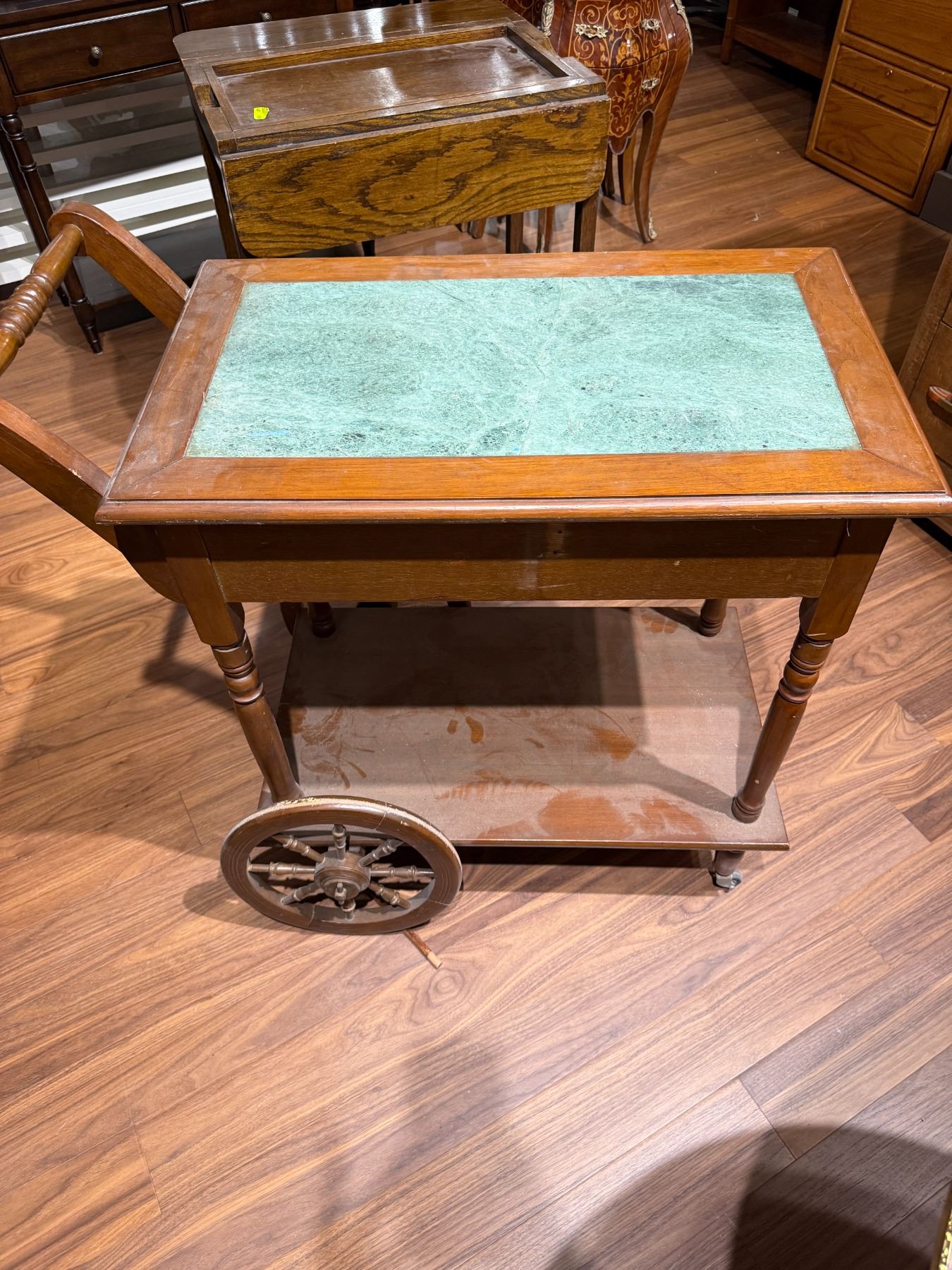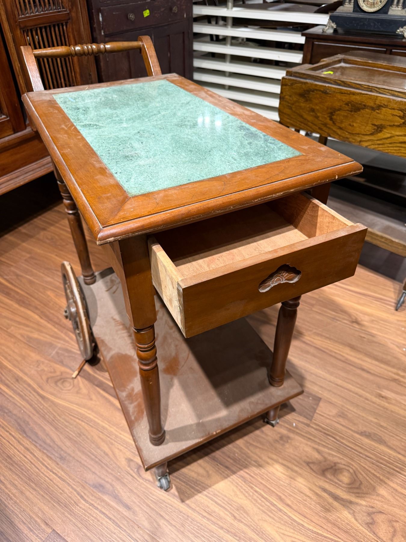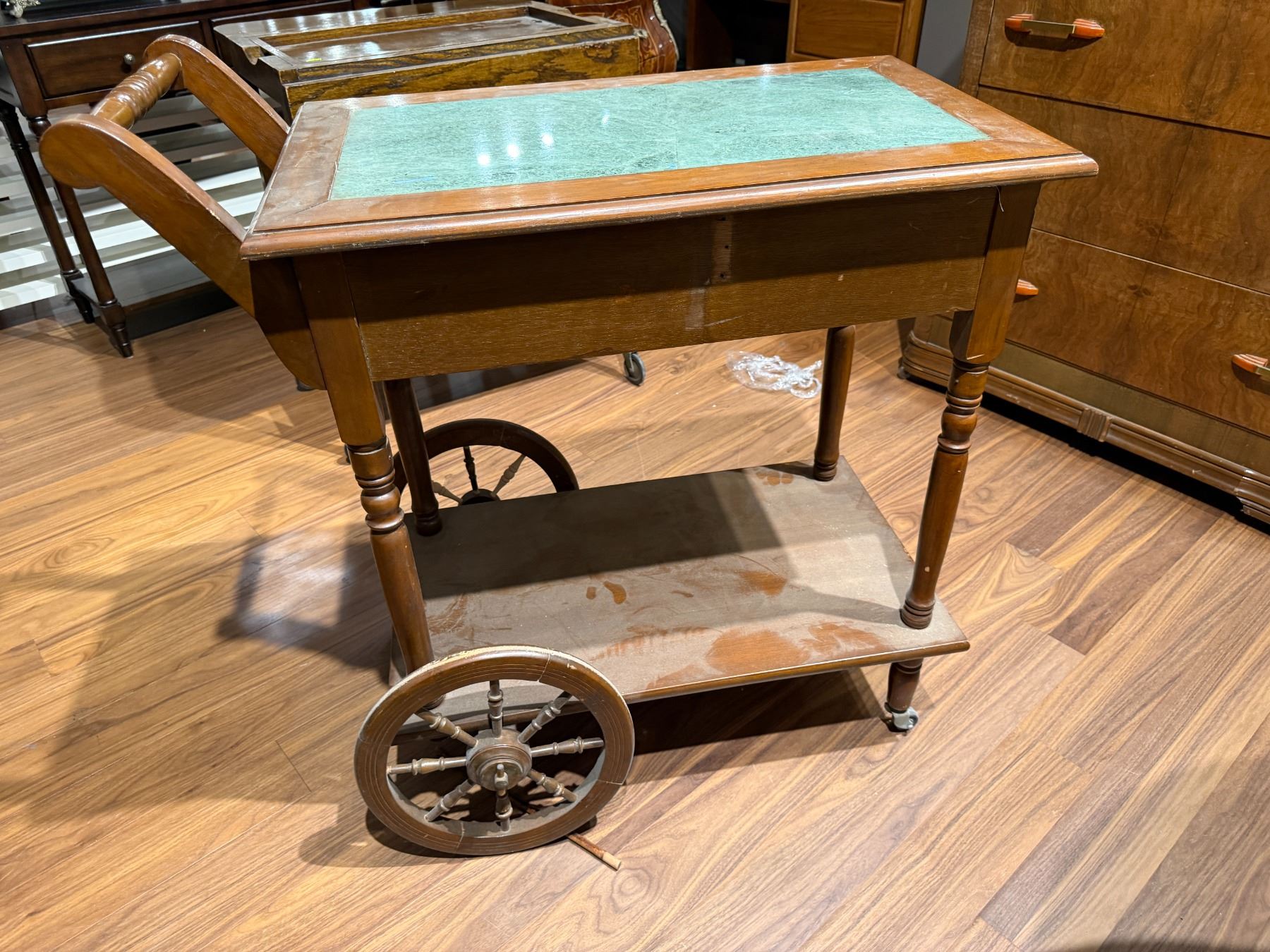 Vintage tea trolley featuring a marble top with overall dimensions of 34-Inch length, 17.5-Inch width, and 35.5-Inch height. Dimensions are including the handle. Designed for functional and decorative use, this piece combines timeless style with practicality. Item is as pictured.