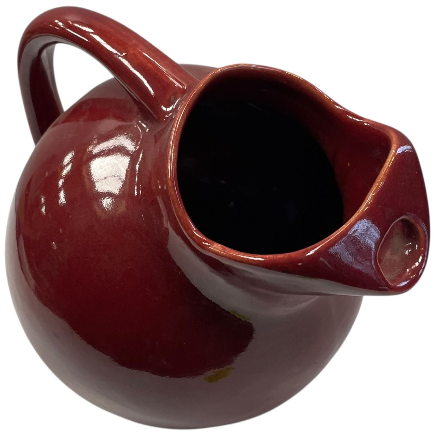 Vintage Medalta Pottery 'Ball' Pitcher produced in Medicine Hat, Alberta. Features a rounded body, molded handle, and built-in ceramic ice lip. Finished in rich Oxblood Red glaze. Measures 7.5-Inch in height. Classic example of Canadian utilitarian and decorative pottery.