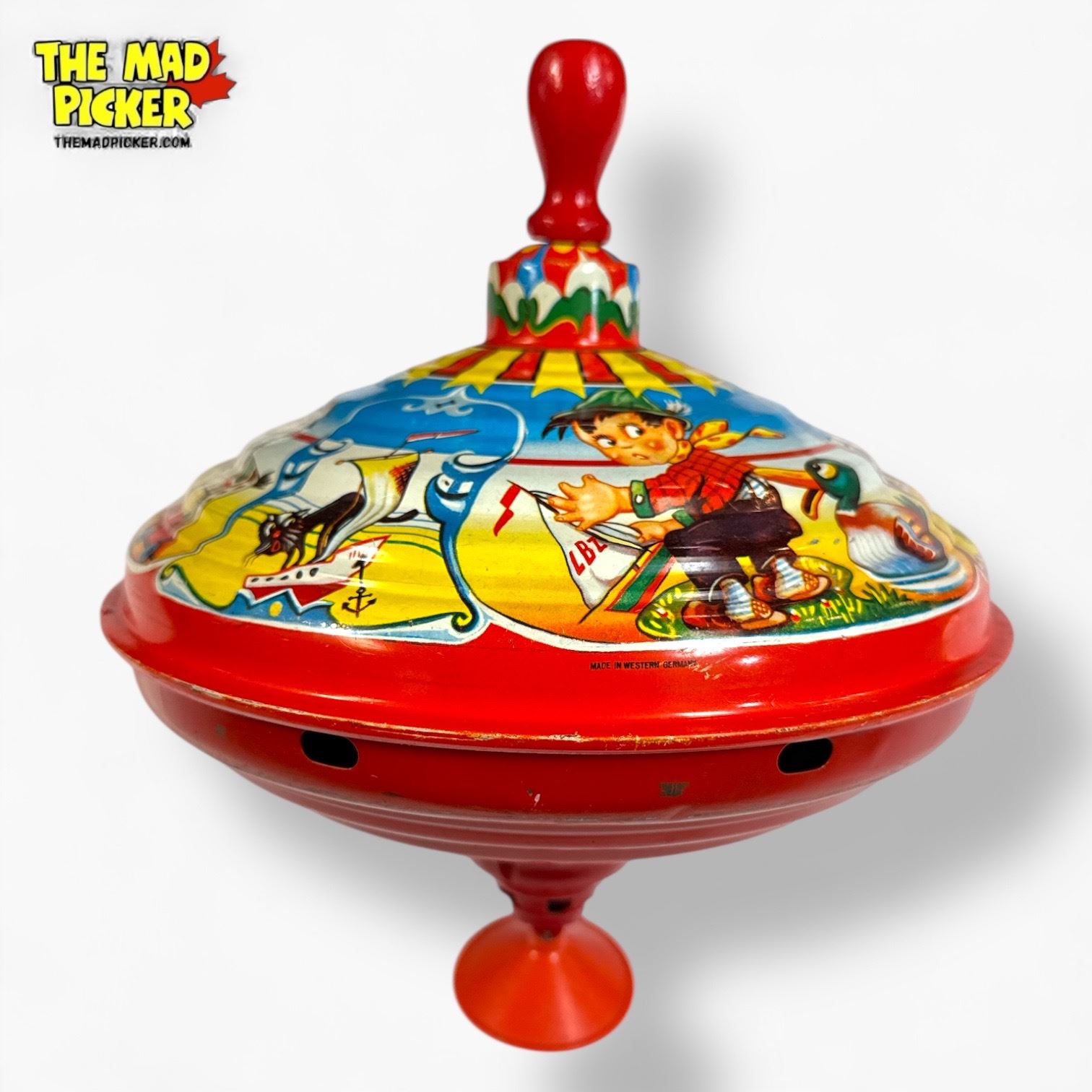 Vintage tin spinning top from the mid-20th century, made in Western Germany. Features colorful lithographed illustrations of children in a Western or circus theme. Operates by pushing the wooden handle up and down to spin and produce a humming sound. Similar to designs by Ohio Art, Chein, and LBZ.