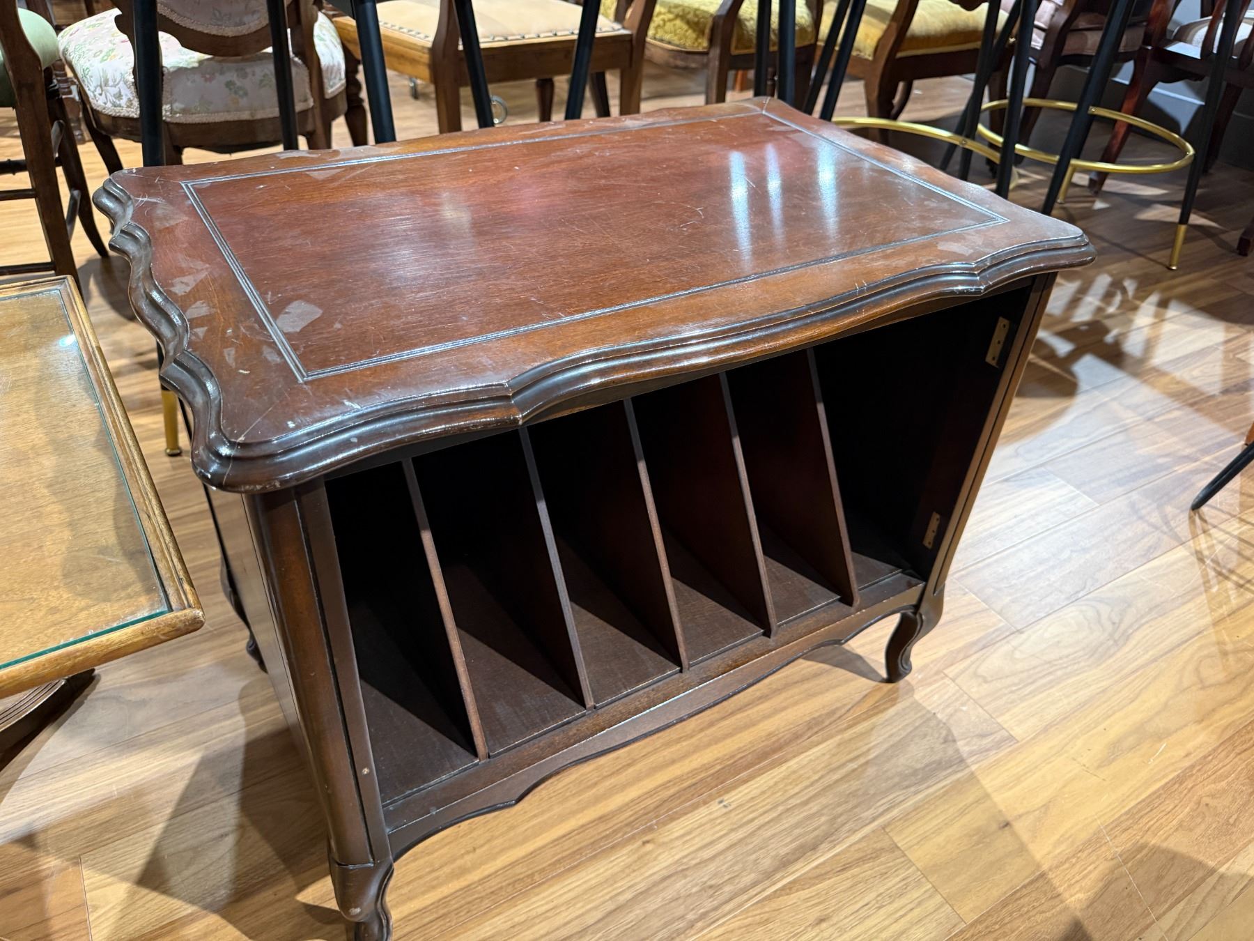Vintage mid-century wood record cabinet with approximate dimensions: Length 28-Inch, Width 17.5-Inch, Height 22.5-Inch. Features a design suitable for storing vinyl records or other items. Item is as pictured.