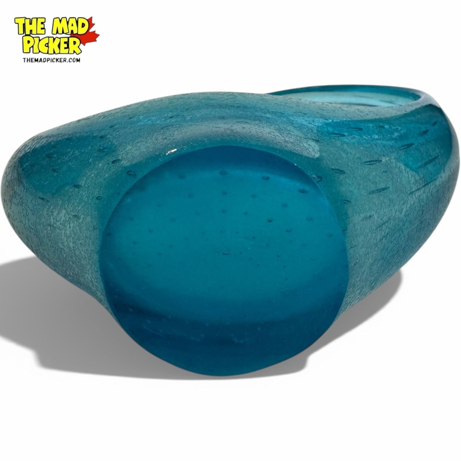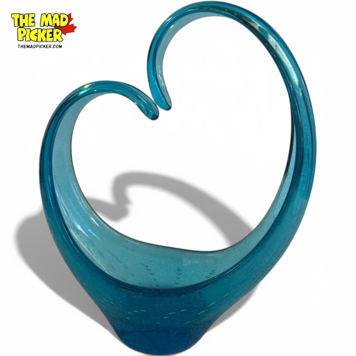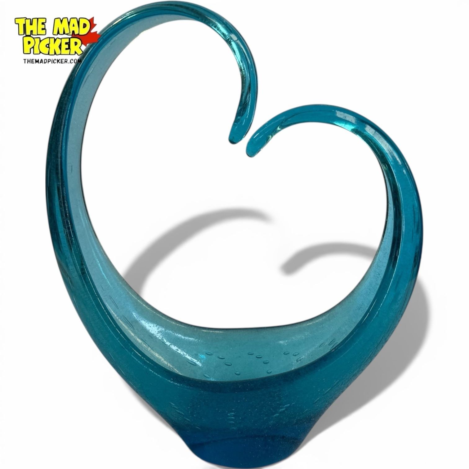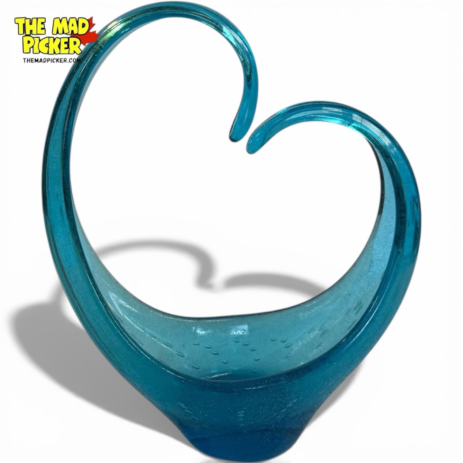 Vintage mid-century modern art glass bowl, vibrant blue, featuring a distinctive abstract, heart-like or swan shape. Includes a decorative bullicante (controlled bubble) pattern throughout. In the style of Murano or Canadian Alta Glass. Rough base finish characteristic of hand-crafting techniques.