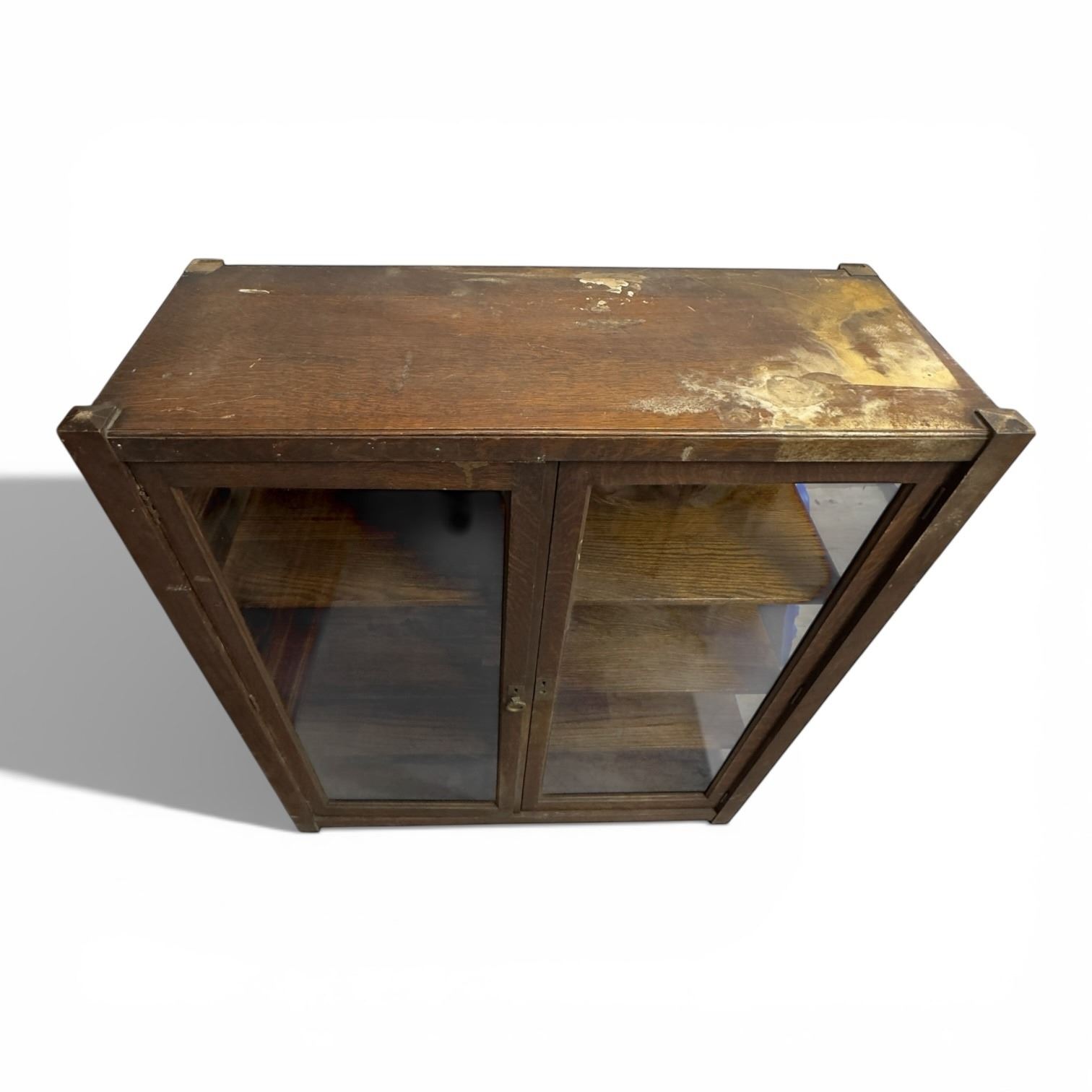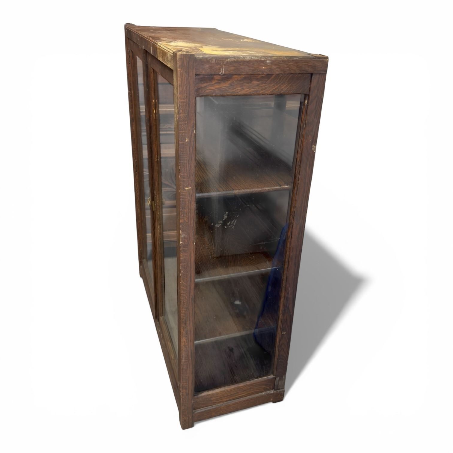 Vintage mission style cabinet featuring glass doors and 4 shelves. Dimensions are 40x15.5x49-Inch. Suitable for storage or display purposes. Item is as pictured.