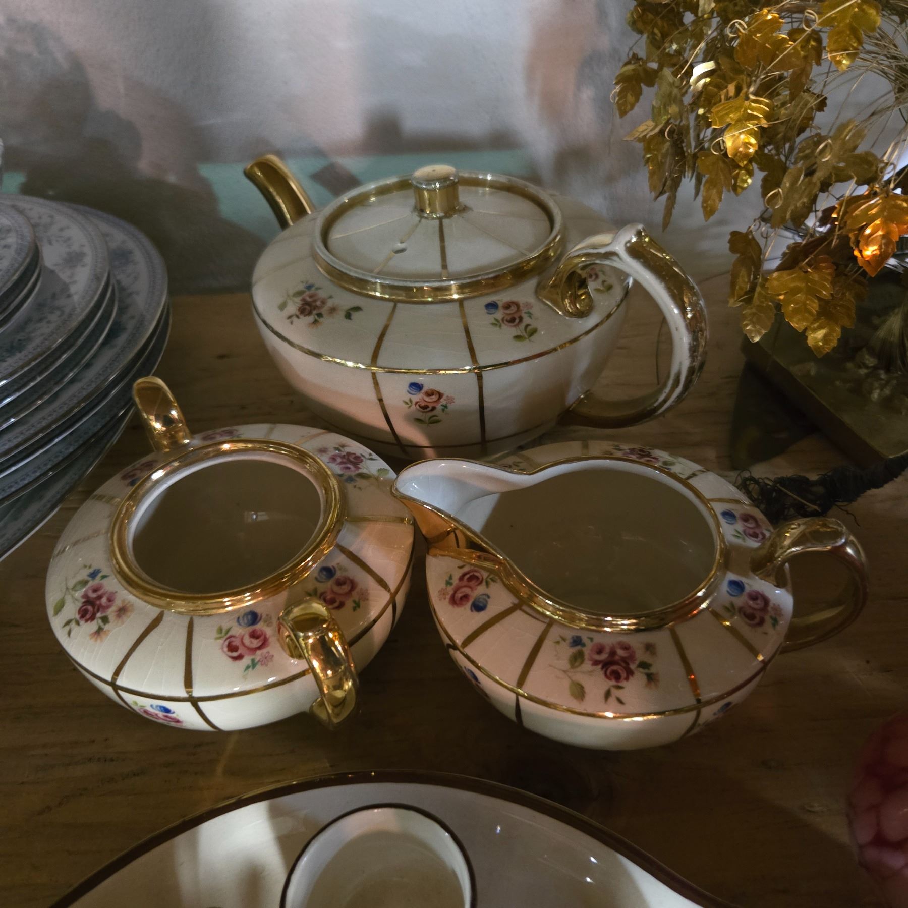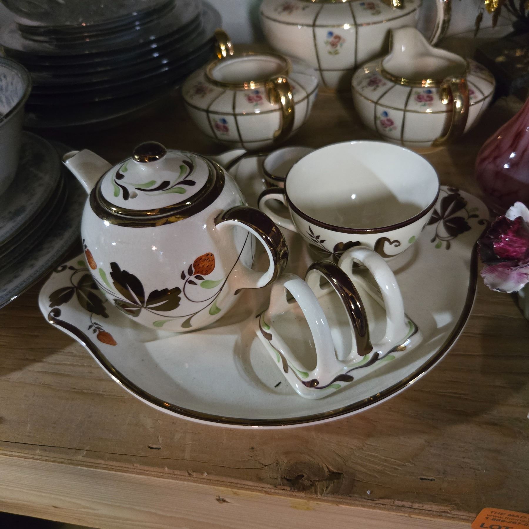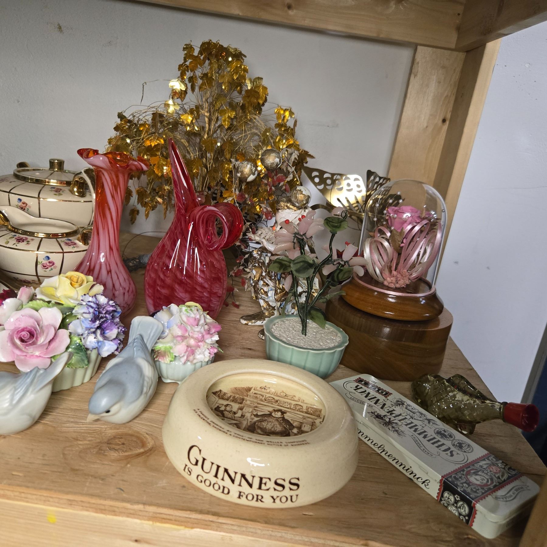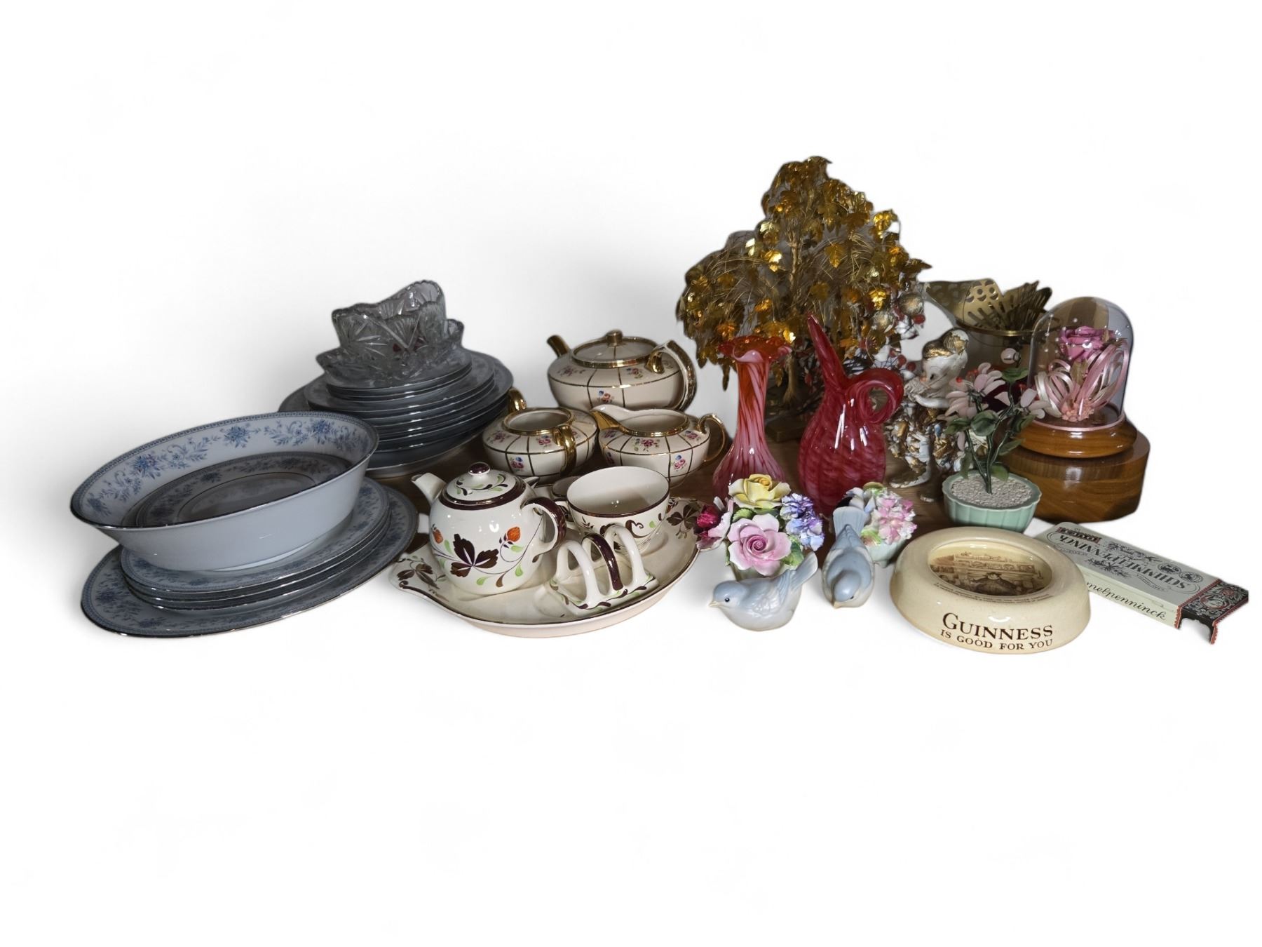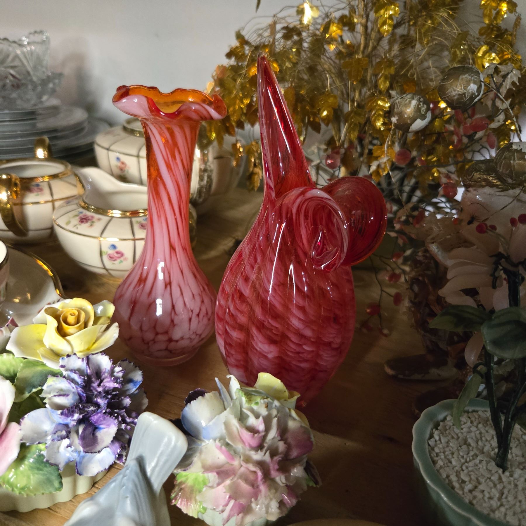 Vintage Mixed Lot - Pink Glass Vases, Floral Gilded Teaset, Porcelain Flowers, and More