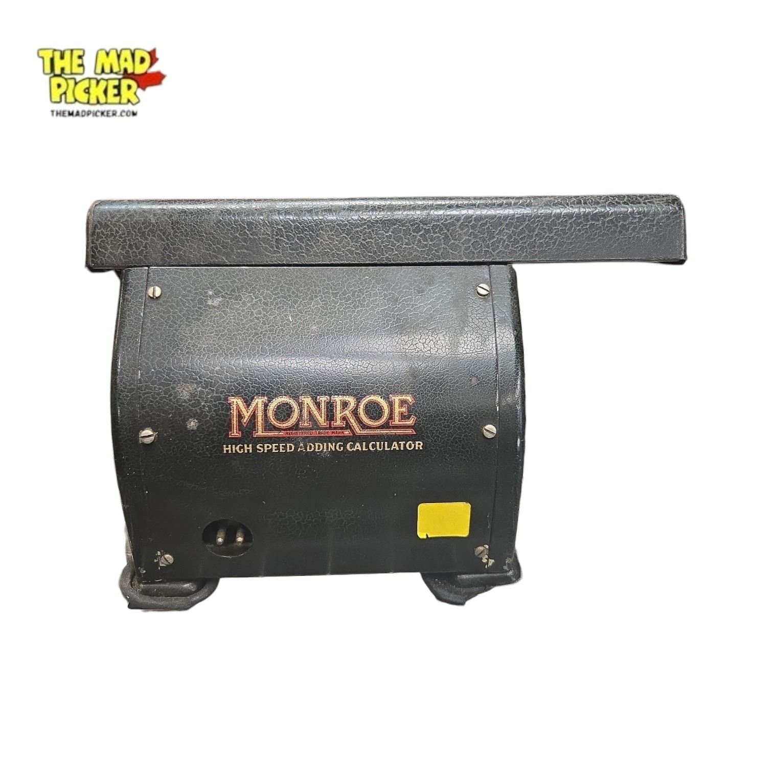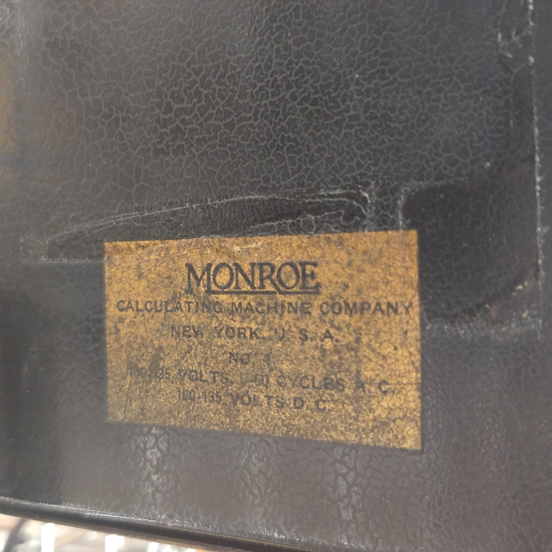Vintage Monroe mechanical adding machine by Monroe Calculating Machine Company, used from 1920s-1960s. Motor-driven, full-keyboard non-printing electric model with modified stepped drum mechanism. Performs addition, subtraction, multiplication, and division. Includes moving carriage display typical of its era.