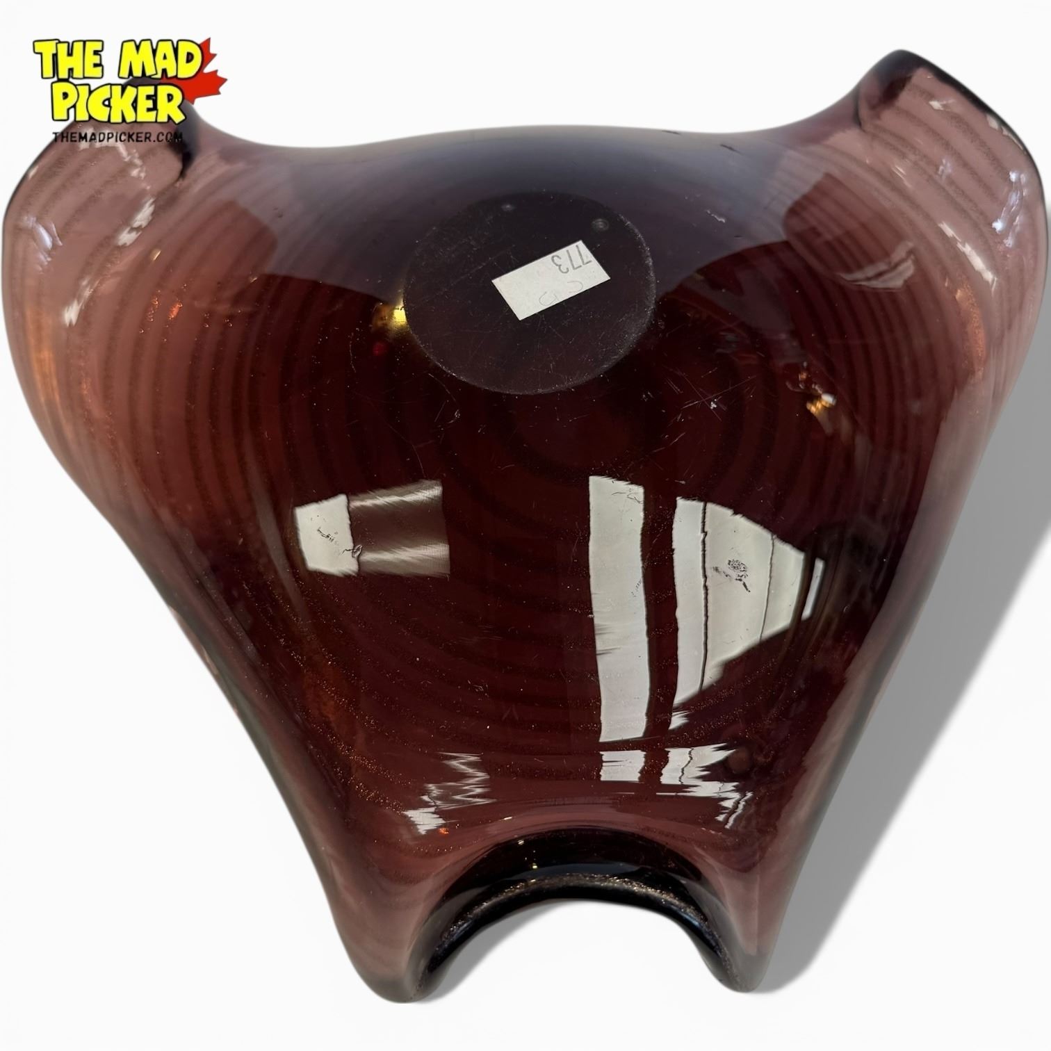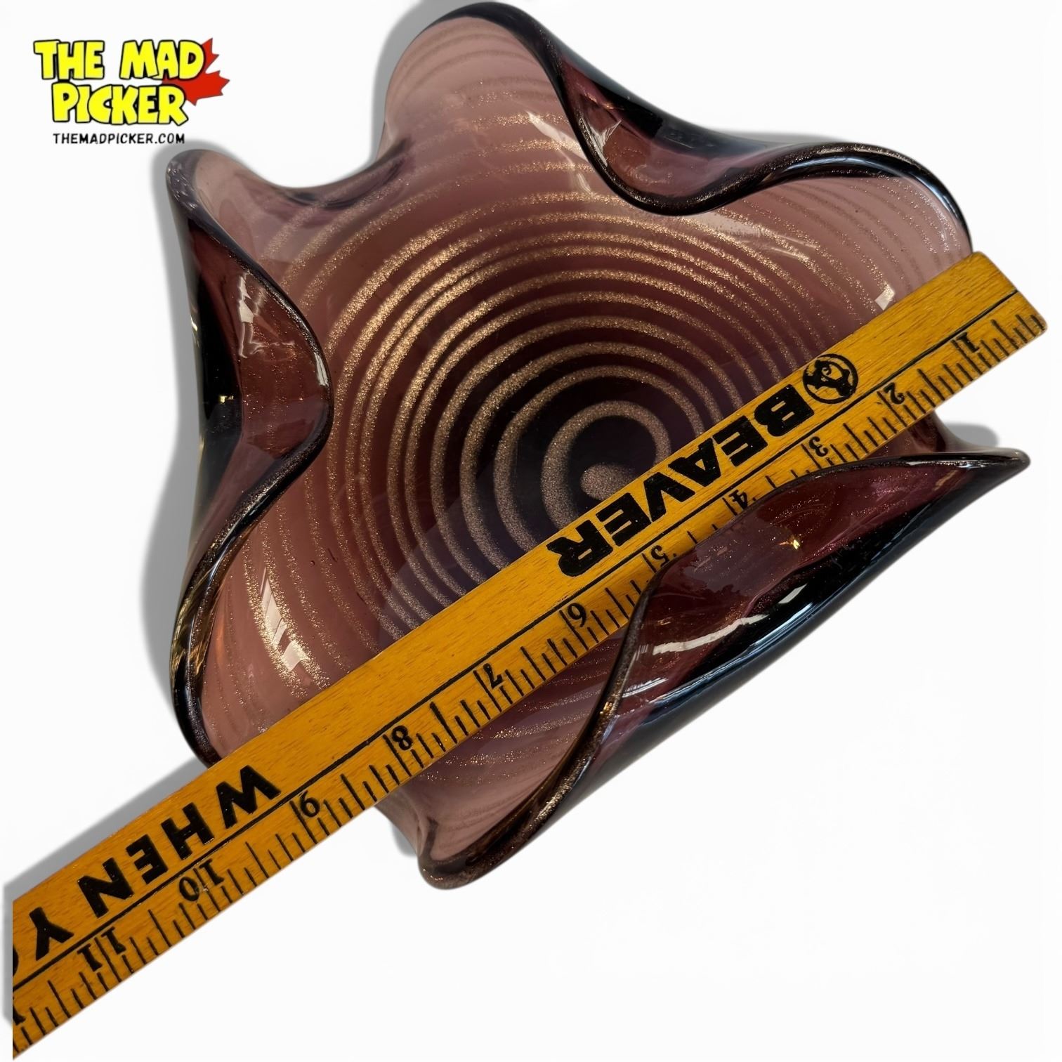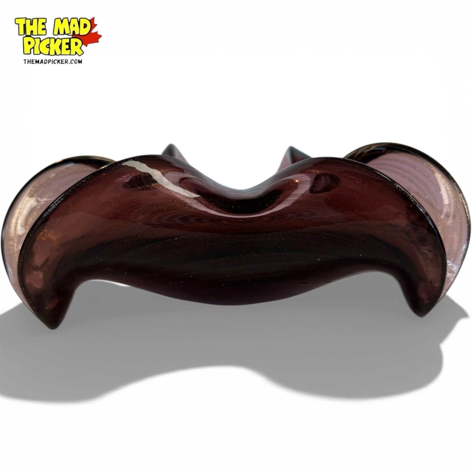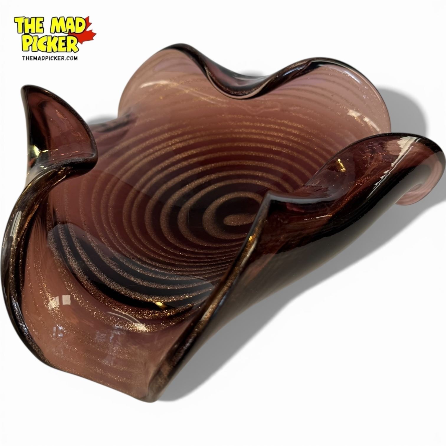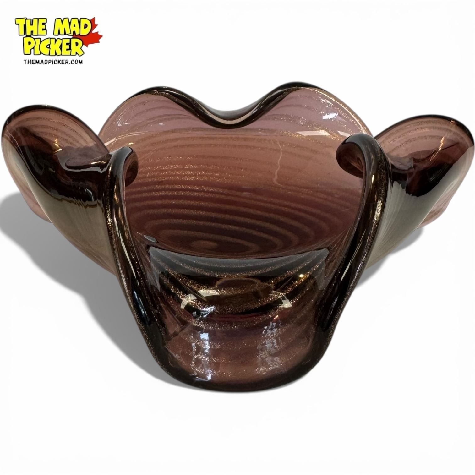 Vintage Murano art glass bowl in amethyst with gold flecks, hand-blown in mid-century modern style. Features wavy 'handkerchief' edge and spiral pattern at the base. Likely created in Murano, Italy, during the 1950s-1970s. Unsigned studio art glass, notable for its weight and craftsmanship.
