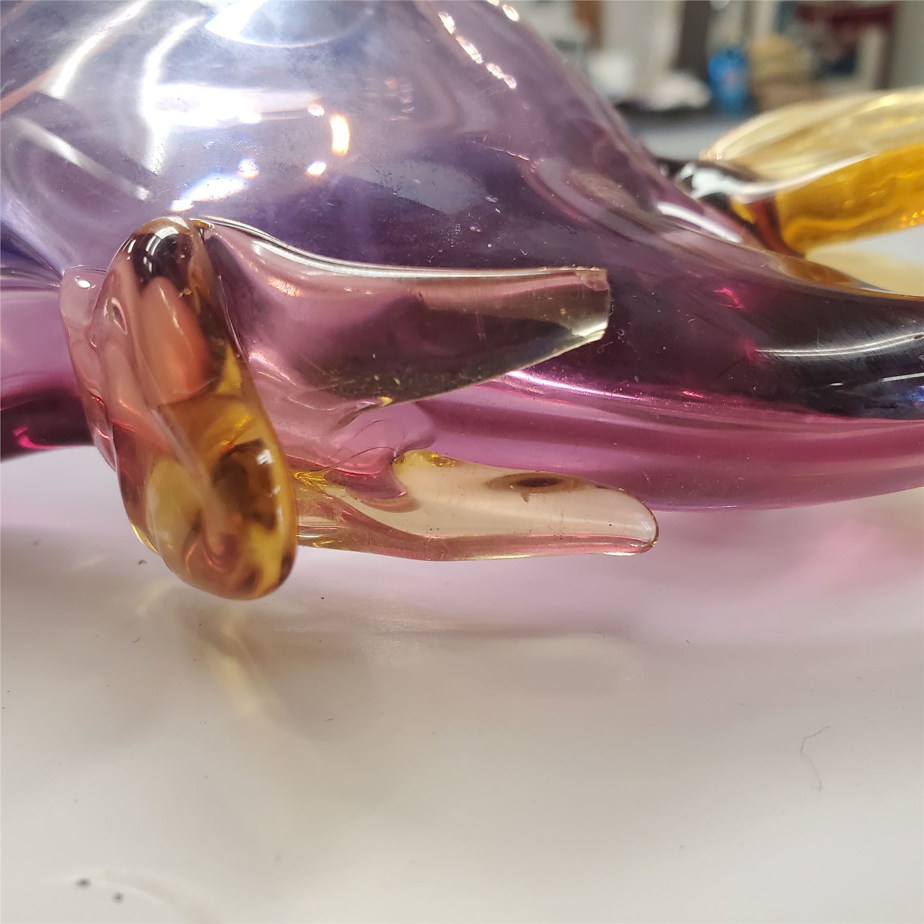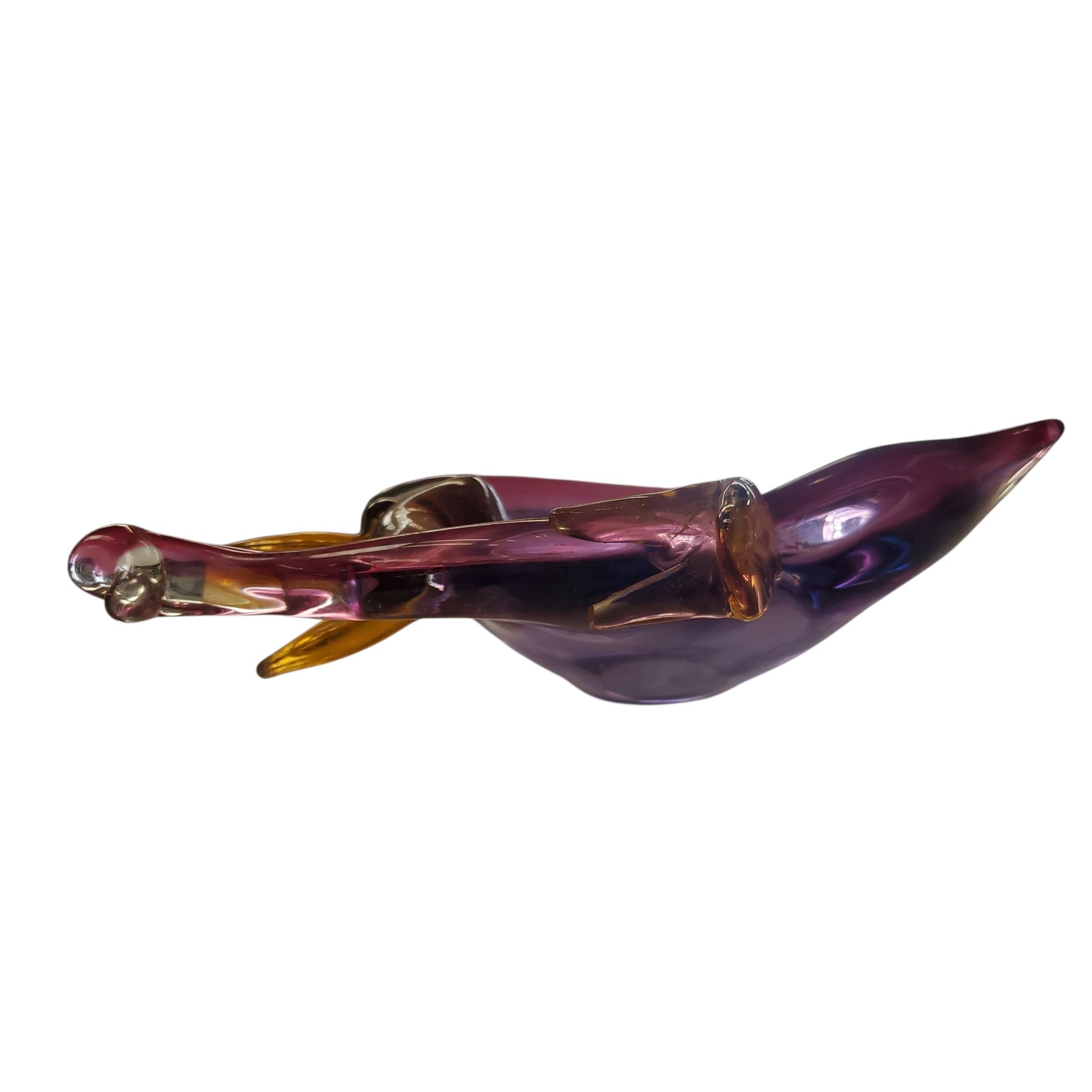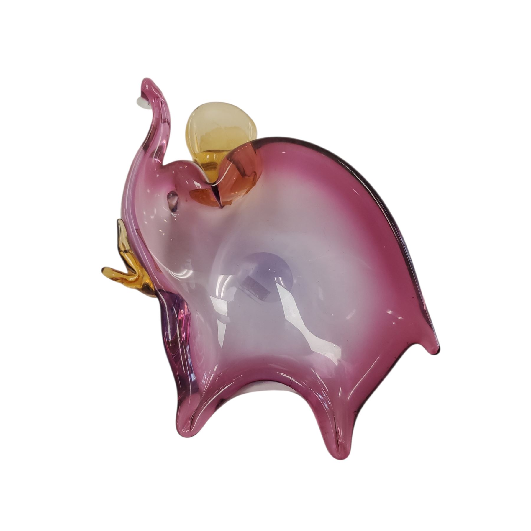 Vintage Murano Style art glass bon bon dish, 9.5 inches long. Handmade in Murano, Italy, mid-century. Features a stylized elephant form with a raised trunk. Crafted using polychrome techniques, often with vibrant cranberry or pink hues, clear details, and amber accents. Similar to makers like Seguso. Unsigned