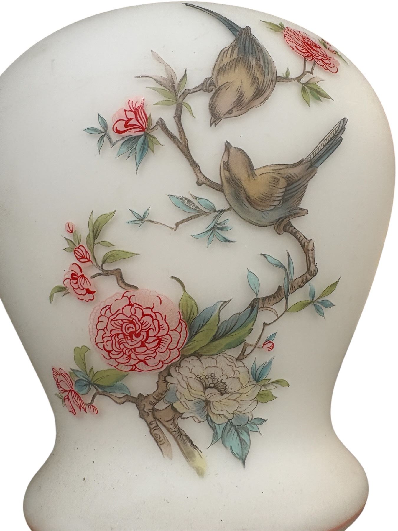 Vintage Norleans hand painted hanging lamp in an Italian style, mid-20th century. Features detailed scenes of birds perched on flowering branches. Made of ceramic or similar material, with intricate craftsmanship and vibrant coloration typical of Norleans' mid-century designs. Includes original hanging hardware.