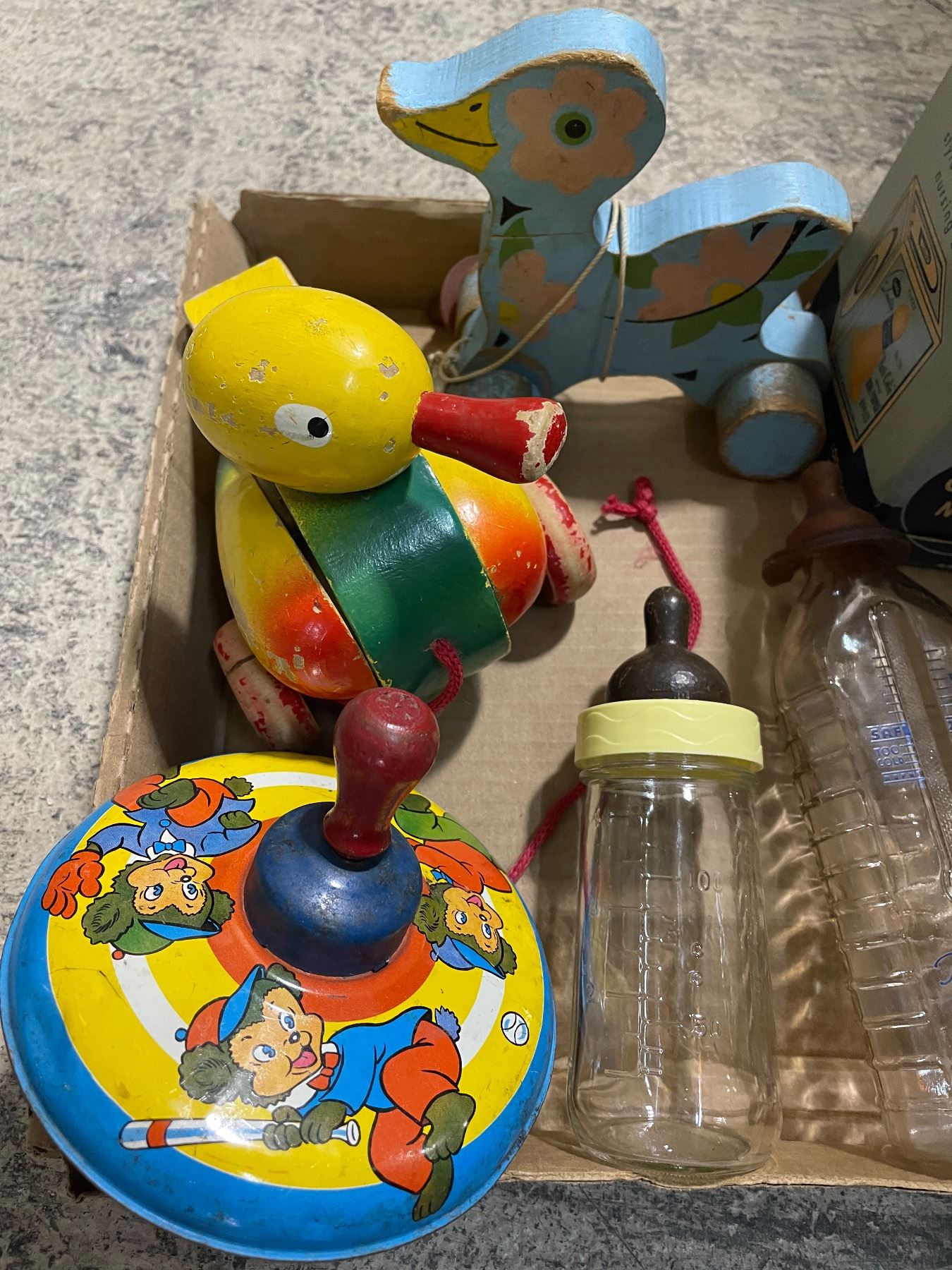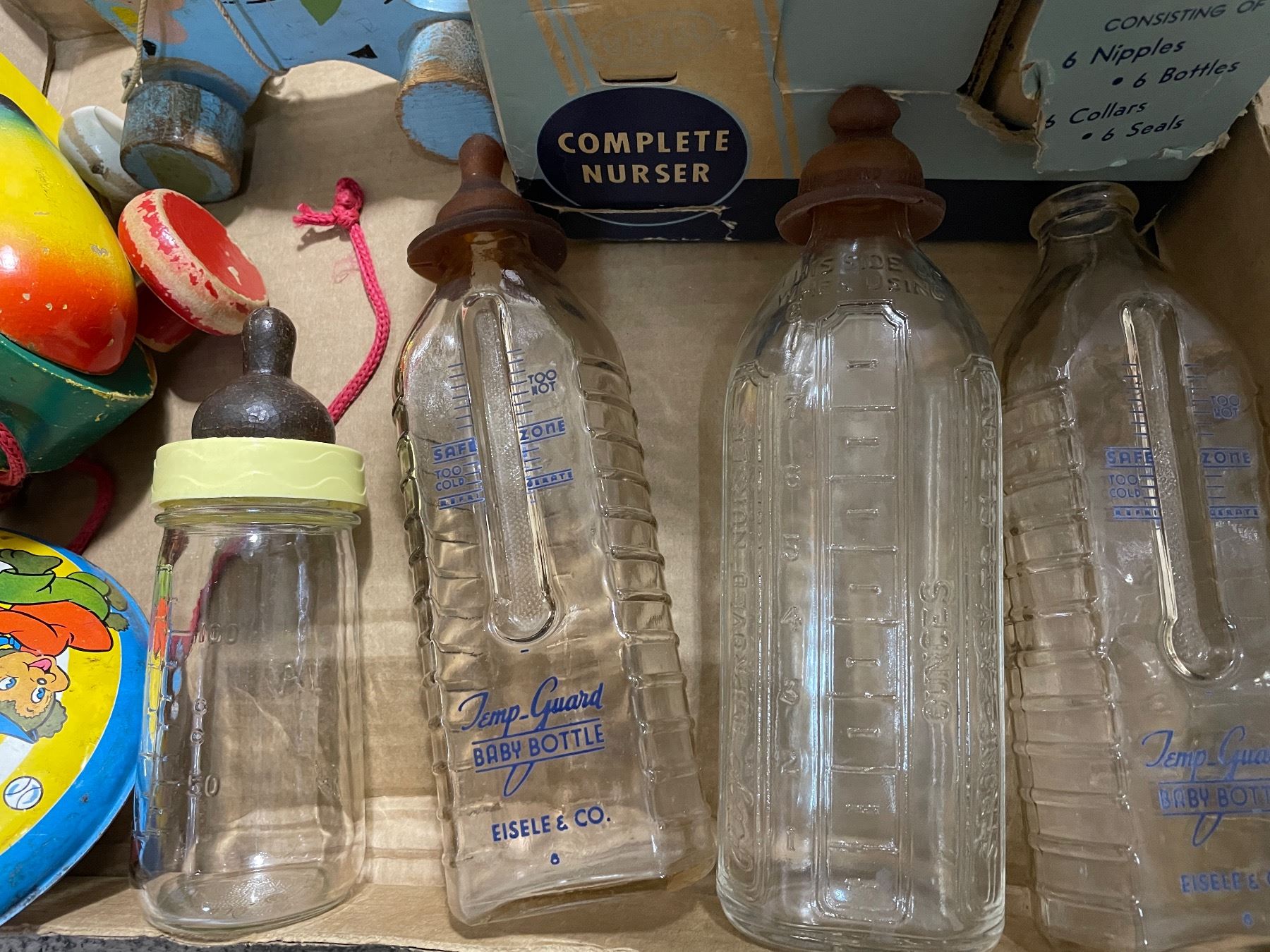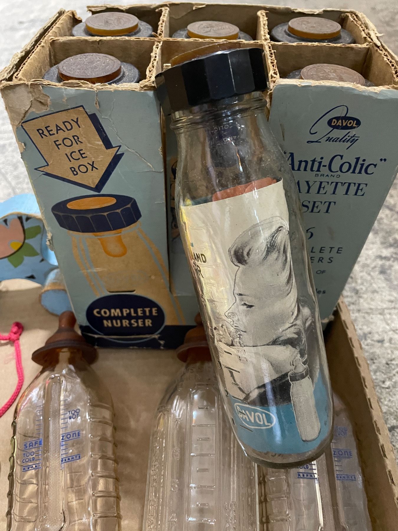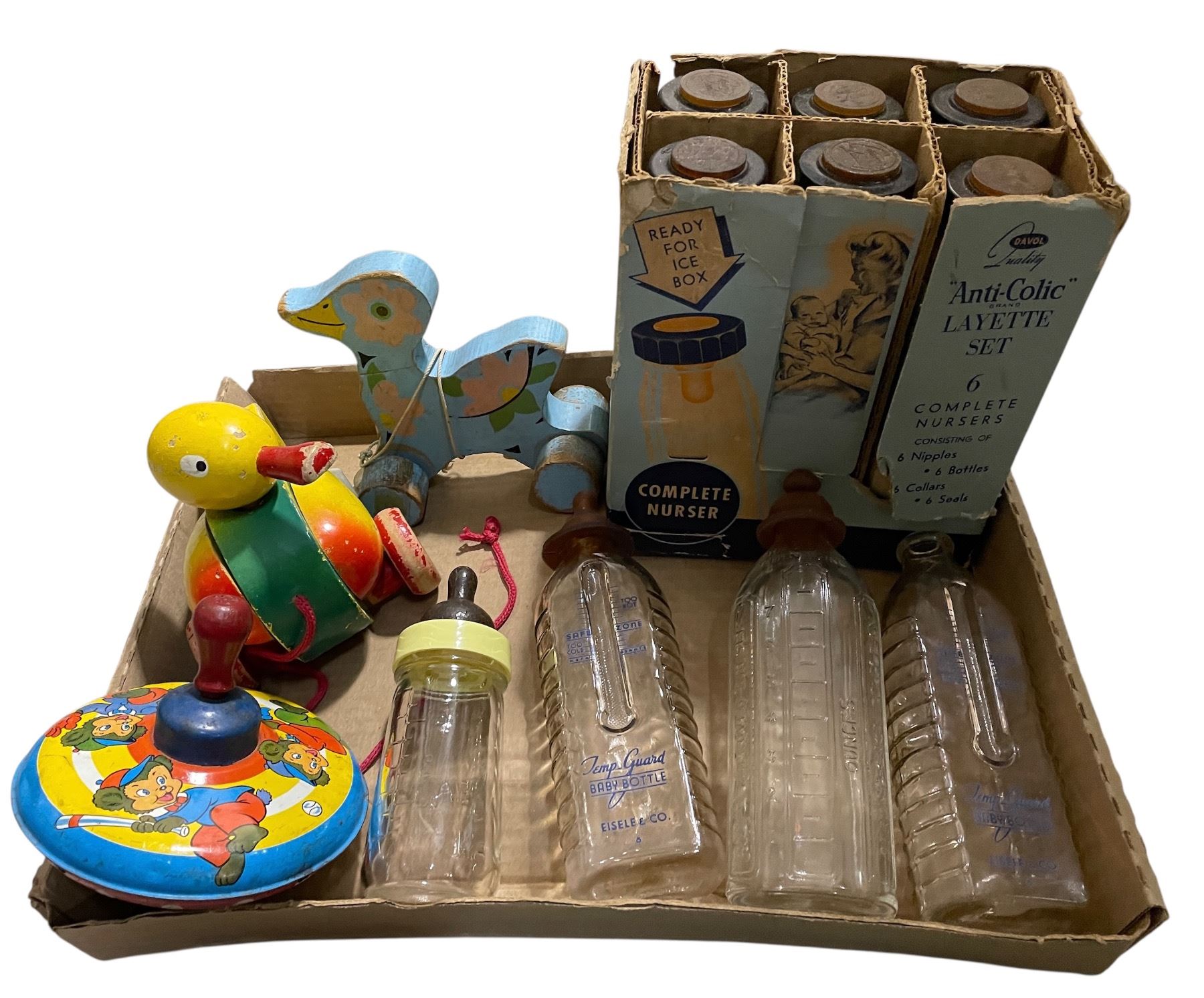 Vintage Nursery Items - Davol Anti-Colic Baby Bottles, Pull Toys, and More