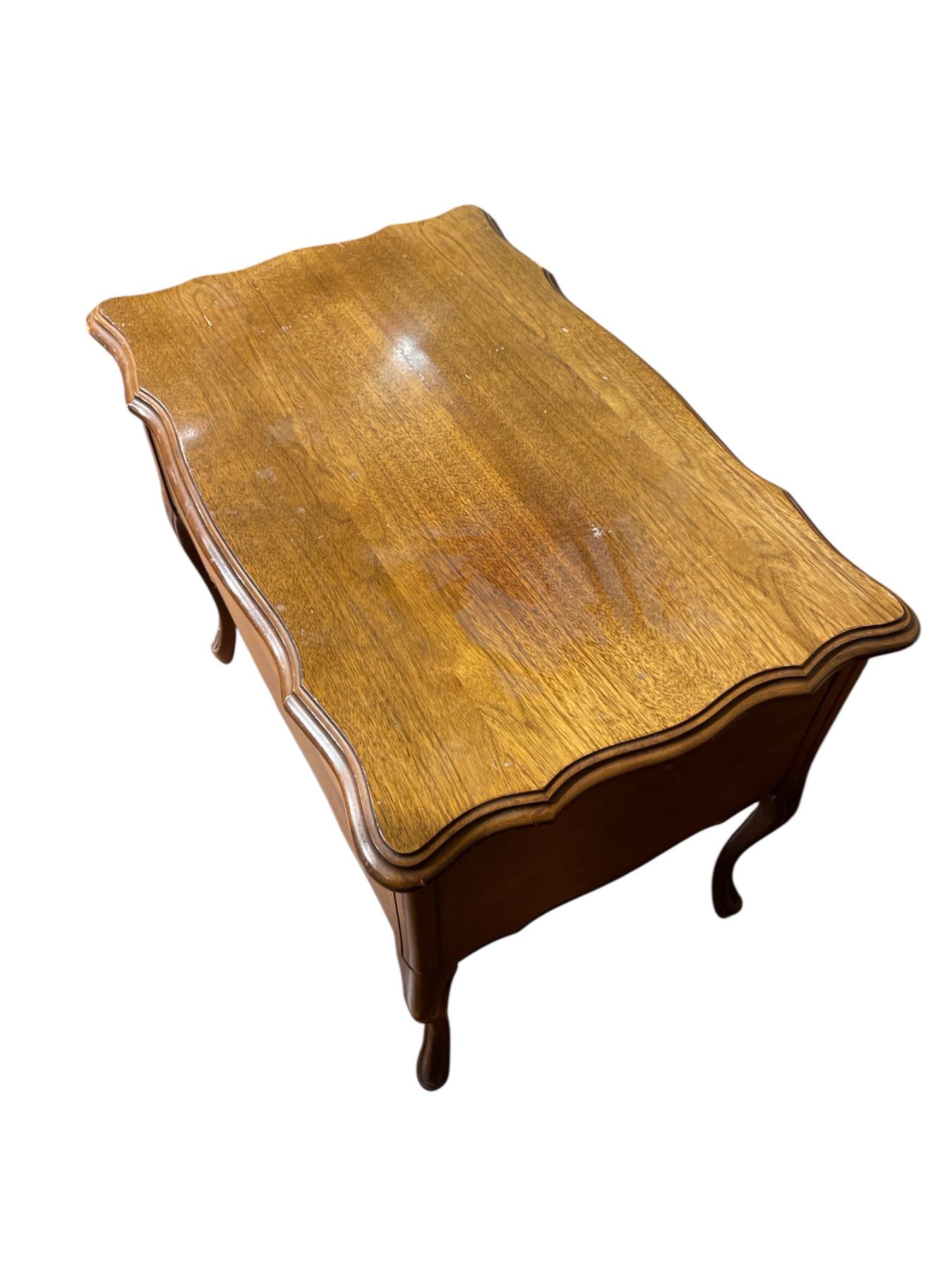 Vintage oak end table with dimensions of 28-Inch length, 18-Inch width, and 22.5-Inch height. Crafted from solid oak wood, this piece features a classic design suitable for various interior styles. Item is as pictured.