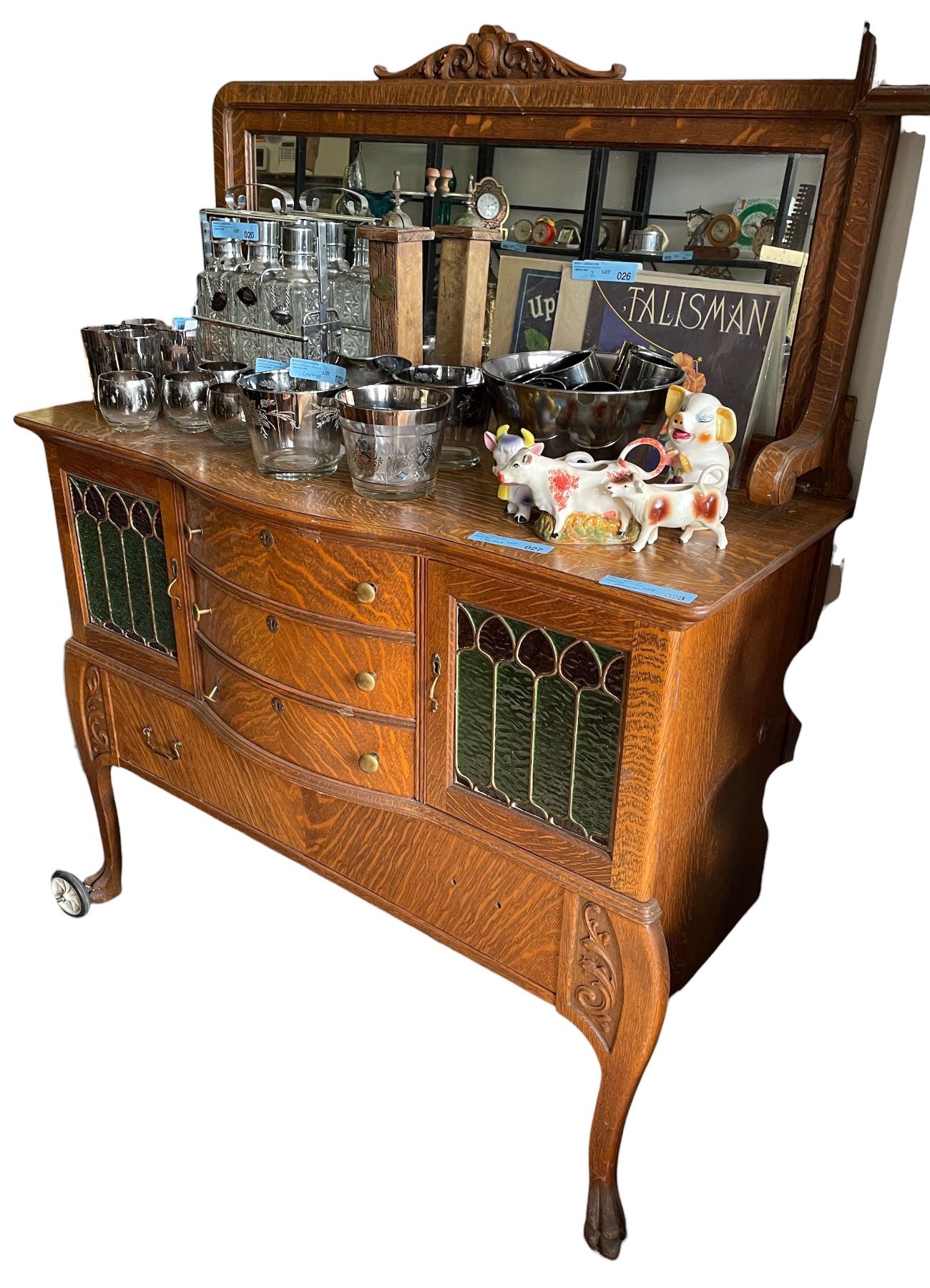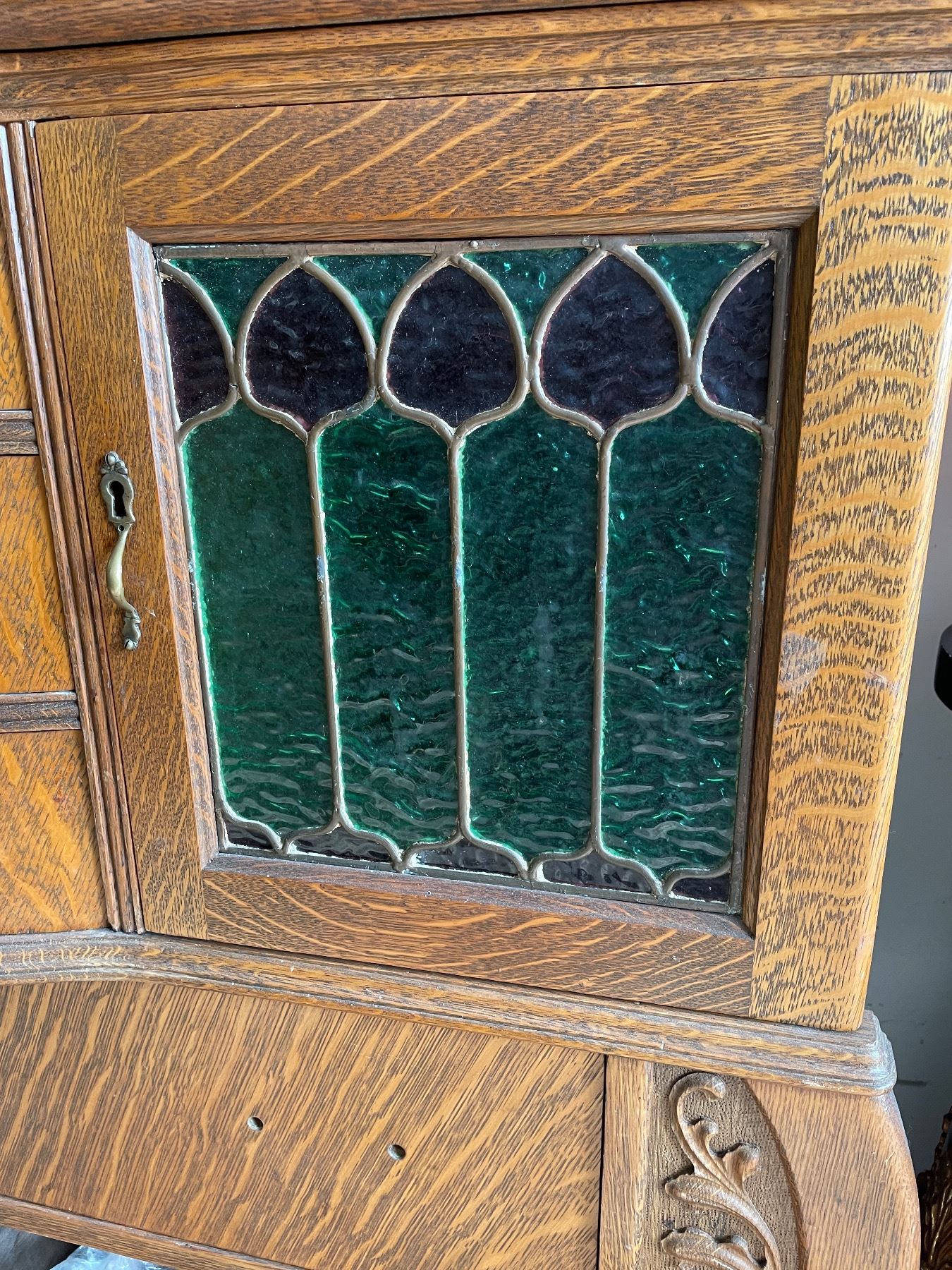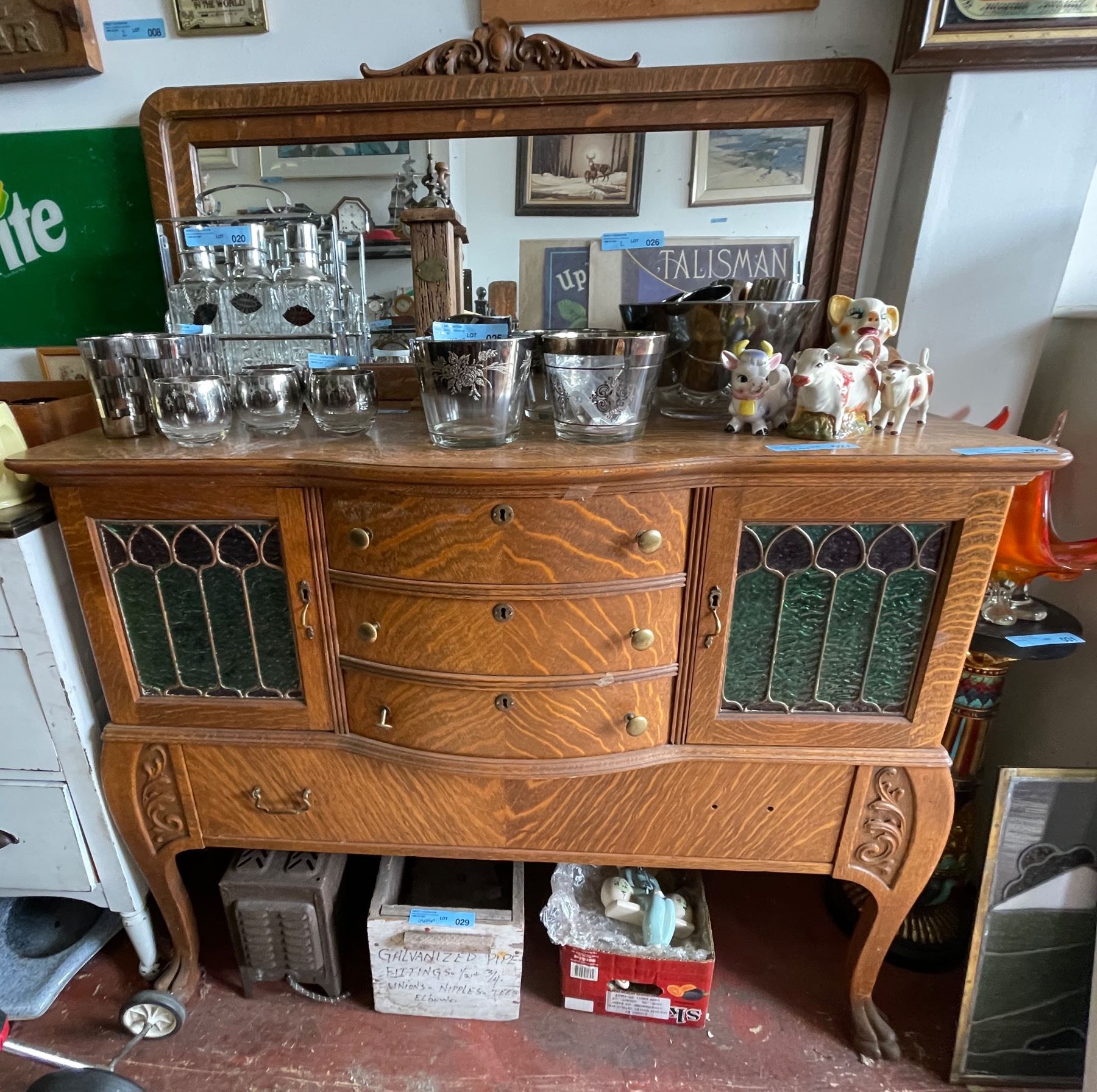 Vintage Oak Sideboard Buffet with Leaded Glass Doors & Mirror