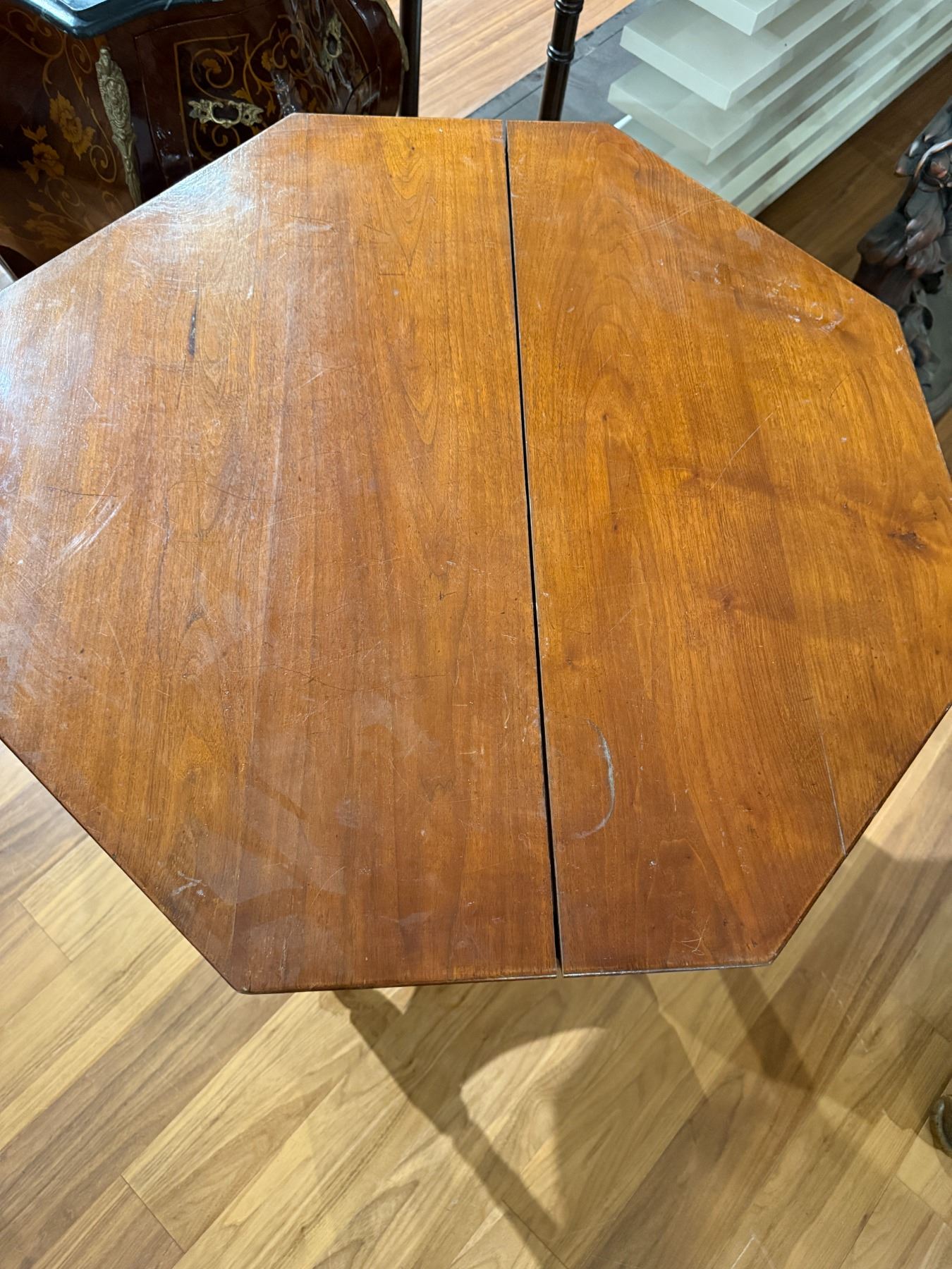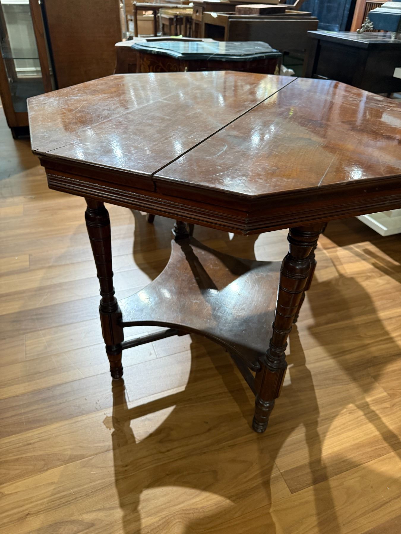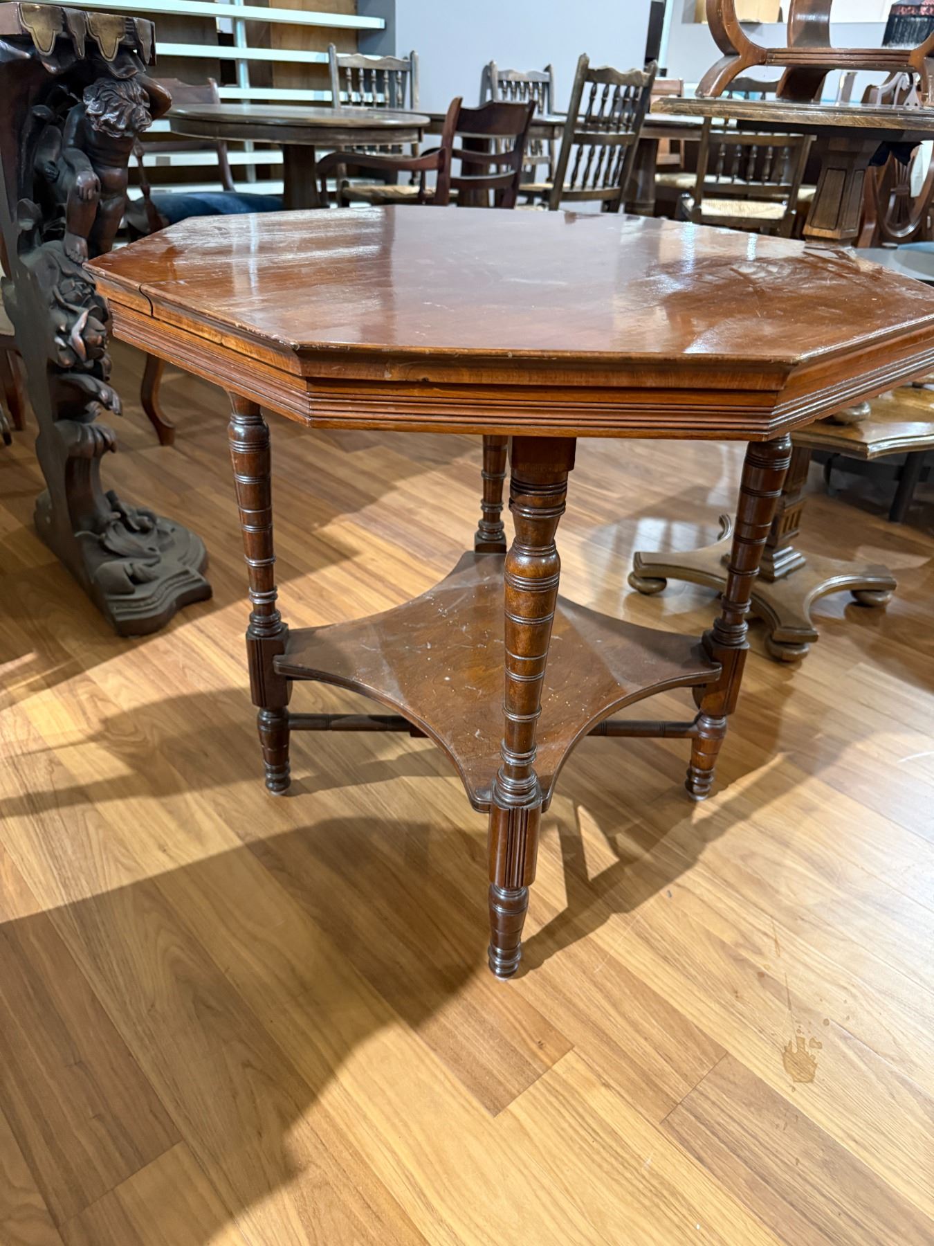 Vintage octagon-shaped two-tiered wood table featuring a distinctive geometric design. The table measures 30-Inch in length and 28-Inch in height. Built with two tiers offering functional storage or display space. Constructed in wood with visible grain. Item is as pictured.