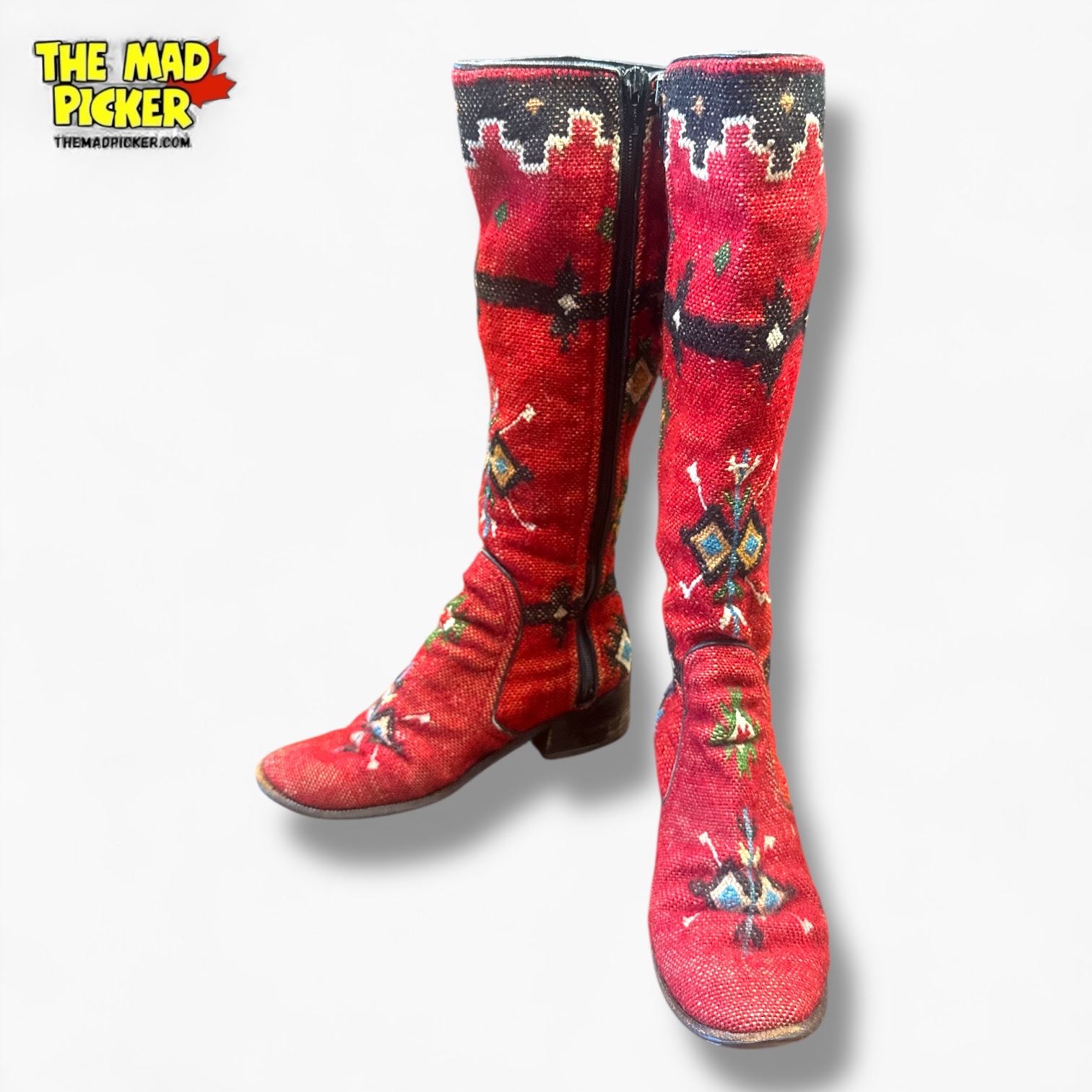 Vintage Pair of Jerry Edouard Red Kilim Tapestry Embroidered Knee High Boots Size 6 1/2 B