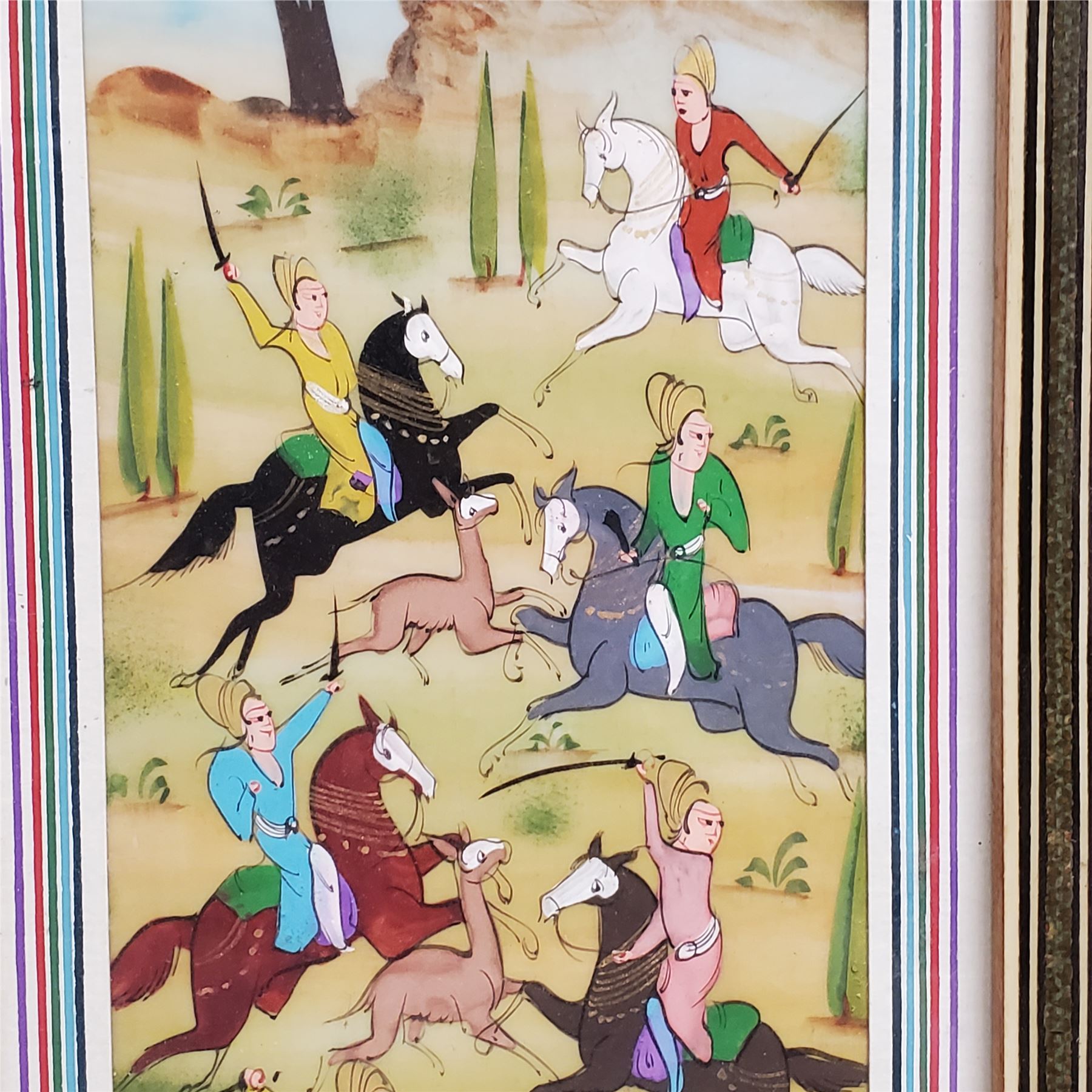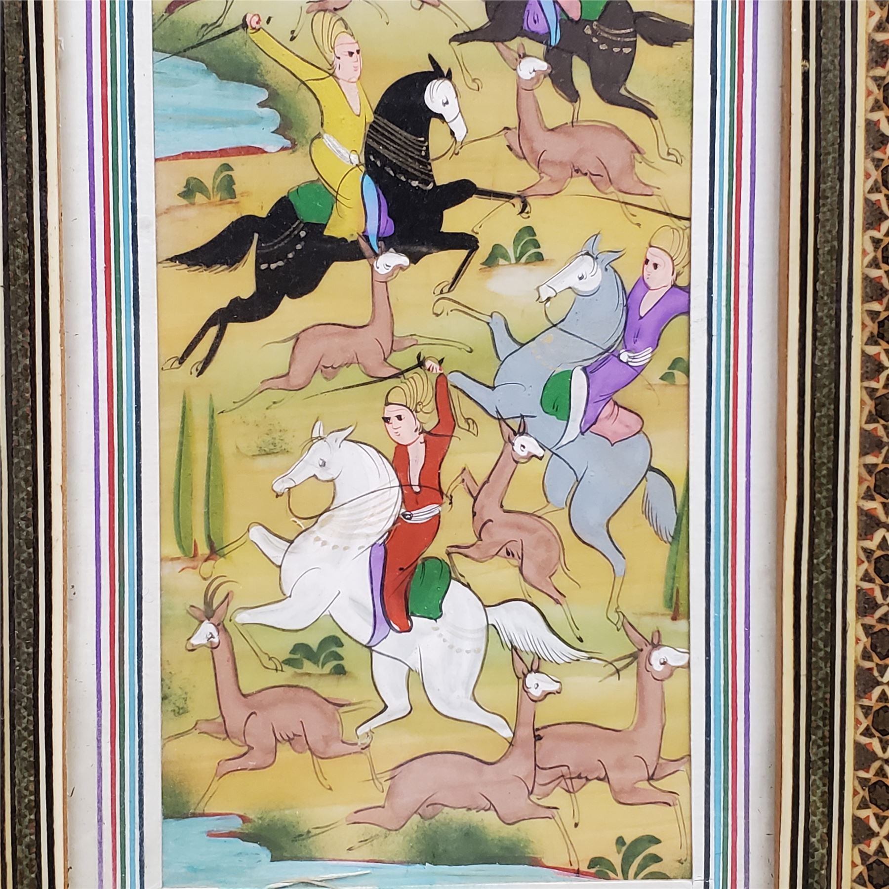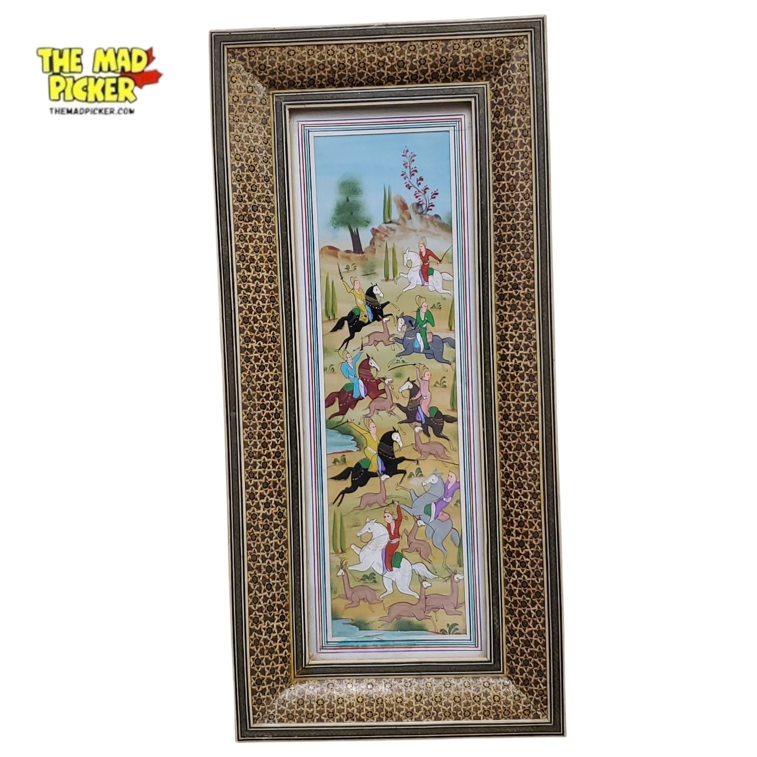 Handcrafted Persian miniature wall art depicting a combined hunting and war scene. Features intricate traditional Persian painting on a Khatam marquetry frame, measuring 8.5 x 18.5 inches. Originating from Iran, this piece highlights detailed figural and landscape artistry.