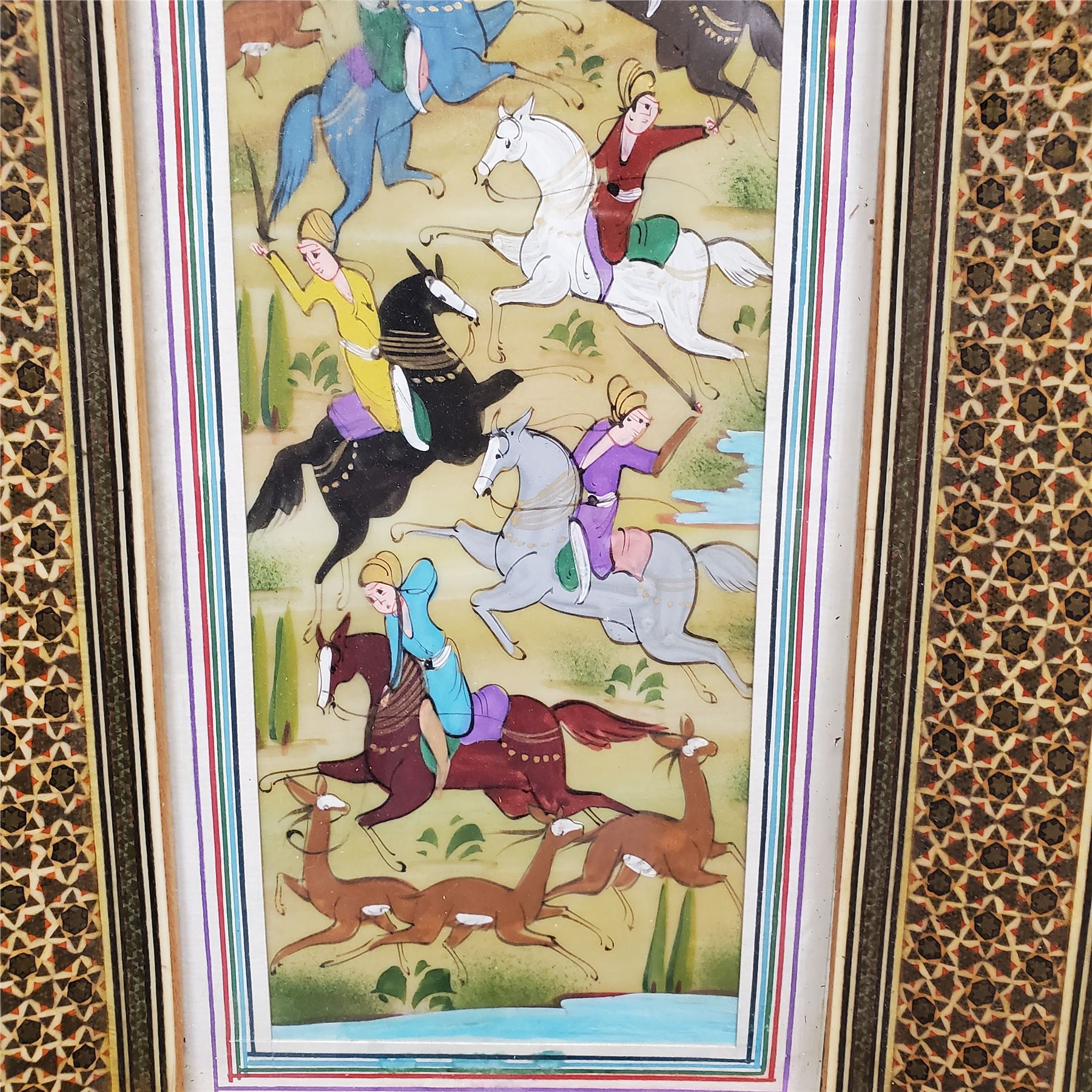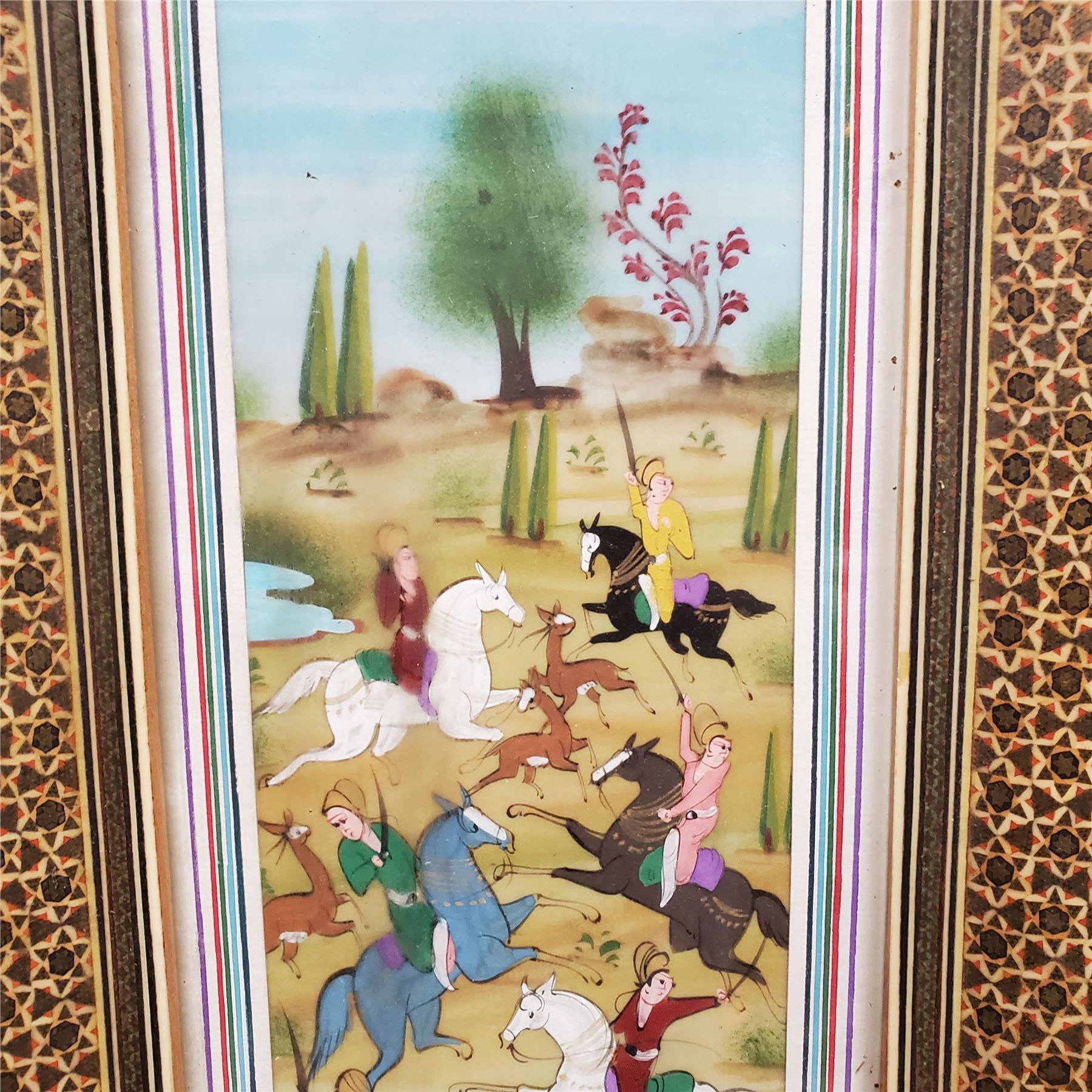 Vintage Persian miniature artwork depicting hunting and war scenes, set in a handcrafted Khatam frame. The piece features intricate traditional Persian motifs and measures 8.5 x 18.5 inches. Made in Iran, exemplary of Persian craftsmanship combining artistry and meticulous inlay work.